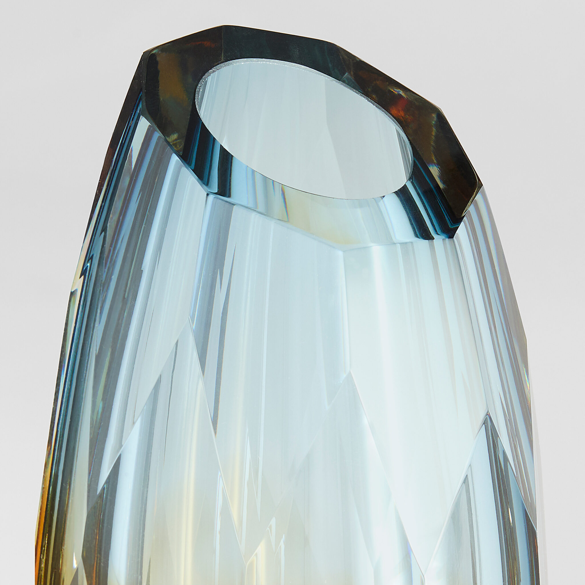 The Alba Vase, handblown from cased art glass, features a vibrant mix of blue, amber, and orange hues that bring a bold touch to any decor. Available in two distinct shapes and sizes, this eye-catching piece offers versatile styling options for a unique and dynamic display.