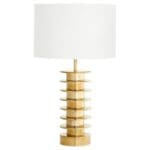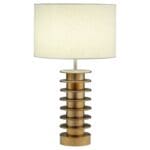 The Alessio table lamp features interspersed brass finished disks on a spun steel base that create a showstopping banded display of modern appeal. The striking body of the lamp is juxtaposed by an attractively simple white linen shade that provides a harmonious balance to its overall composition.