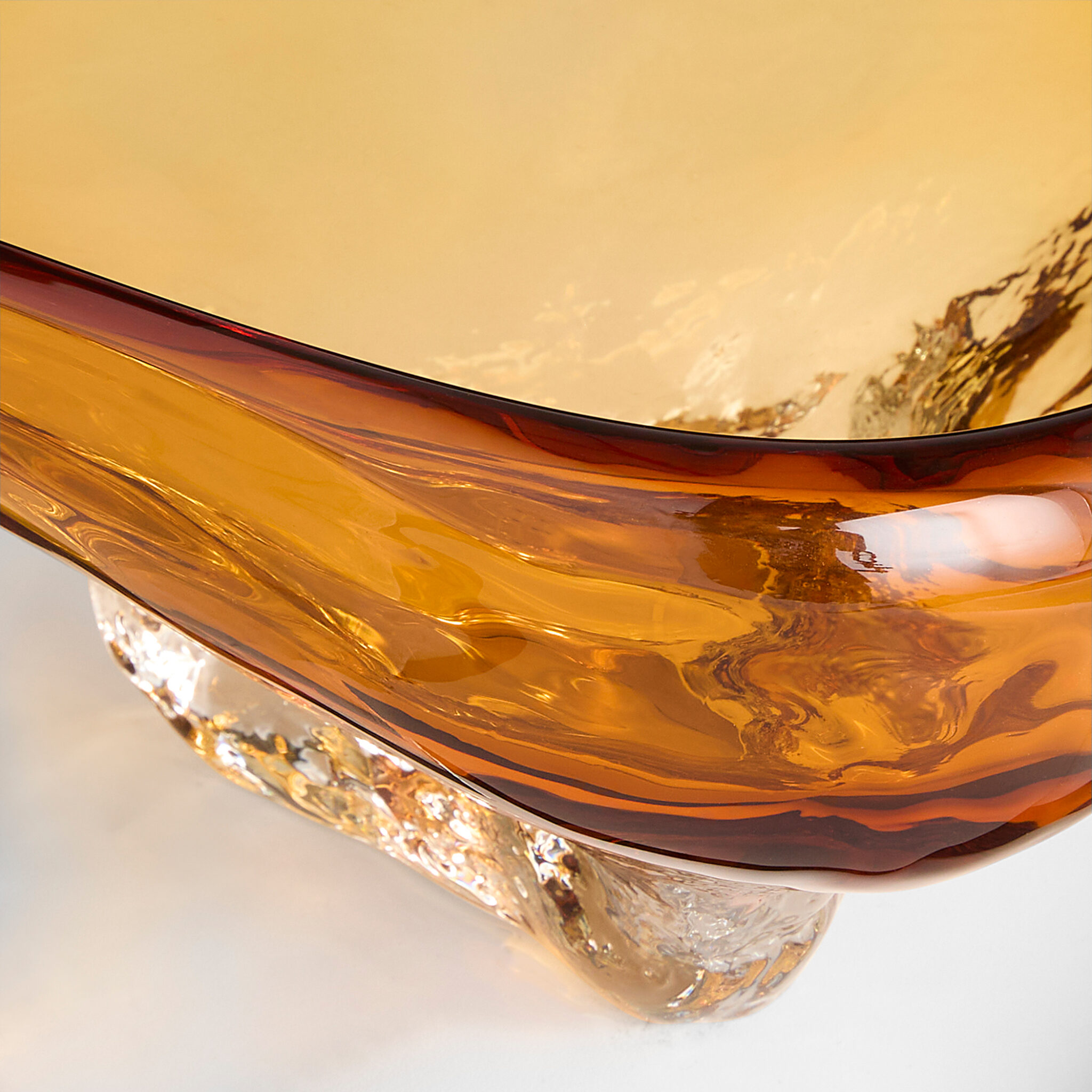 The Alistair Bowl, handblown in warm amber molten glass brings artisanal elegance to any space. Available in three sizes, it can be paired together for a layered look or displayed separately as a striking decorative piece.