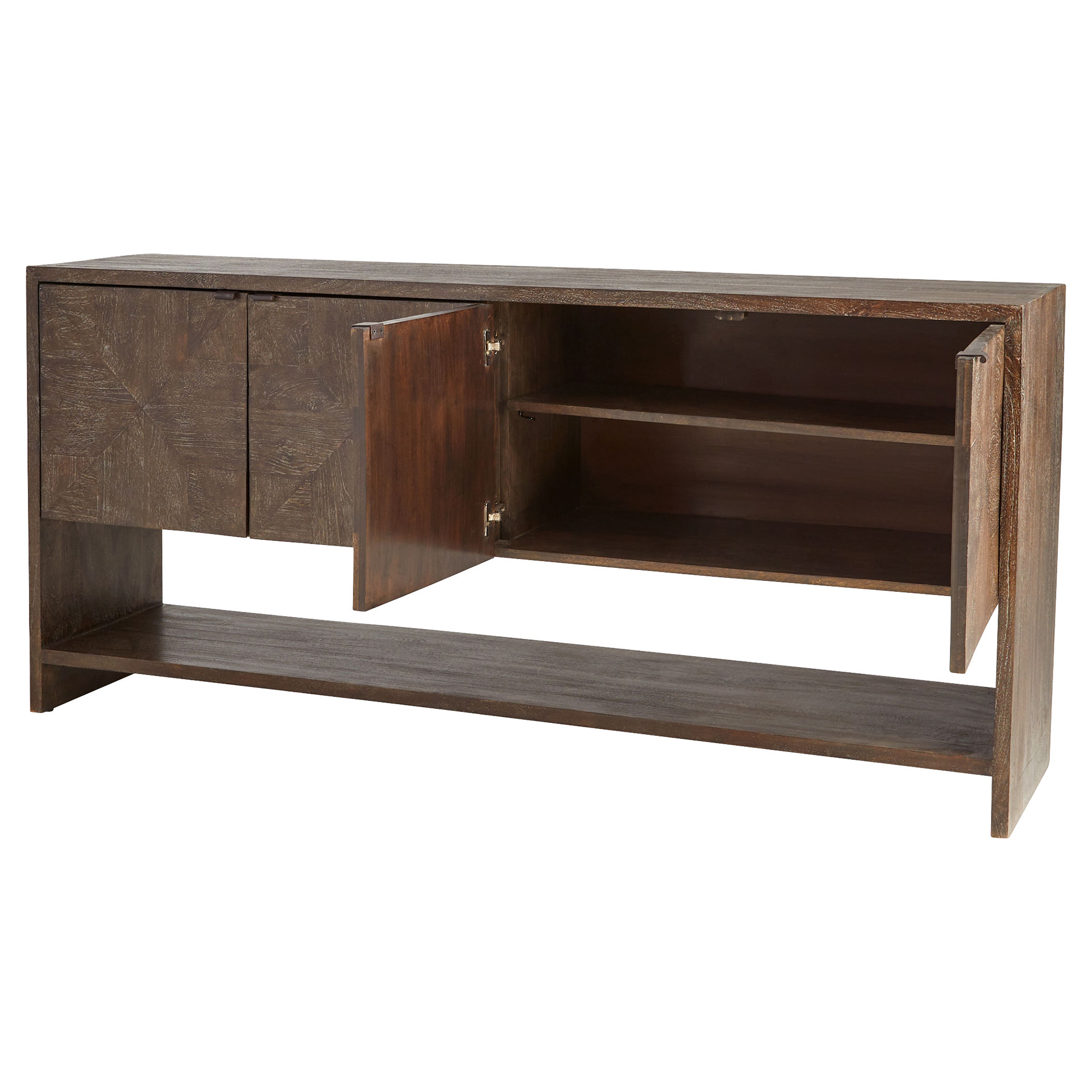 - Heavily Cerused Mango Wood | Mitered Center Top | One Adjustable Shelve Per Section | Adjustable Hinges| Exposed Lower Shelf
