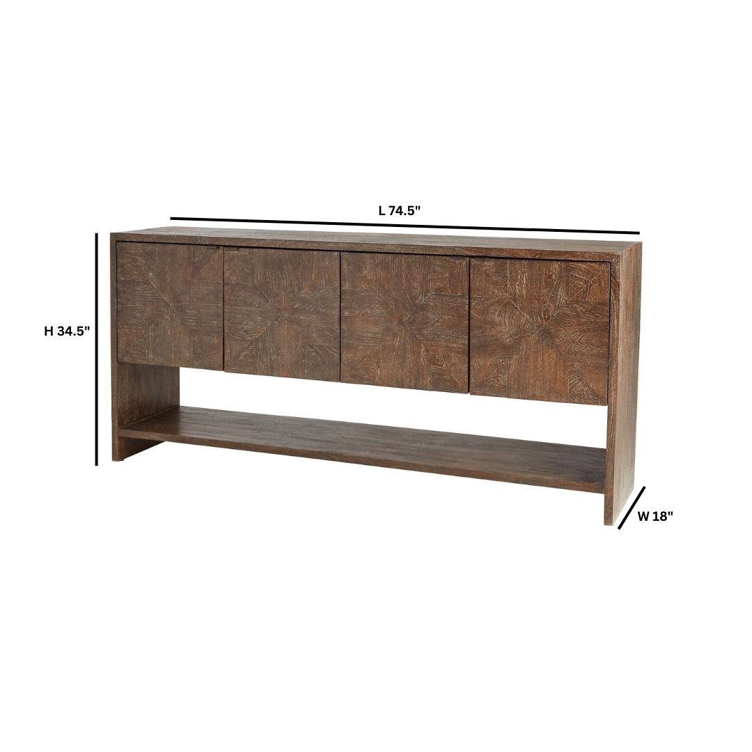 The Alta console table is a striking testament to the beauty of heavily cerused mango wood. This exquisite wood finish unveils the intricate grain of the cerused walnut finished wood, creating an alluring and captivating aesthetic. The vertical side panels, which seamlessly wrap around to the console’s top and meet at the precisely mitered center, exhibit meticulous attention to detail and exceptional craftsmanship. The exposed lower shelf offers ample space for storage, ensuring that this piece not only adds beauty to your space but also serves a practical purpose.