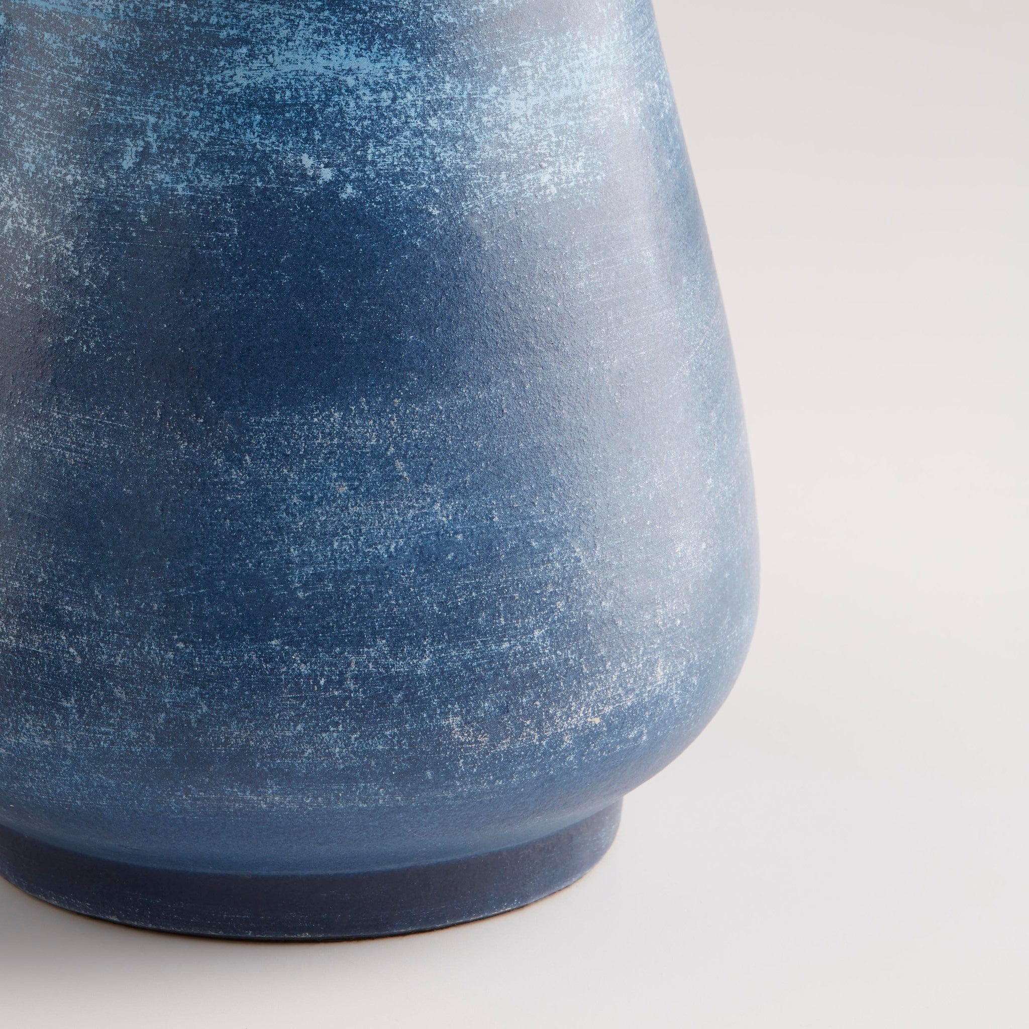The vibrant blue rubbed ombre finish on the Amarna collection of handmade earthenware vases accentuates its signature cone shape. Etched horizontal grooves are carved mid-height, adding a layer of texture to the smooth wash-like finish. Display together or individually in any poolside covered patio design, kitchen, entryway or washroom. Available in two sizes. Not water-tight.