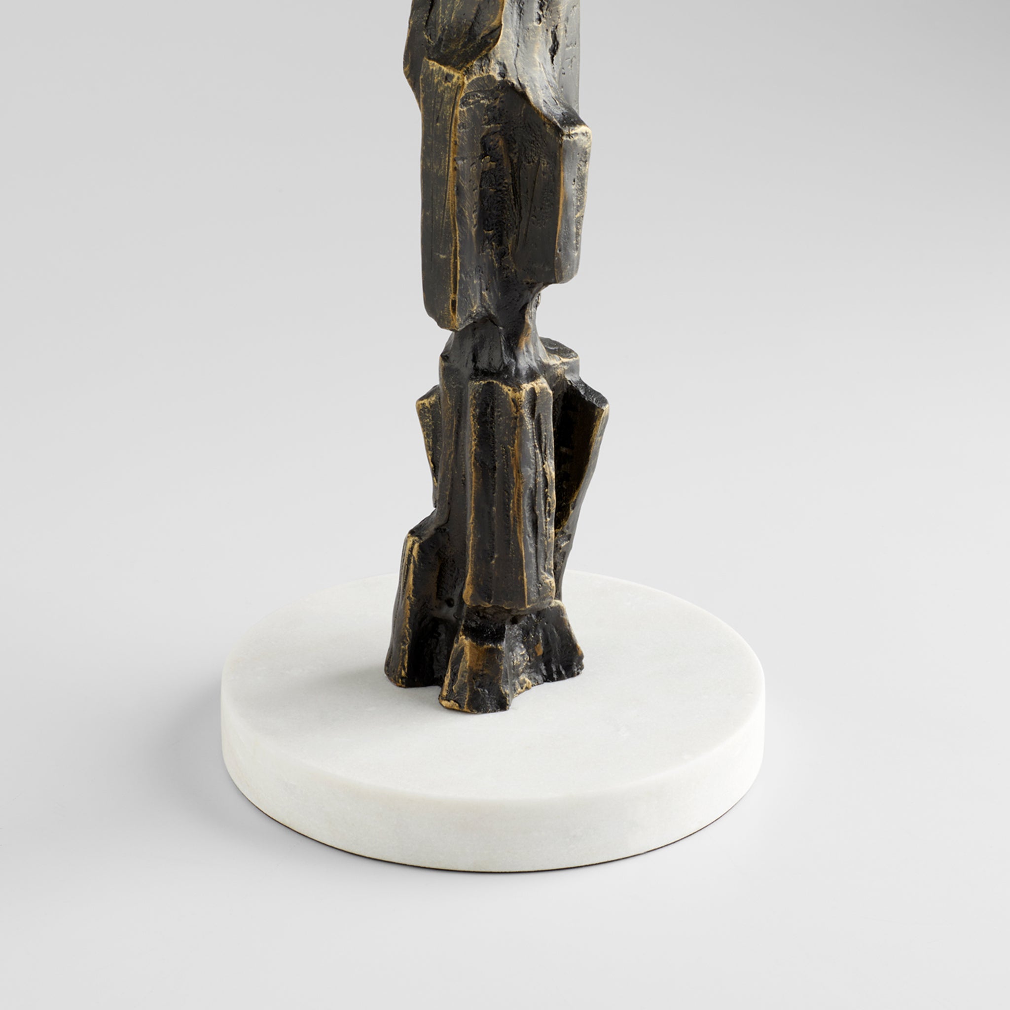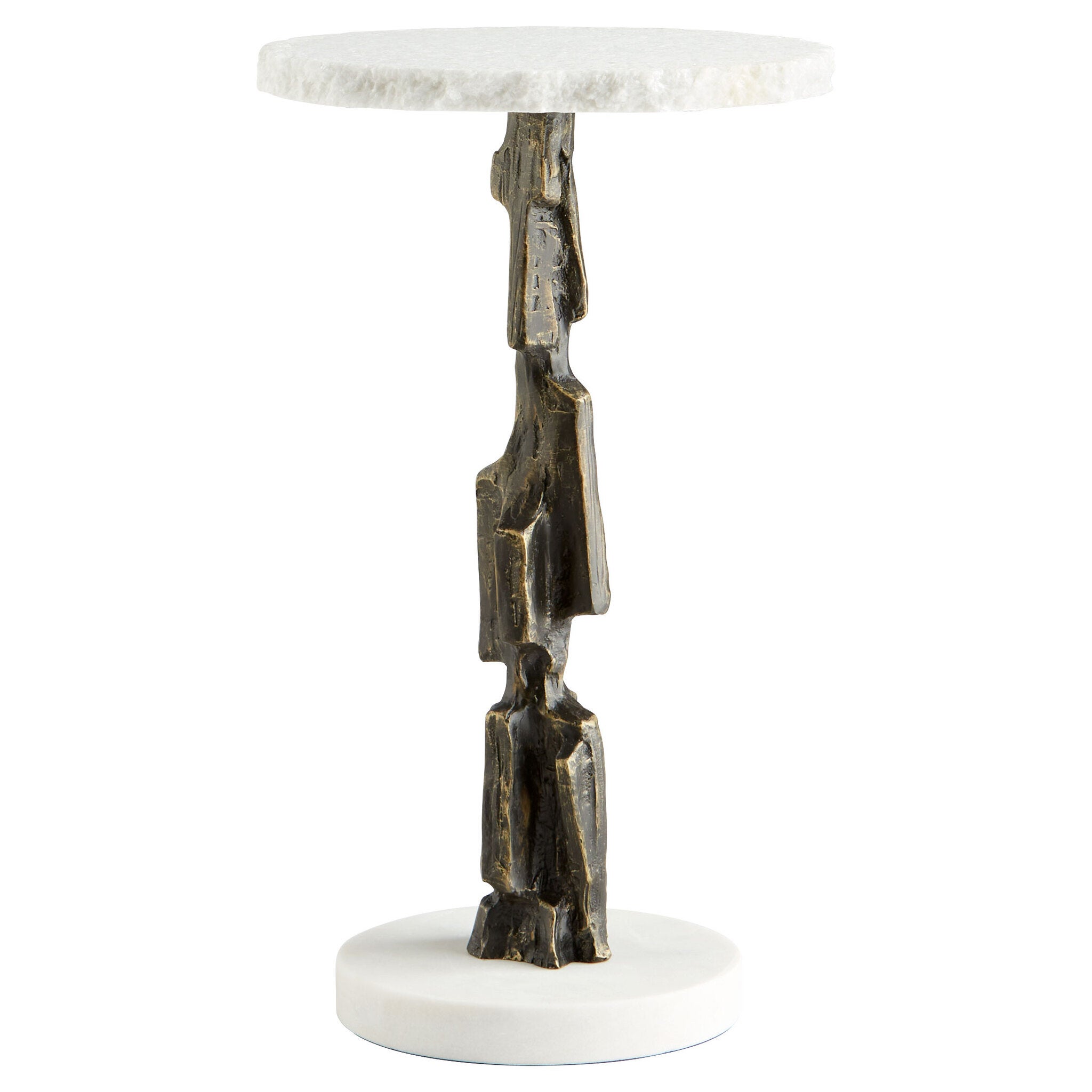 The natural forms depicted with bronze finished sand cast iron and polished natural marble are essential to the earthen design of the Amida side table. The roughened edges of the table top are complemented by the contrast of a wood-like silhouette seen in the shaft. A round white marble base completes the Amida side table. Use to display an abstract sculpture in a gathering space or as an interesting feature in an office design.