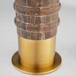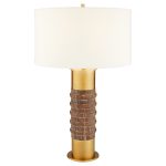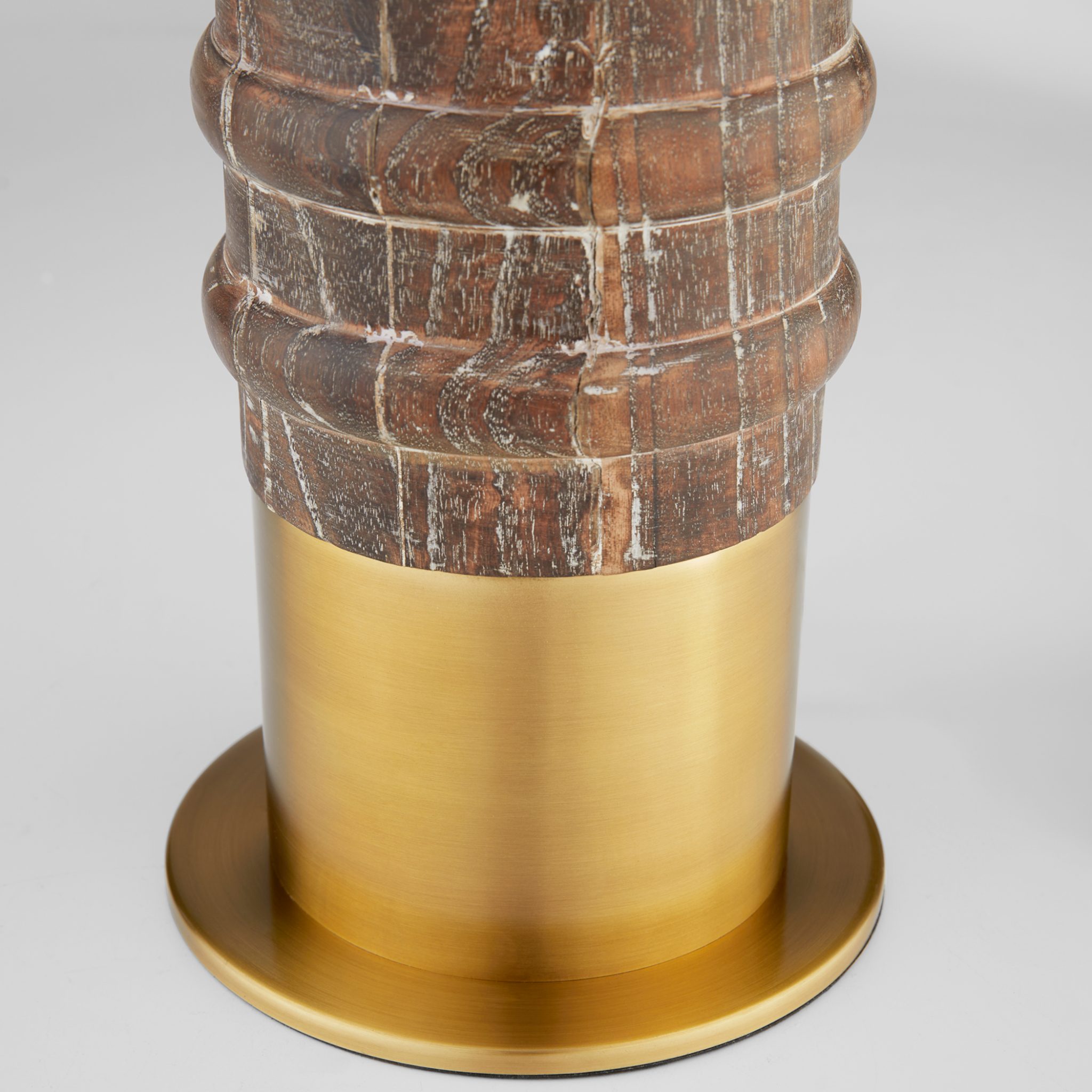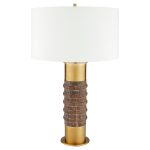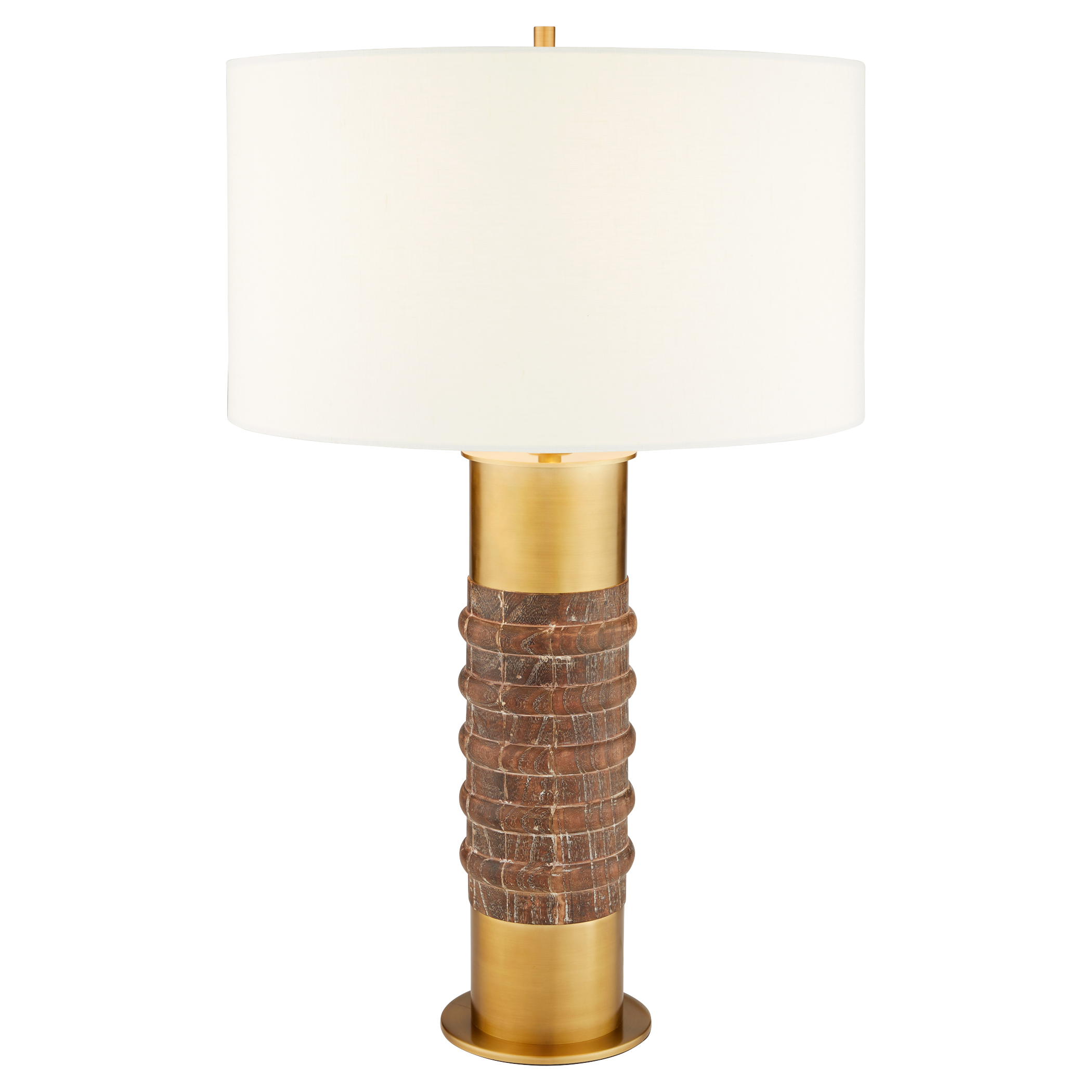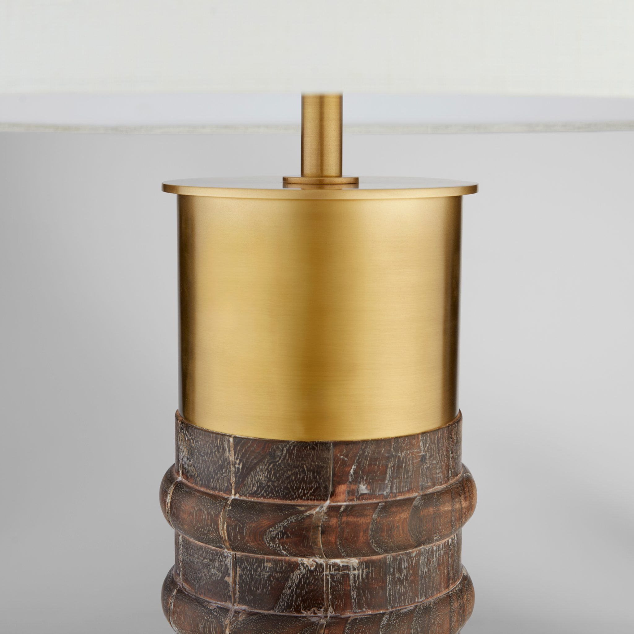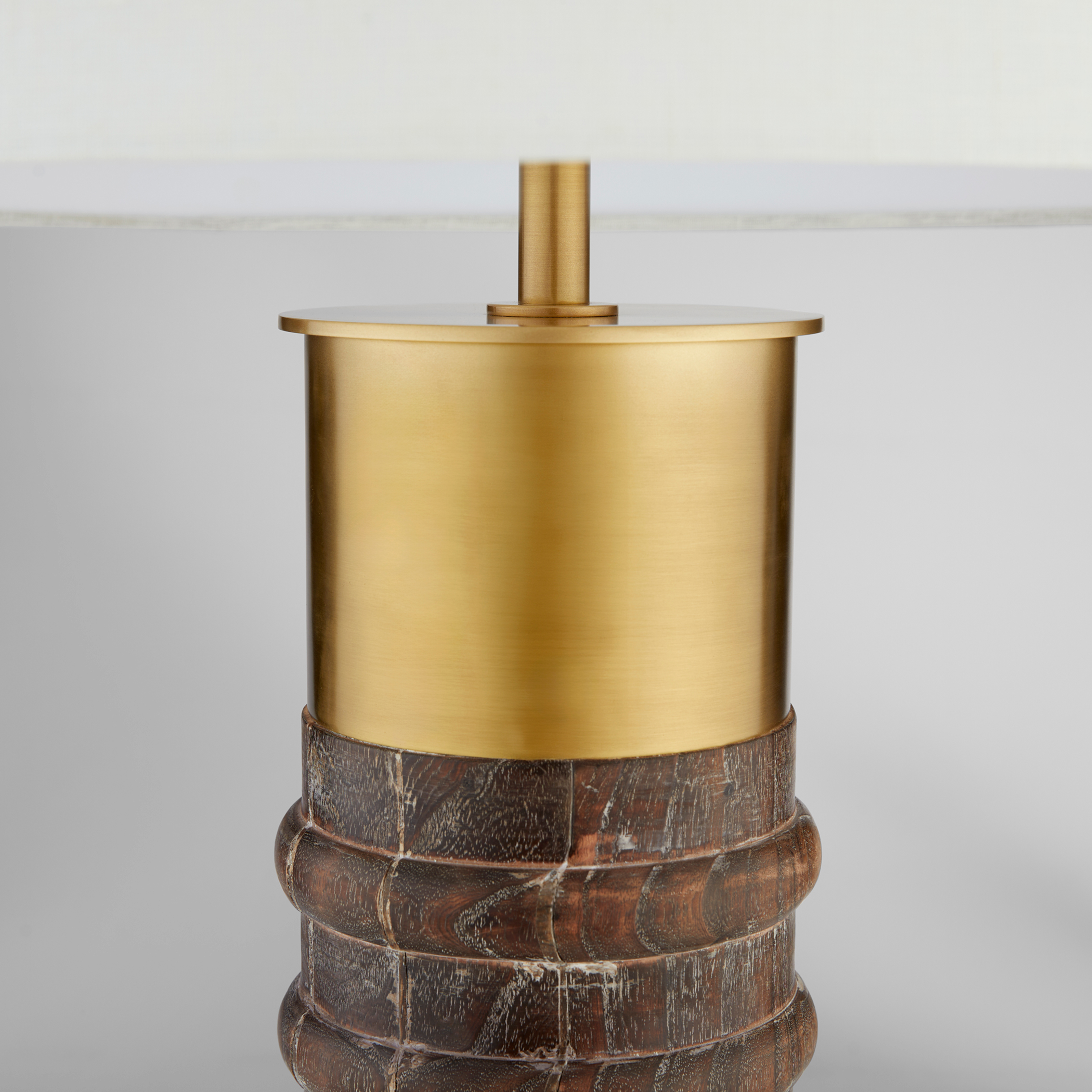 The Anneau Table Lamp, named after the French word for “ring,” showcases intricate ring details along its base. It features cerused wood accented by antique brass and is topped with a white linen shade, bringing a tasteful design to any space.