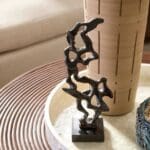 The energy in the Ardor sculpture is perceptible through its chaotic silhouette. Vibrations and excitement register in the aimless lines of the sand cast iron sculpture. The design strikes a cord of passion as the old world finished iron dances its way to a marble base. Place this stately sculpture in a formal dining room, office area, entryway or lobby as a statement piece.