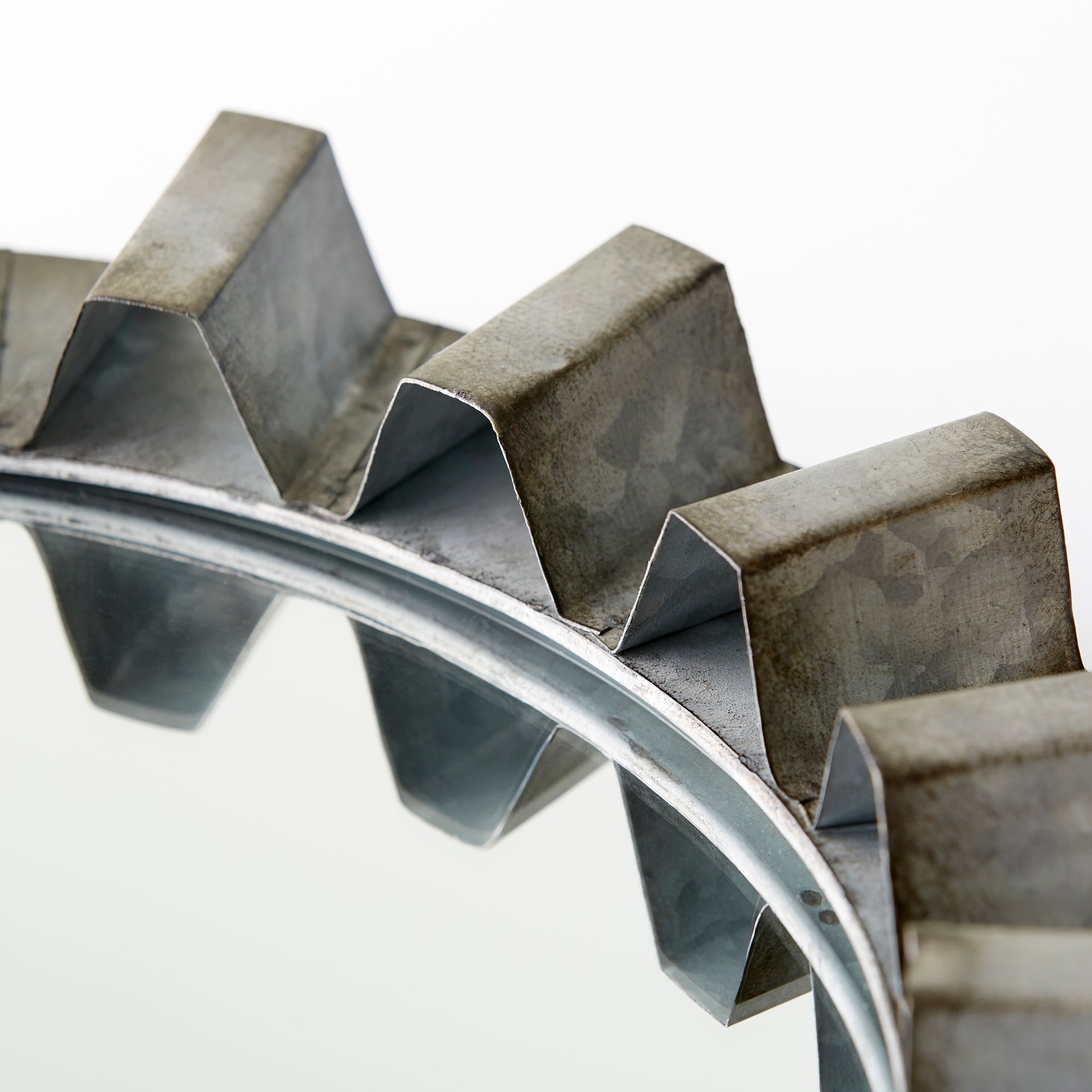 The Argos mirrors feature a rustic, farmhouse inspired look. Boasting a distressed, galvanized finish on a riveted design, this wall hanging decor is of modest size-but with added depth, making it perfect for installing multiples in any hallway, or living room space, with a modern or industrial appeal. Create an artful installation with multiples on a vast-stretching wall space, or hang a single piece over a small accent table for an added touch of bucolic charm.