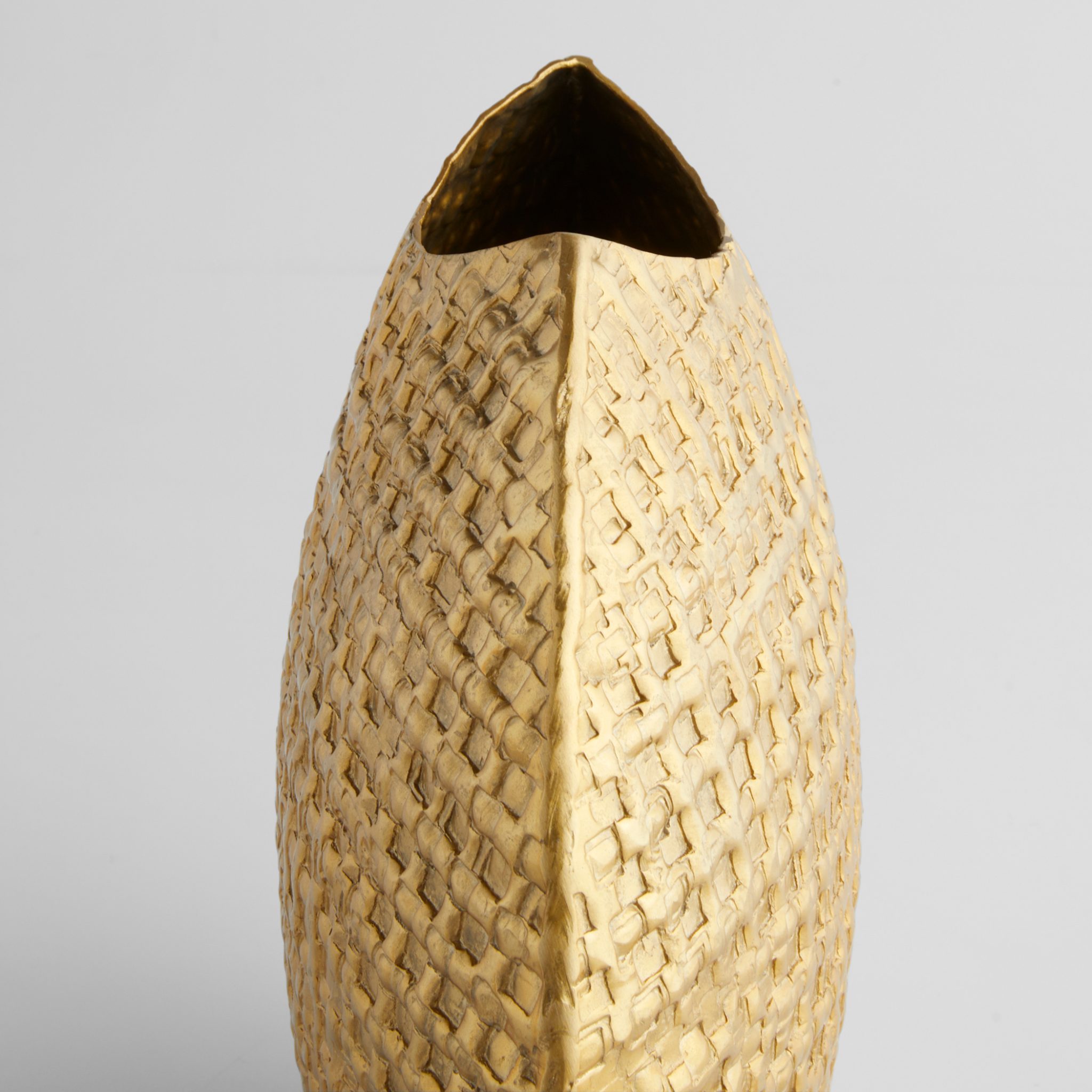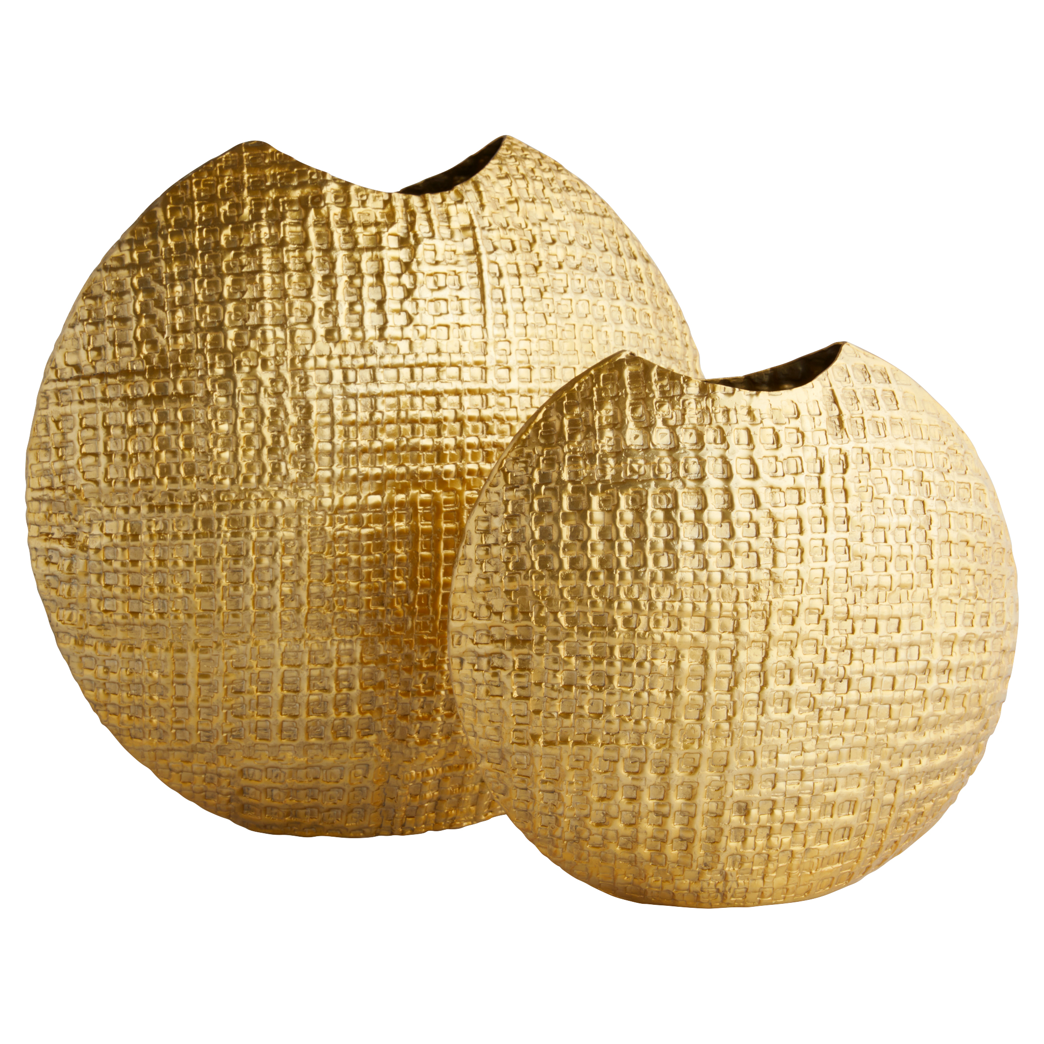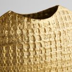 The Artemios Collection features a bold embossed geometric pattern that catches the light, enhanced by a satin gold finish. Crafted from cast aluminum, its textured surface adds depth and dimension. Available in various shapes and styles, it offers versatile options for styling any space.