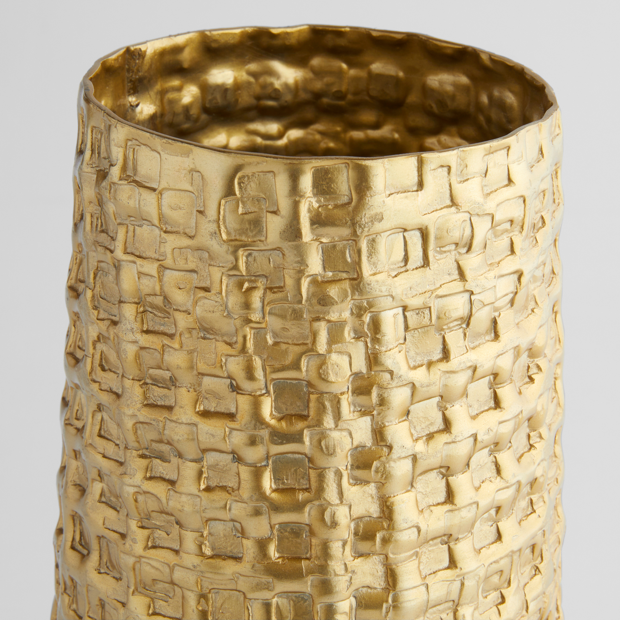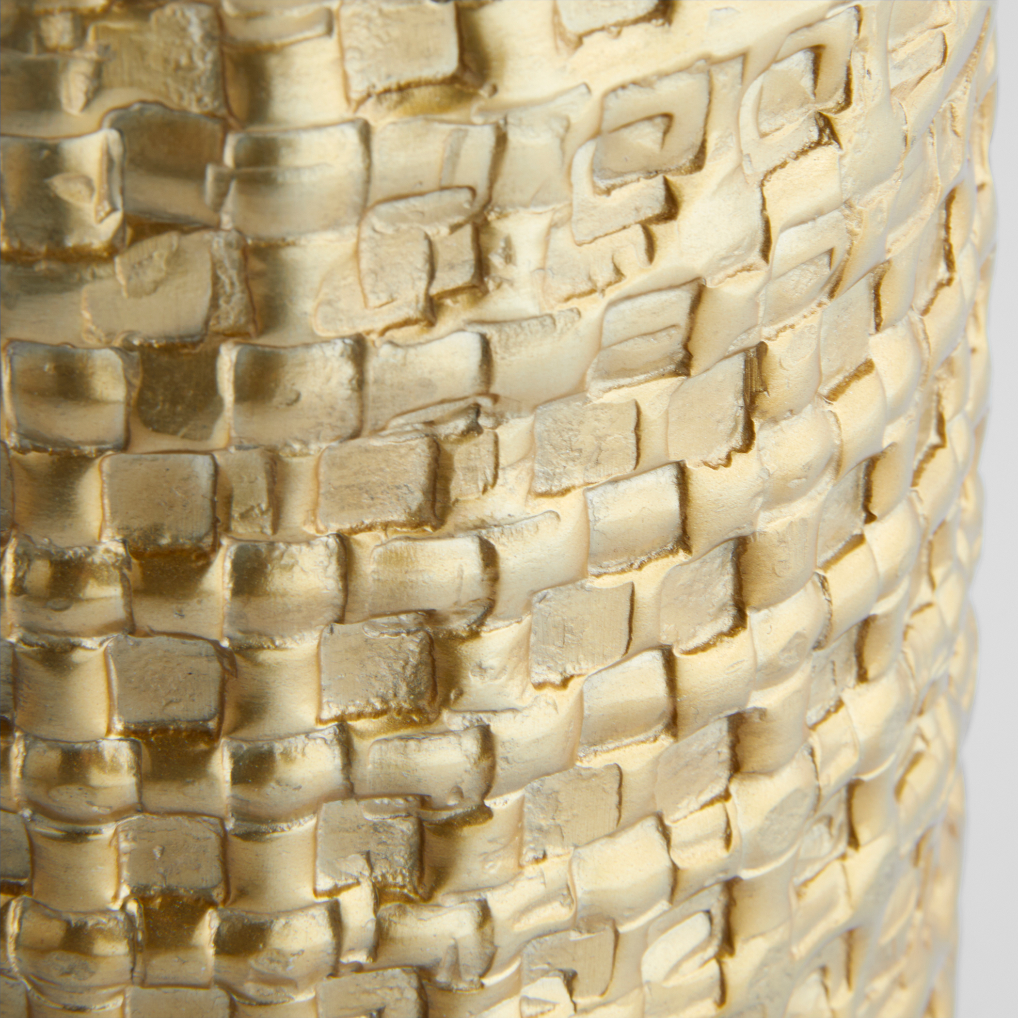 The Artemios Collection features a bold embossed geometric pattern that catches the light, enhanced by a satin gold finish. Crafted from cast aluminum, its textured surface adds depth and dimension. Available in various shapes and styles, it offers versatile options for styling any space.