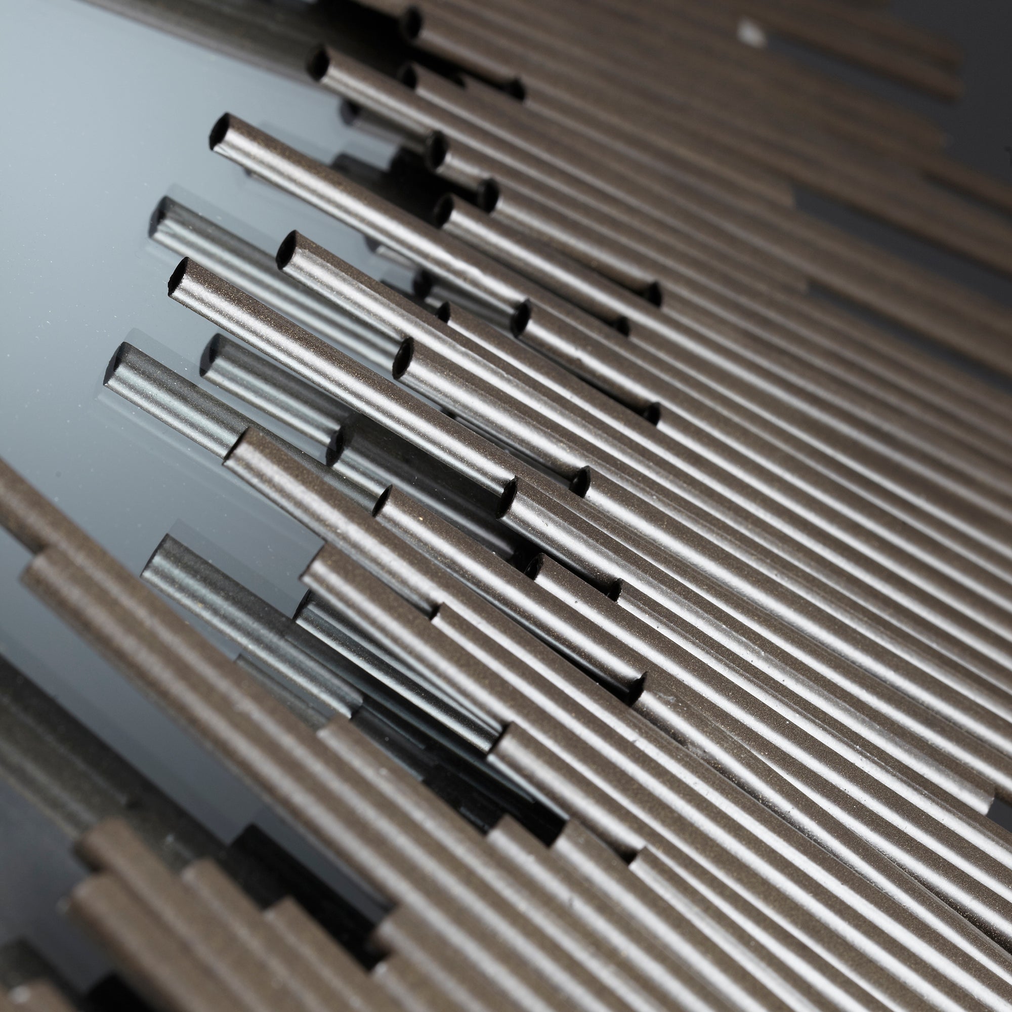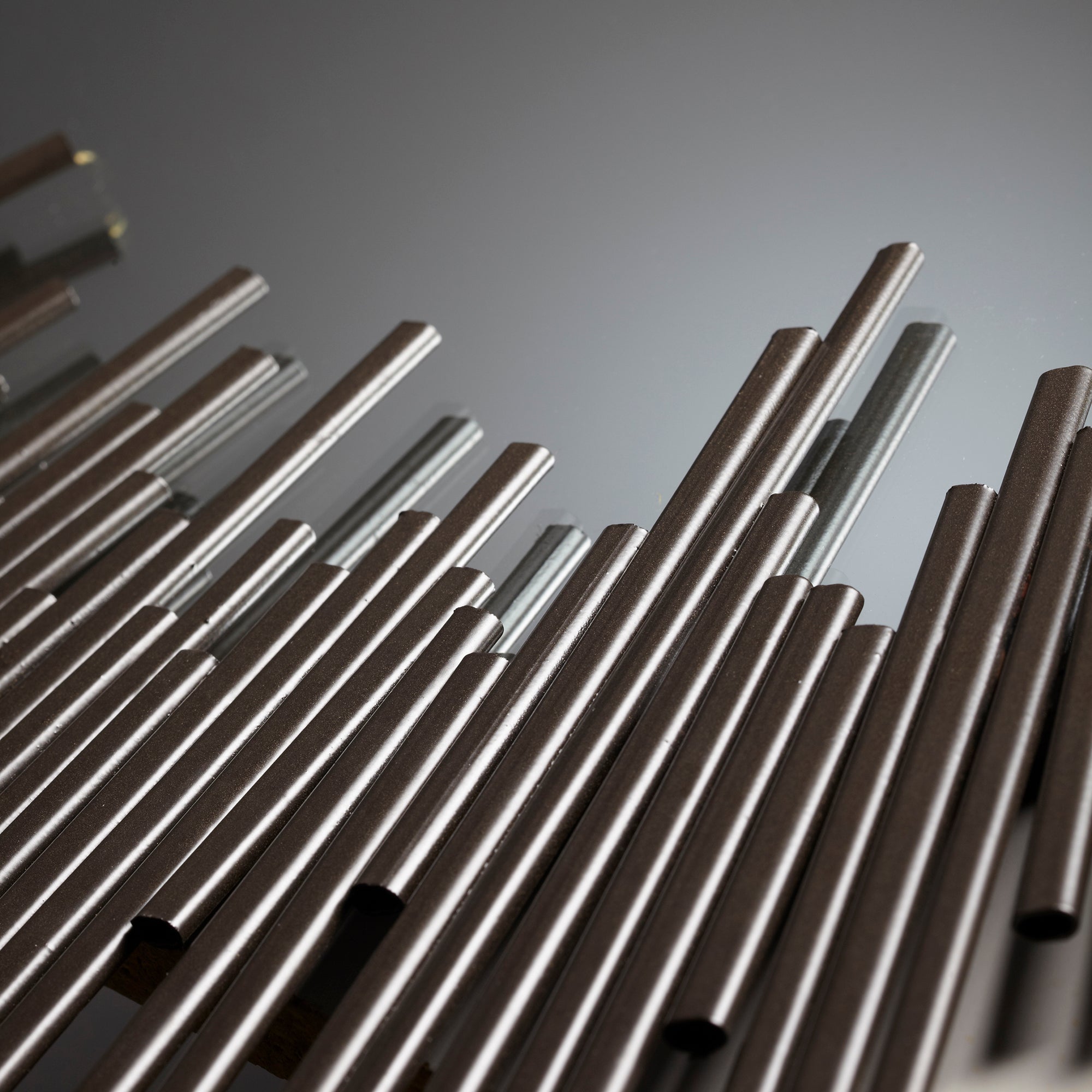 Delicate and geometric, this graphite mirror enhances the modern feel in any bedroom. A ring made of thin strips of iron at varied lengths creates a beautiful arrangement, introducing a contemporary twist on reflection.