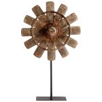 “Fanned out blades rustic wood construction create an appealing combination for this large Azteka sculpture. Offering texture and depth to existing d?cor, the sculpture features natural, aged look and sits on an iron stand.”