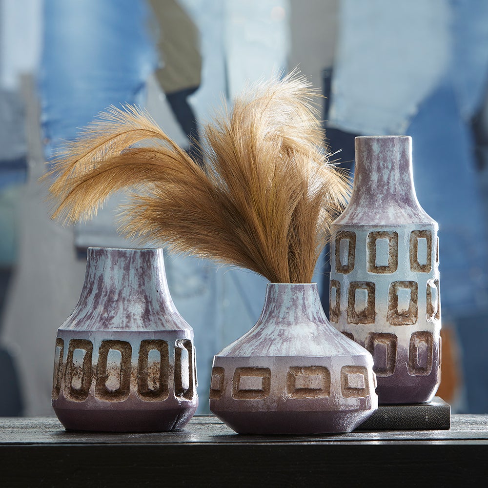 The Bako Vase collection is a uniquely crafted set of ceramic vases with an artisanal flair. Sunrise hues of blue and violet glazes offset the geometric patterns on the ceramic shapes. The shifting colors the fluid, reactive glazes create give the collection an earthy, rustic appeal. Available in three sizes.