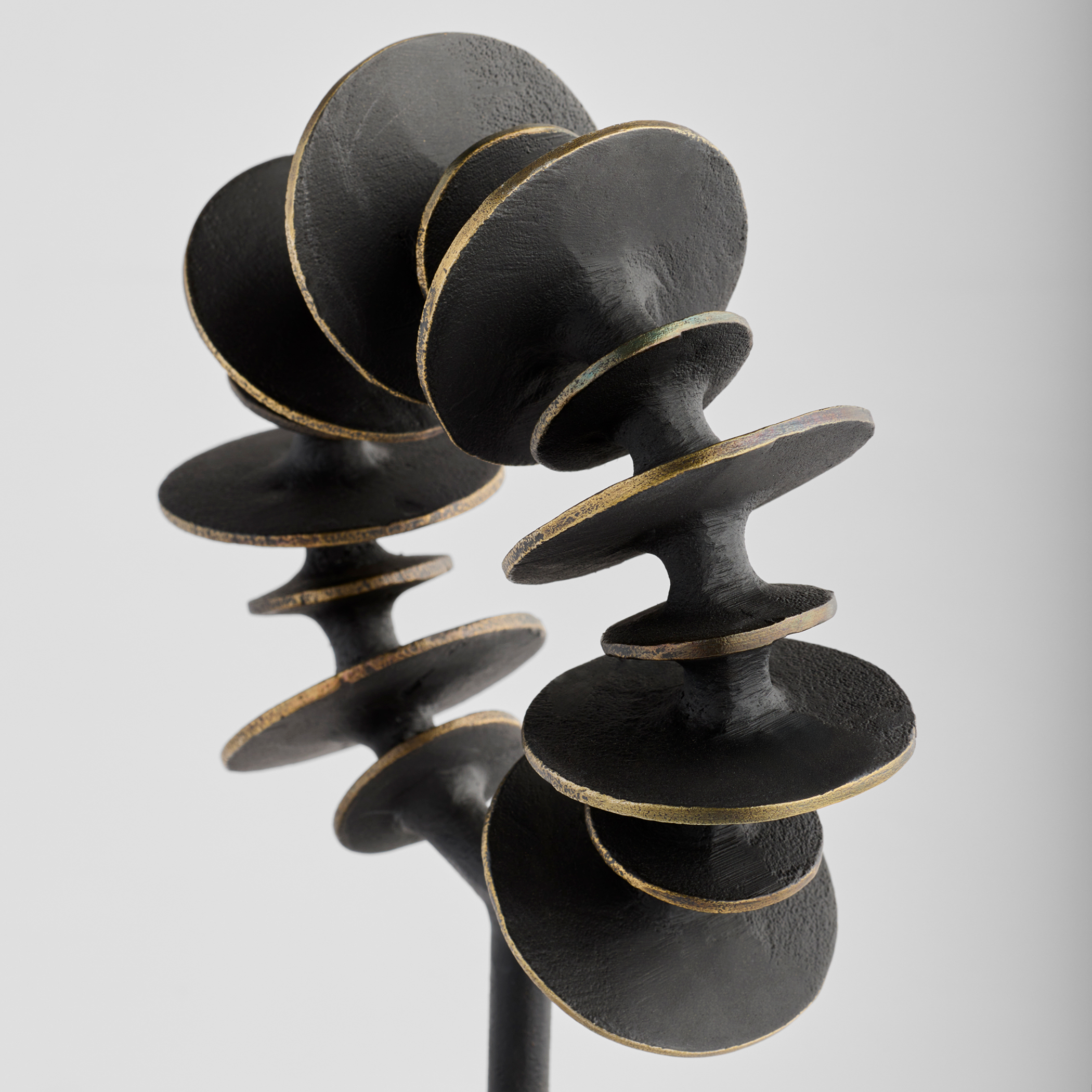 The Barcelo Collection reflects the influence of Catalan modernism and Barcelona’s striking architecture. Crafted from cast brass with an antique patina finish, its design features alternating disc sizes with subtly exposed rubbed brass edges. The design tapers off to sit atop a sleek white Banswara marble base, blending bold structure with elegant contrast.