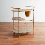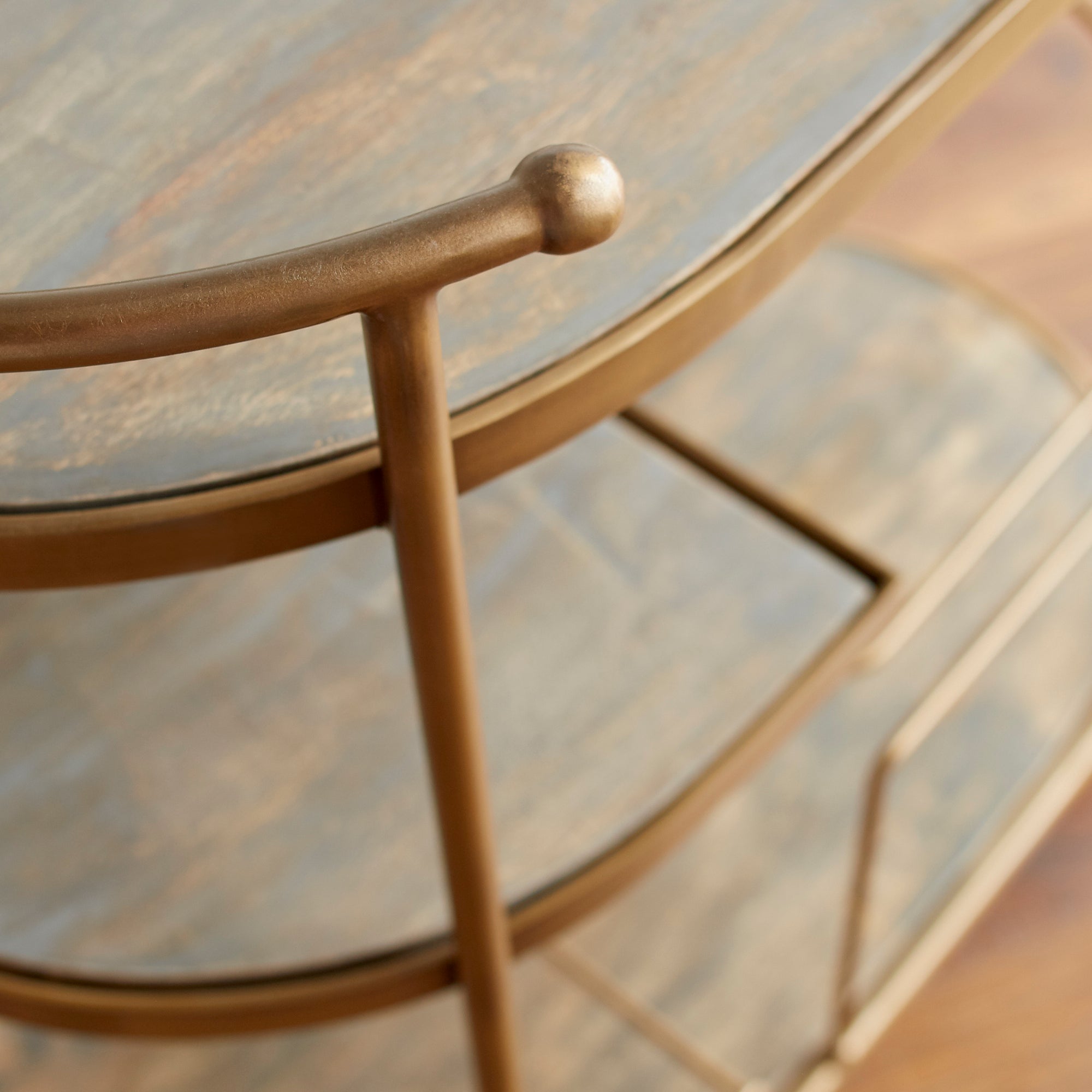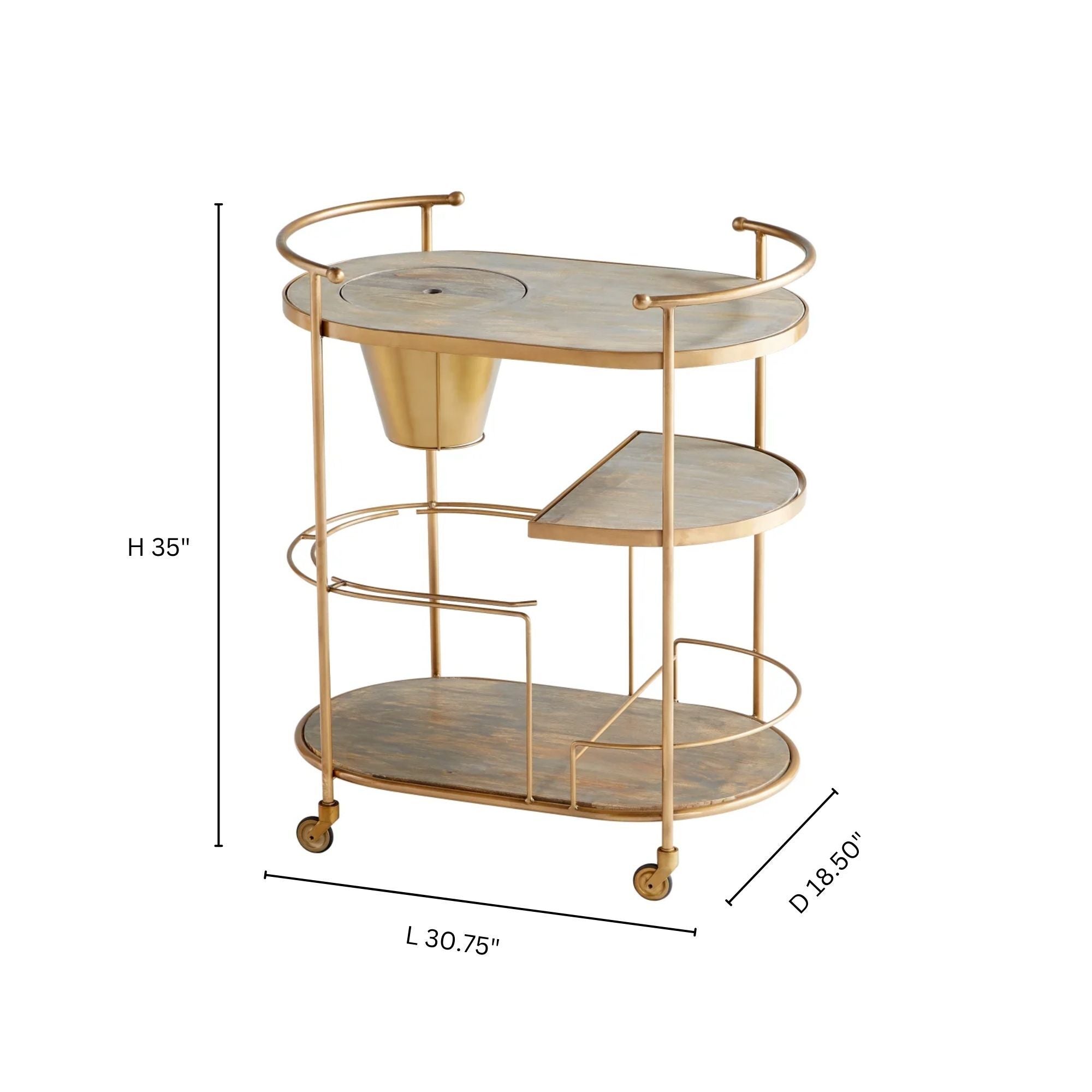 Classic and nostalgic in style, the Art Deco appeal of the Avalon Bar Cart makes it the perfect furnishing for any upscale bar or dining room ensemble. The sturdy stainless steel and wood construction guarantees this cart’s lasting quality, with added panache thanks to the Antique Brass finish. This mobile serving station accommodates wine bottles, wine glasses, and any other barware and serving accessory ? it holds everything necessary for a portable bar.