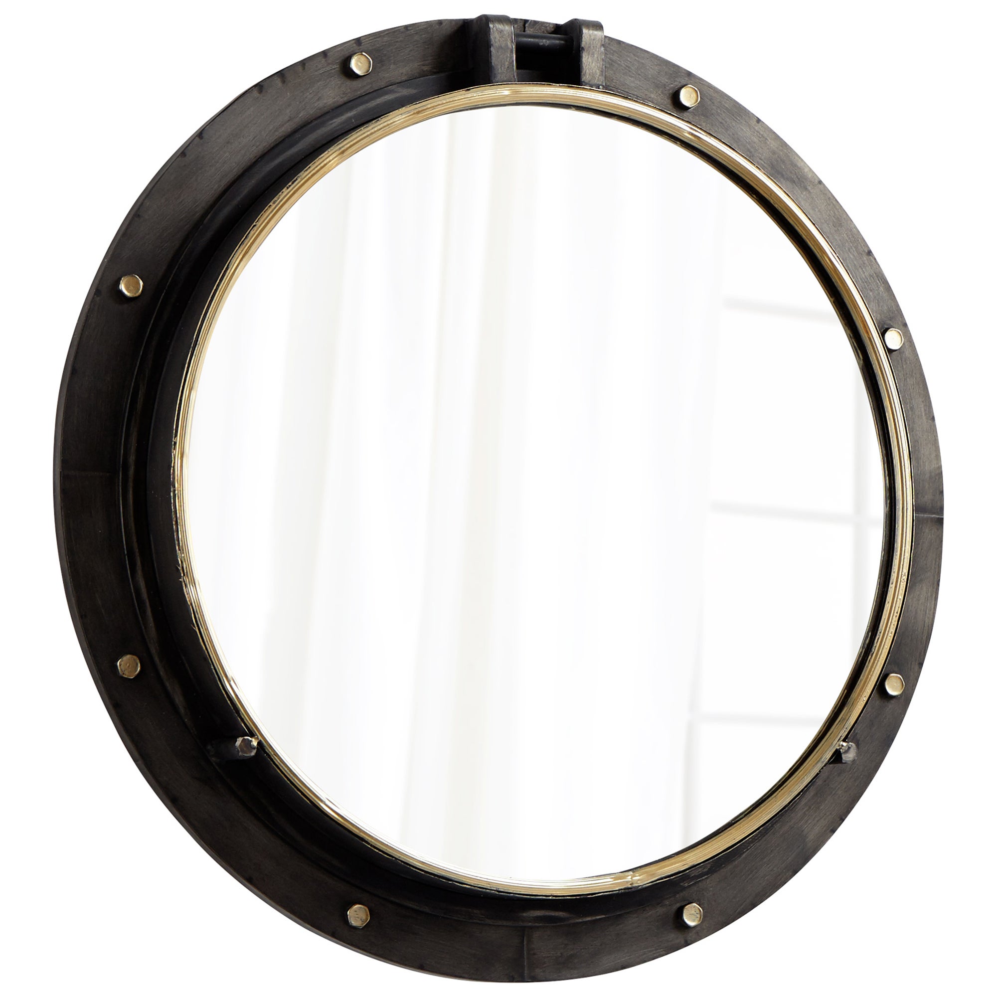 This chime hoop reclaimed barrel inspired iron and wood mirror feels timeless. With its weather bronze finish and burnished gold rivet details are sensational. Add vintage vintner touches to a master bedroom.
