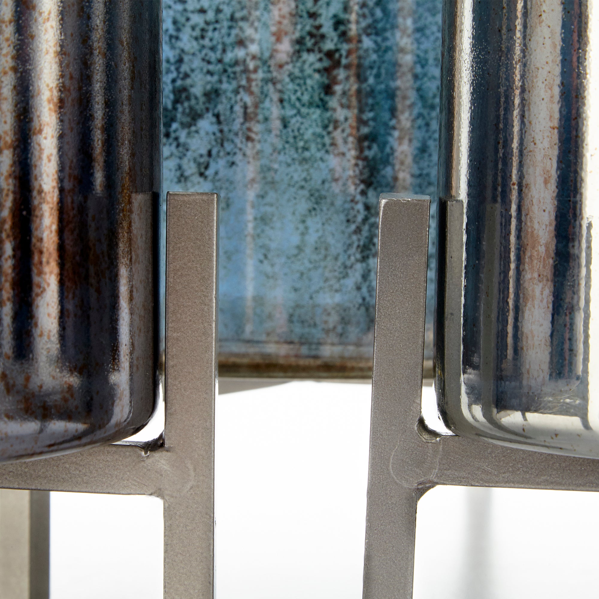 Verdi garnet finish glass creates a sophisticated, classic look for this small metal candleholder. Featuring a glass hurricane, an iron base lends sculptural appeal and subtle presence with a matched finish.