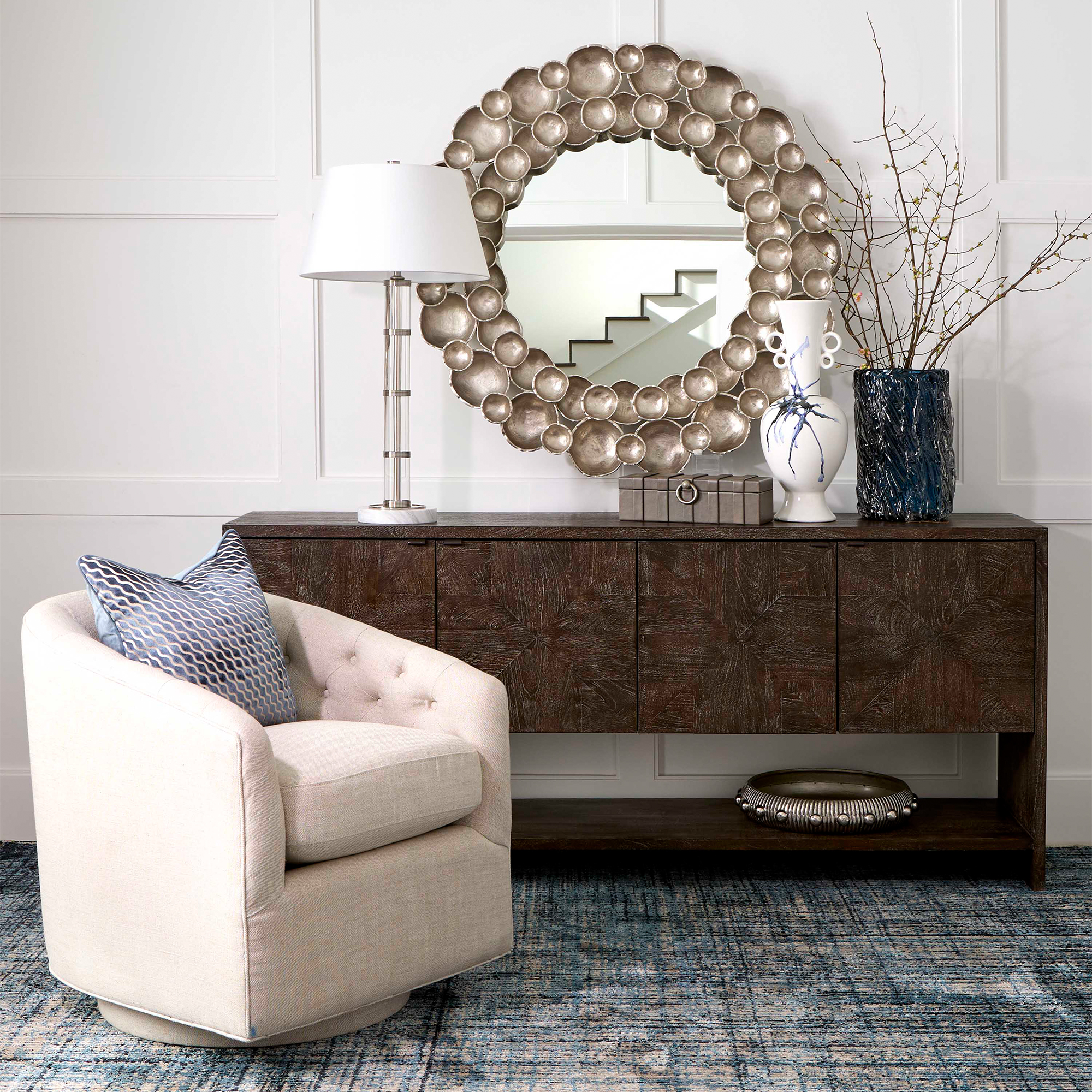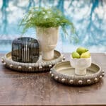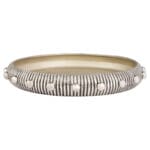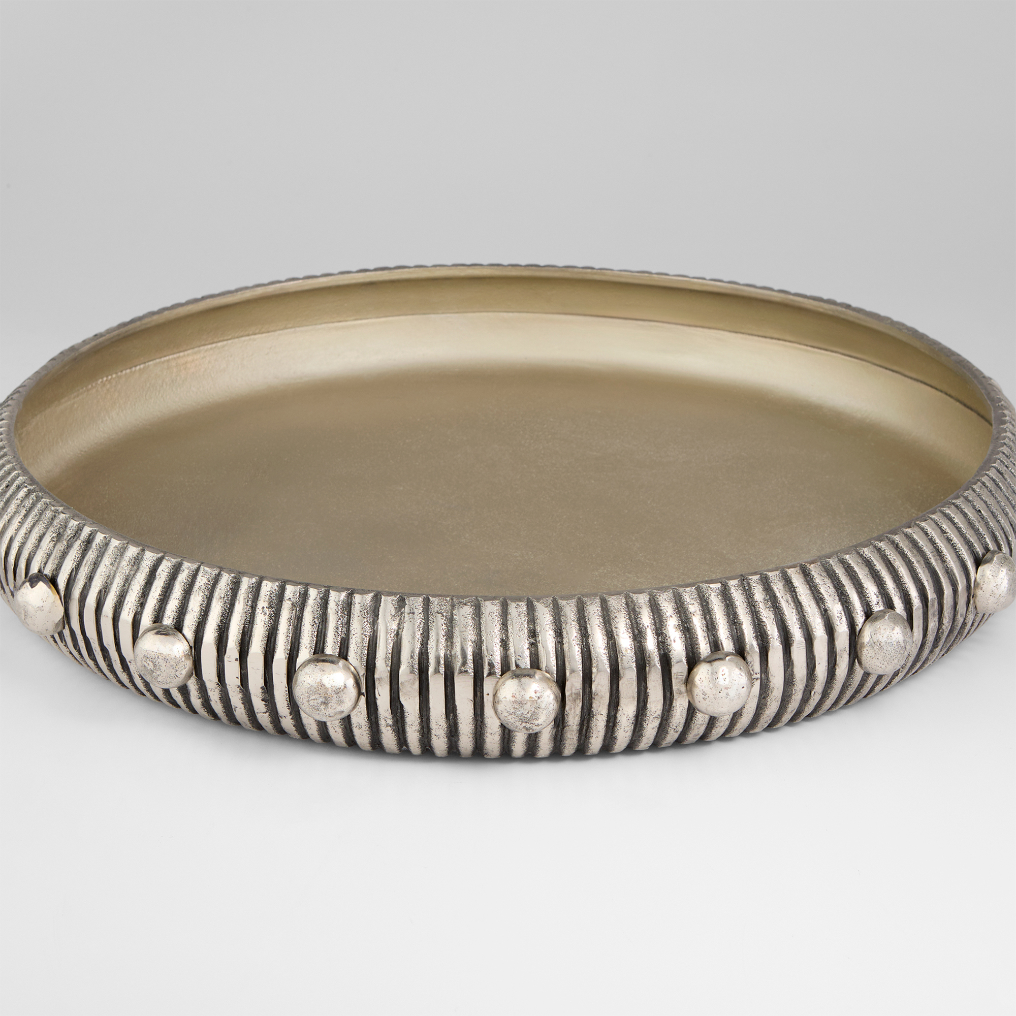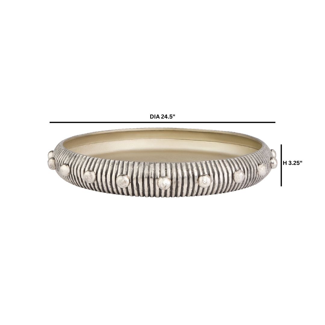 The Batten collection leaves an indelible mark through intricate design and meticulous detail. This large-scale cast aluminum tray bears an antique nickel finish that accentuates the crevices of its vertical ribbed texture. An antique nickel finished button detail provides a striking contrast, creating an exquisite focal point. The Batten collection of statement pieces serve as a functional yet remarkable accent to any design.