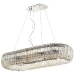 The Beaming Around pendant is a luminous hoop. The round chrome frame is ornamented by single glass rings that alternate in finish from clear to cognac, a subtle detail that blends the two perfectly but still adds a deliberate decorative variation. Ten foot adjustable cables allow for a great range of variability to suit almost any space.