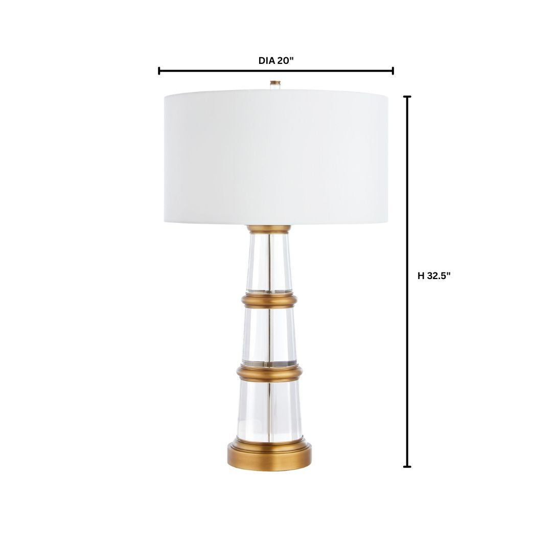 The Bellamy table lamp captures attention with its solid, tapered crystal base, accented by layers of antique brass tooled rings, creating a mesmerizing visual display. A crystal body adds a touch of heritage and grandeur complemented by an antique brass base. The lamp’s natural linen shade diffuses light that bathes its surroundings in a warm and welcoming glow. The lamp’s dimmer on/off switch, conveniently located on the socket, allows lighting adjustment to suit your needs and mood. To ensure stability and a substantial presence, the Bellamy Table Lamp is anchored by a weight of 42 pounds.