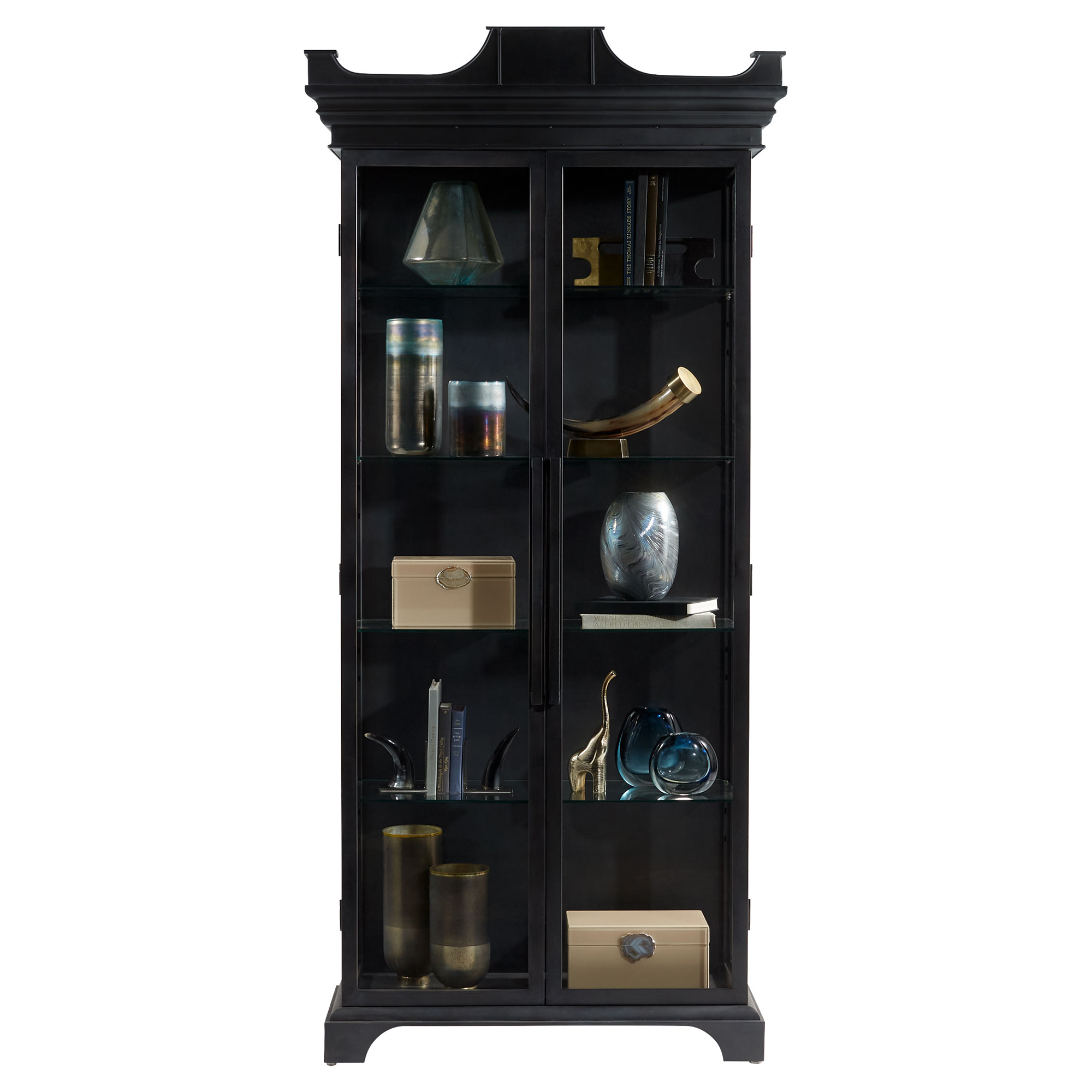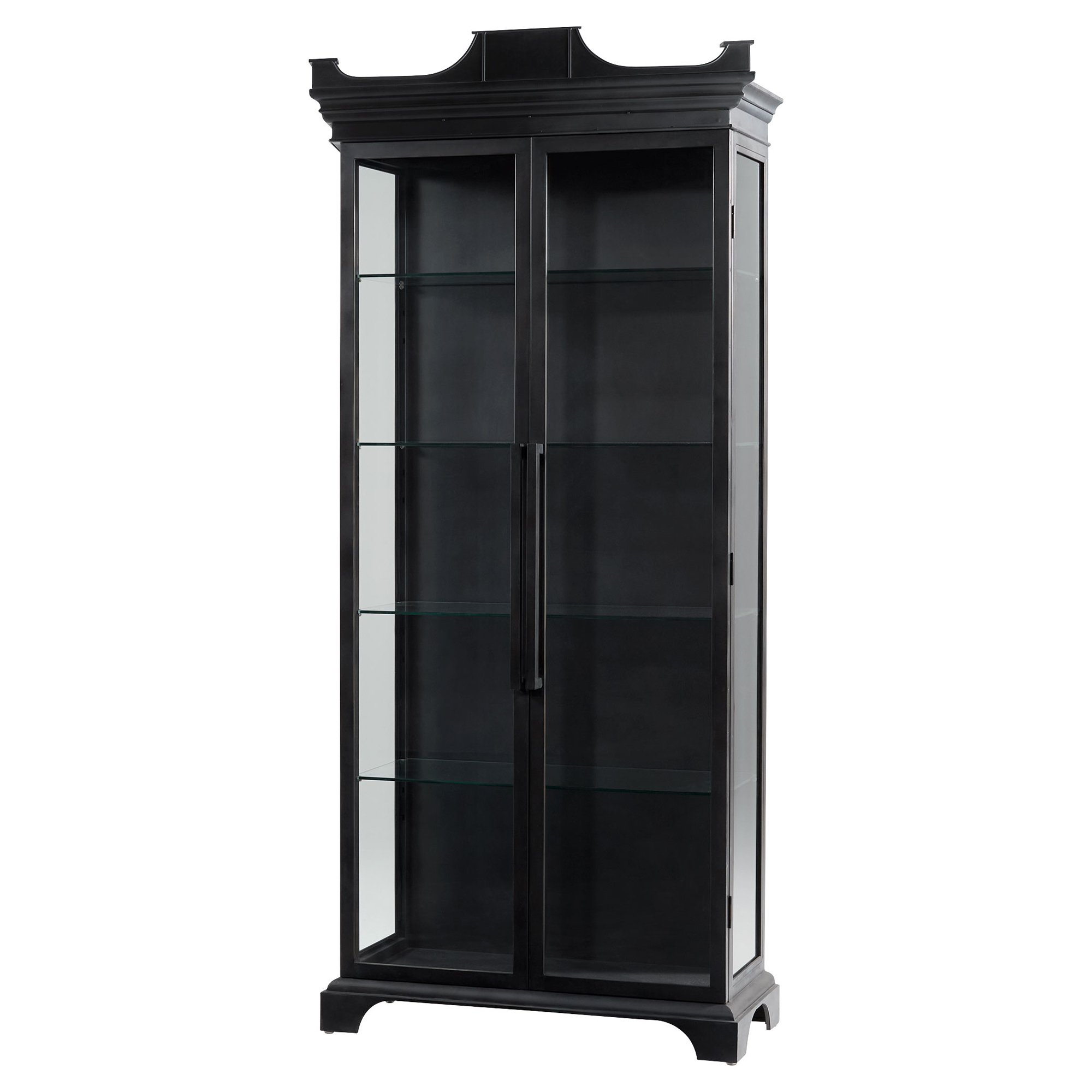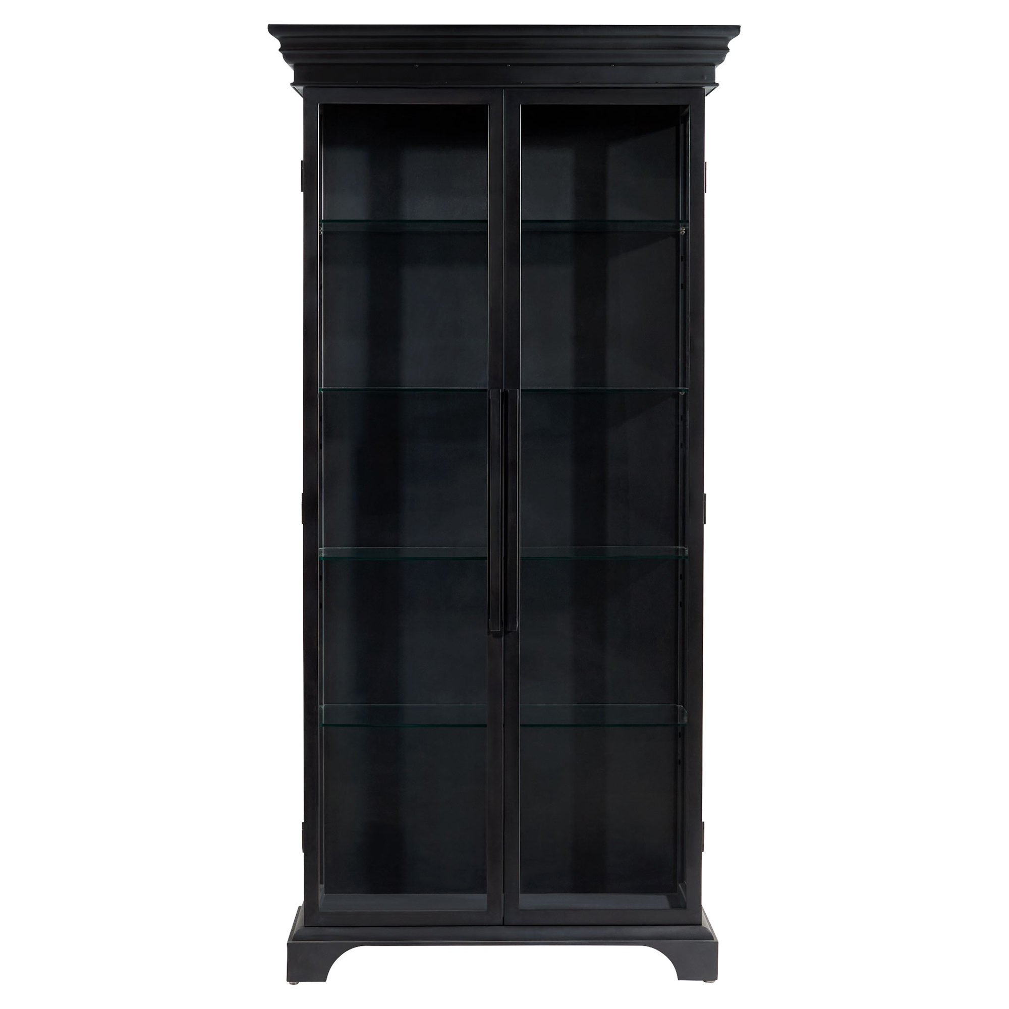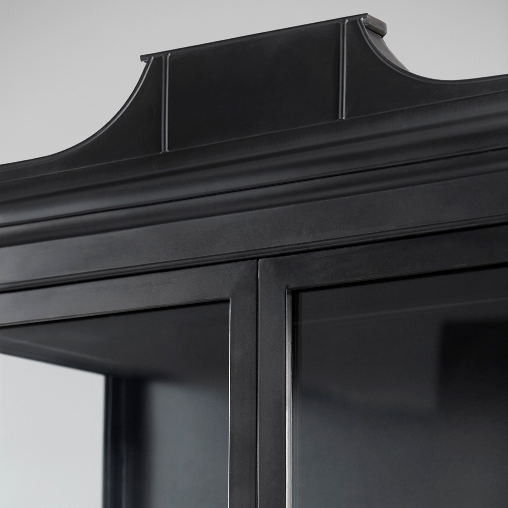 - Satin Black Oversized Metal Curio Cabinet | Framed Glass Doors | Glass Side Panels | Four Adjustable Glass Shelves | Black Metal Hardware | Magnetic Closures | Optional Cornice Included | Cornice Ships Detached