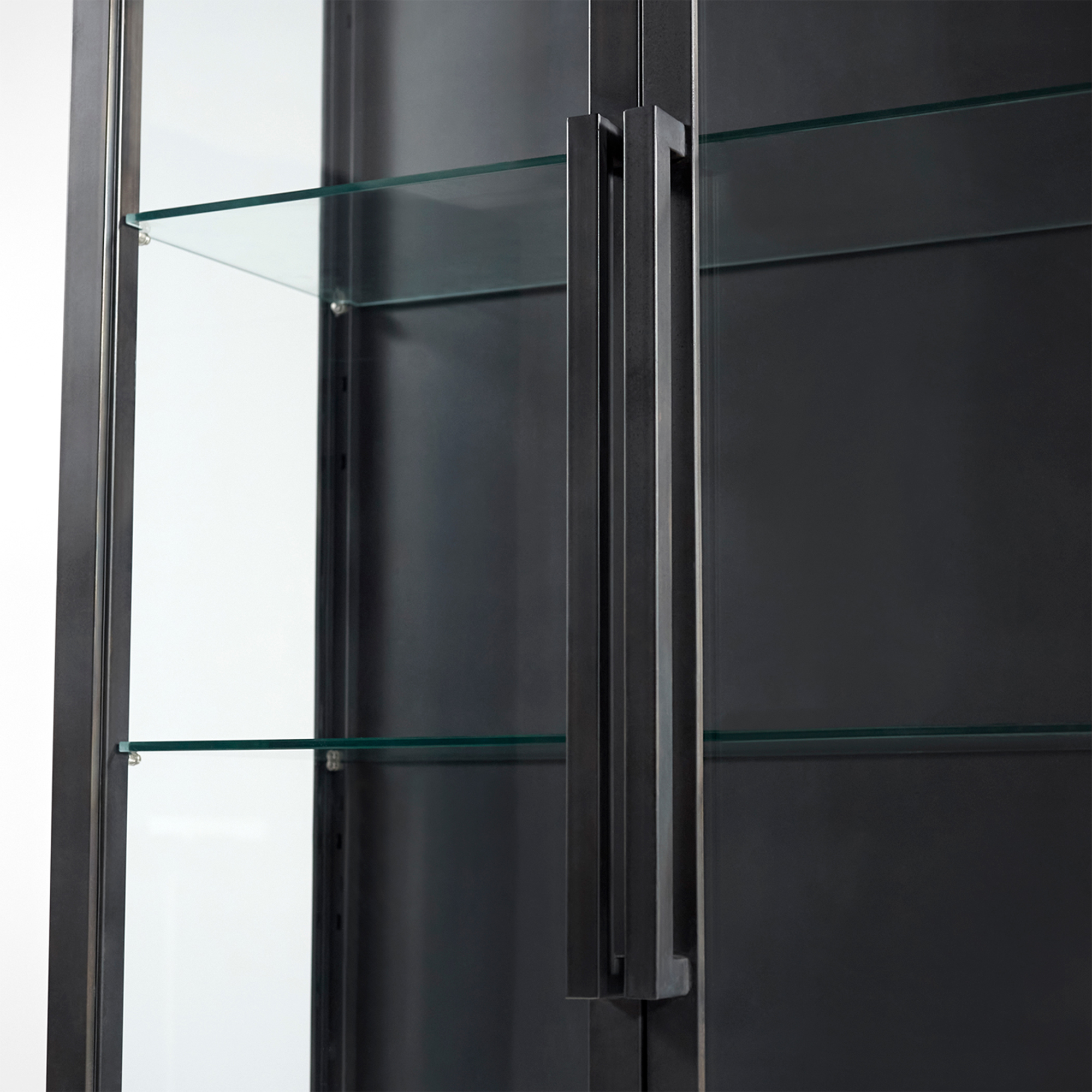 The Bethlehem Cabinet is an oversized black metal curio cabinet rooted in traditional design. A dark finish, decorative molding, and French country styling shine through ornate motifs and softly curved accents. These pieces are modern ?rough lux? interpretations of classic wood designs, boasting framed glass doors and four adjustable shelves. Traditional forms are rendered in unfinished cold-rolled steel that is clear coated to seal and let the natural finish characteristics. With a removable cornice, glass side panels, and magnetic closures, this cabinet is perfect for any unassuming but upscale dining room or kitchen space.