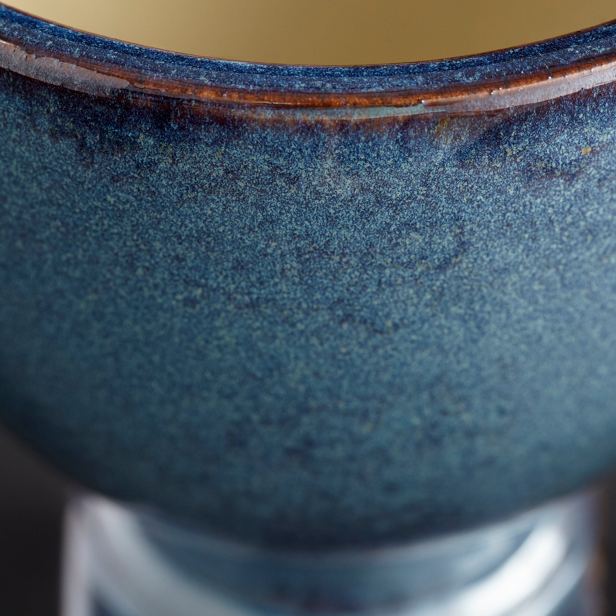 “This organically elegant, tabletop vase features a blue glaze finish on ceramic, chalice silhouette. The gradient glaze of soft dots adorns the surface from top to bottom. Just one part of a trio, these show-stopping accents are ideal in a grouped collection, or perfectly pleasant displayed individually with floral arrangements. Enhance your living room or dining space ensemble with one of these intriguing rustic vessels.”