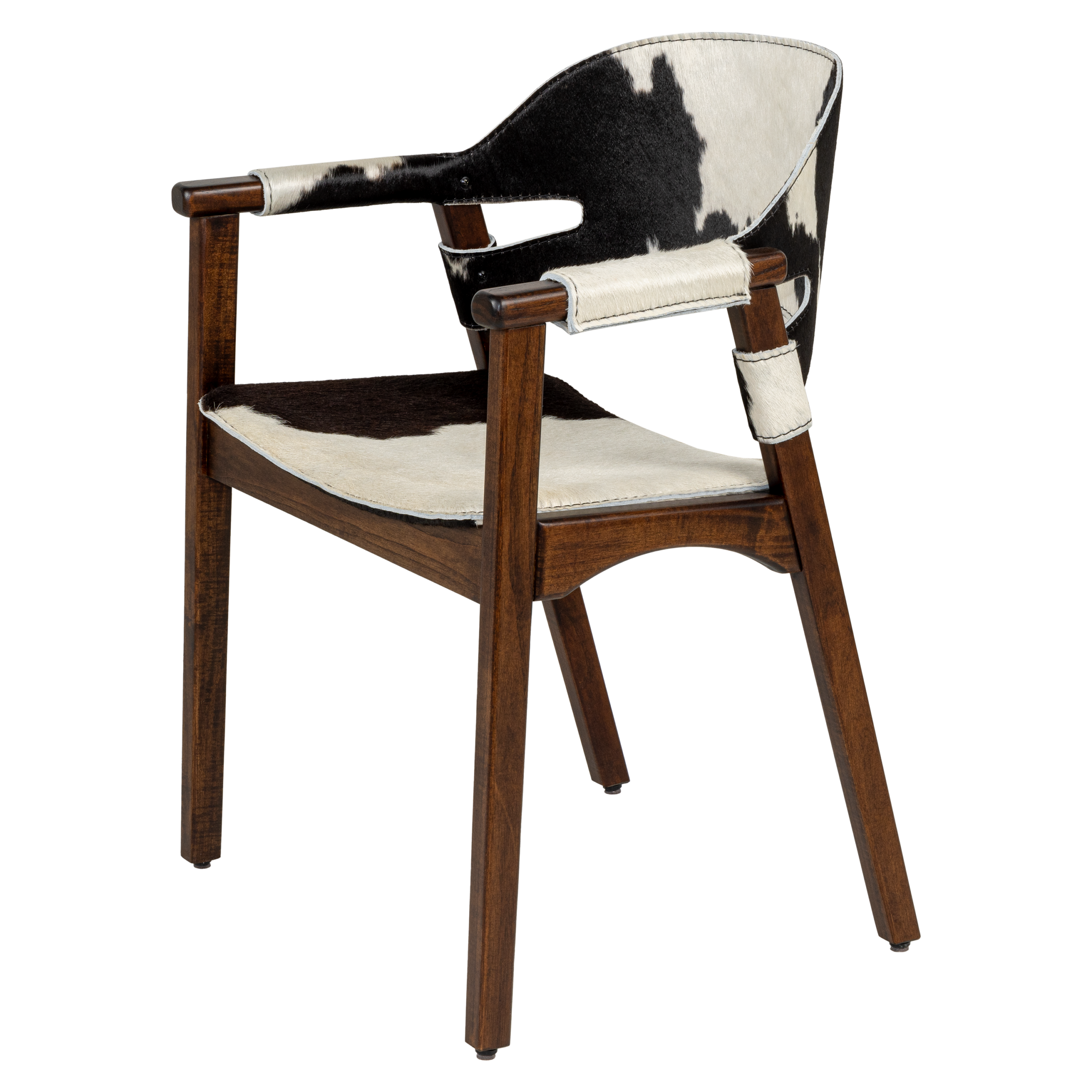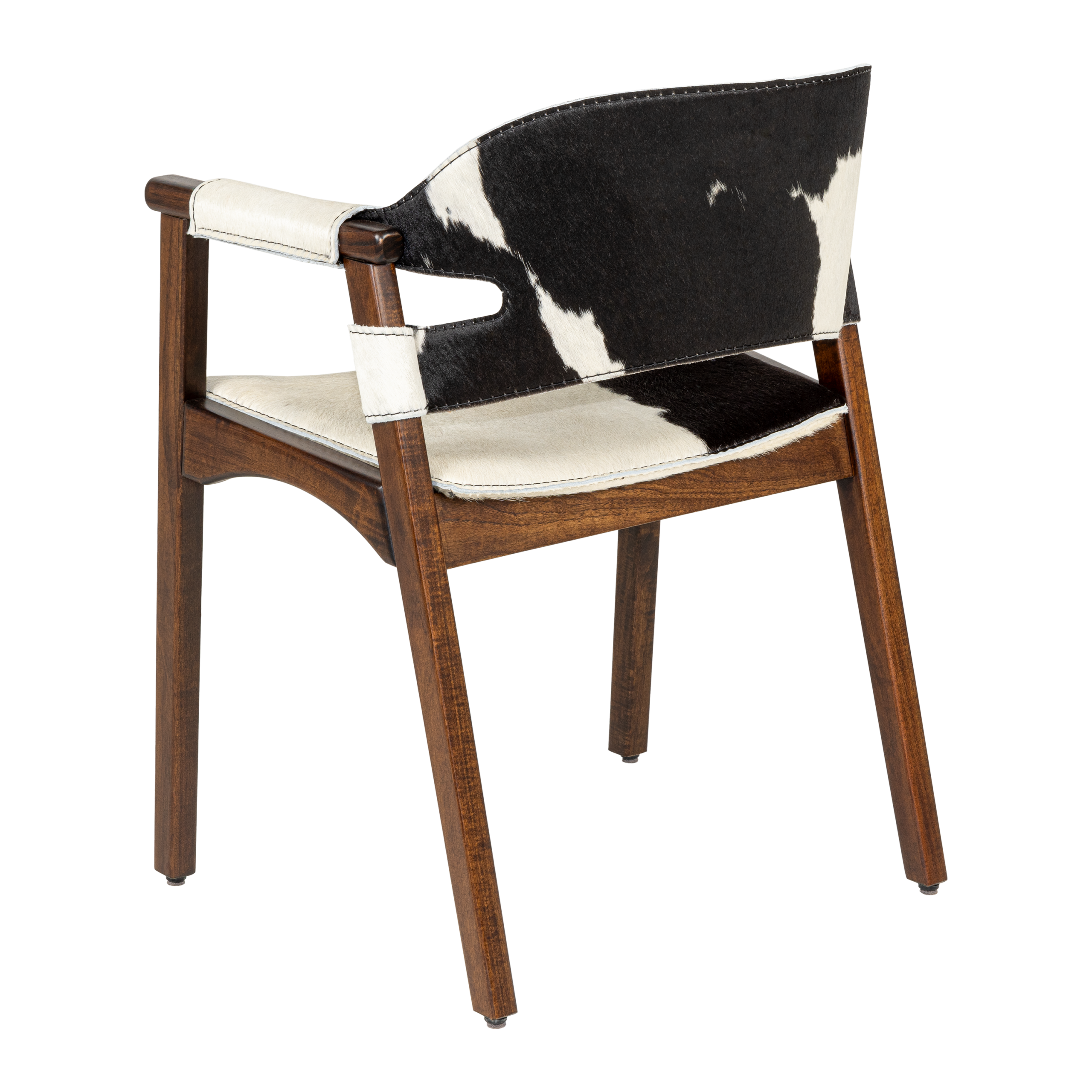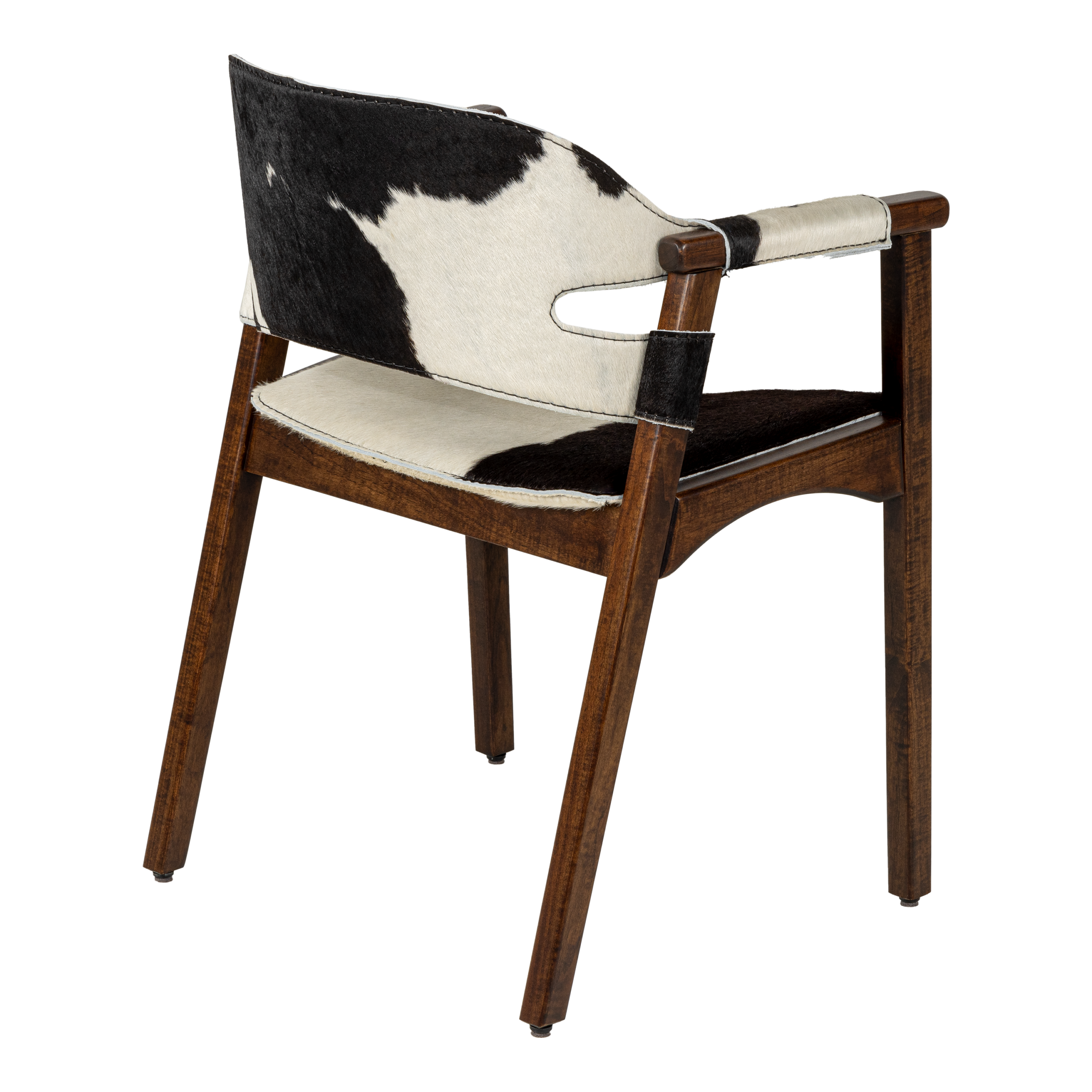 The Boss chair features a solid Grandis wood frame, reinforced by multi-laminated sheet metal. With a D26 foam seat upholstered in black hair-on-hide accentuated by sewn caramel topstitching, it offers a comfort and class. Tapered legs complete the design.