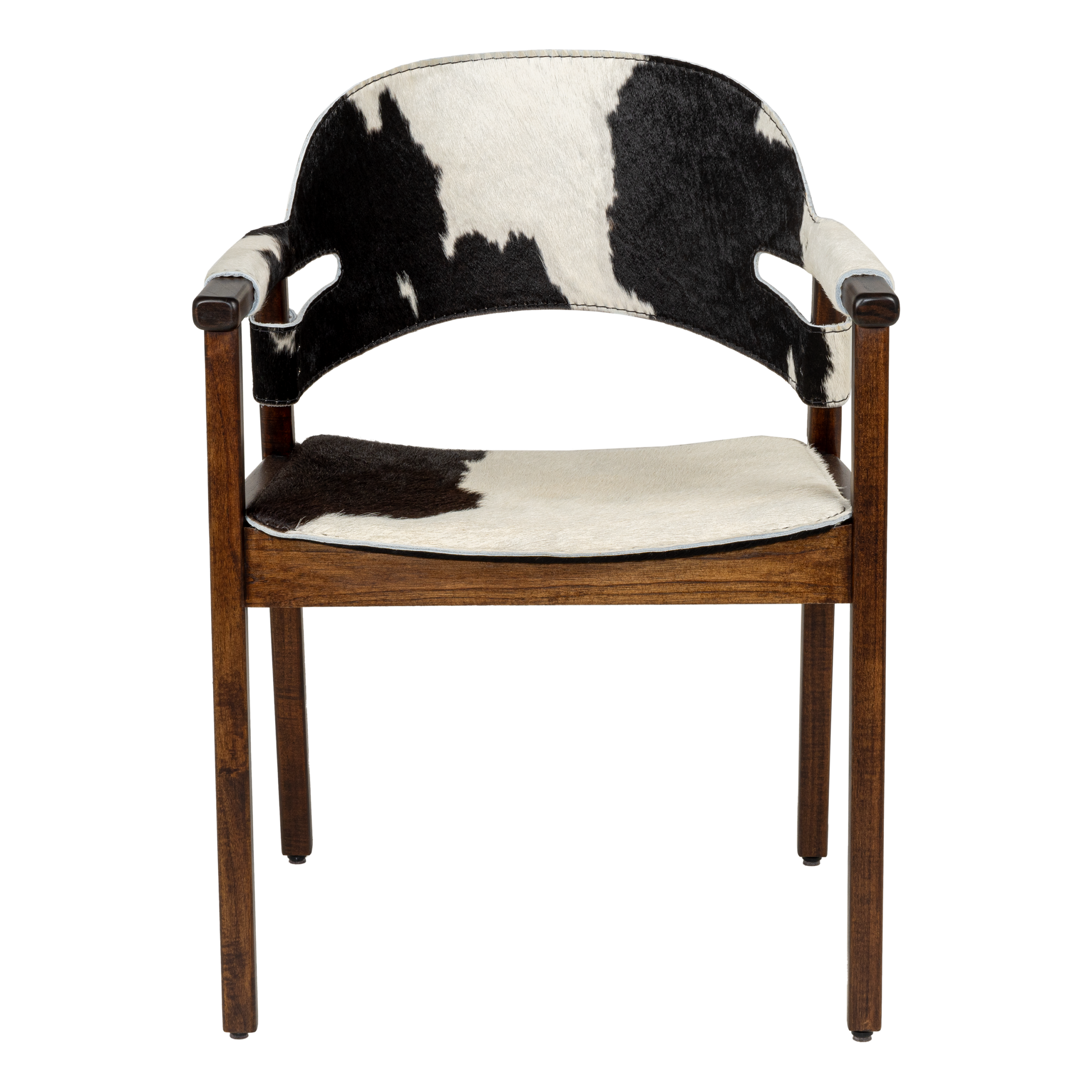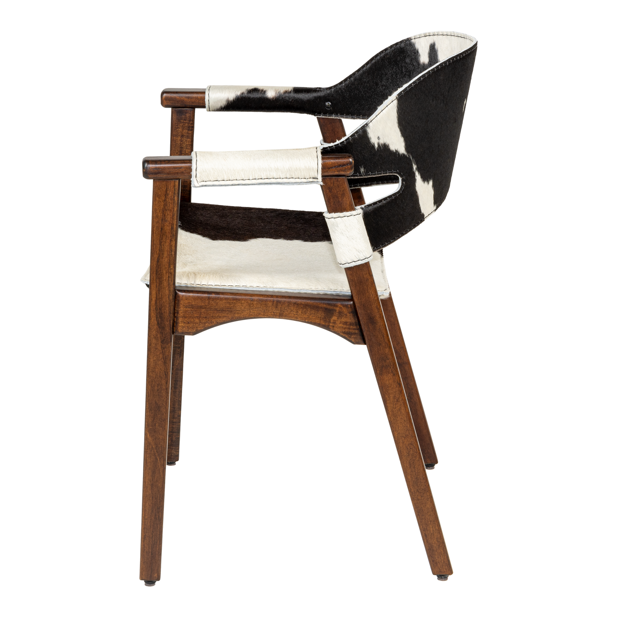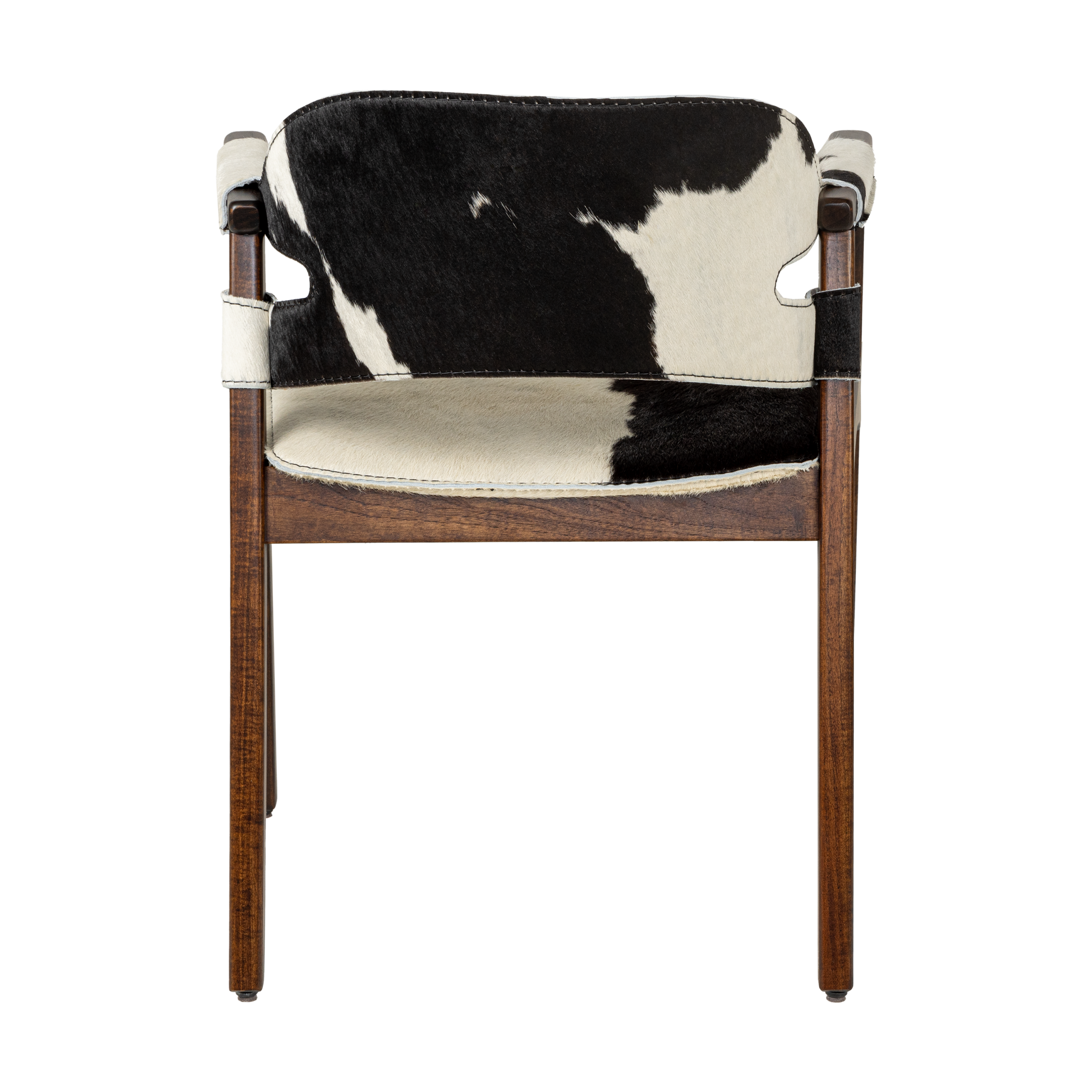 The Boss chair features a solid Grandis wood frame, reinforced by multi-laminated sheet metal. With a D26 foam seat upholstered in black hair-on-hide accentuated by sewn caramel topstitching, it offers a comfort and class. Tapered legs complete the design.