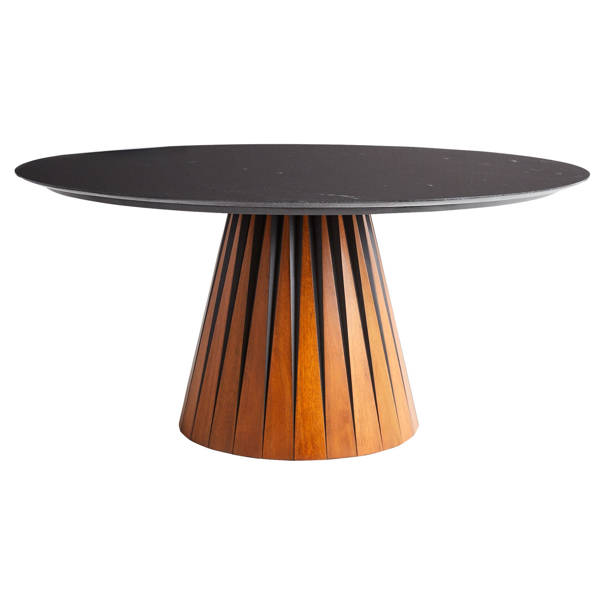 The Bourbon dining table showcases a single pedestal base and embodies the essence of Japandi-influenced contemporary design. Slender triangular cuts in the base are finished in a PRI black lacquer. The table’s Via Lactea marble top features a gentle beveled edge.