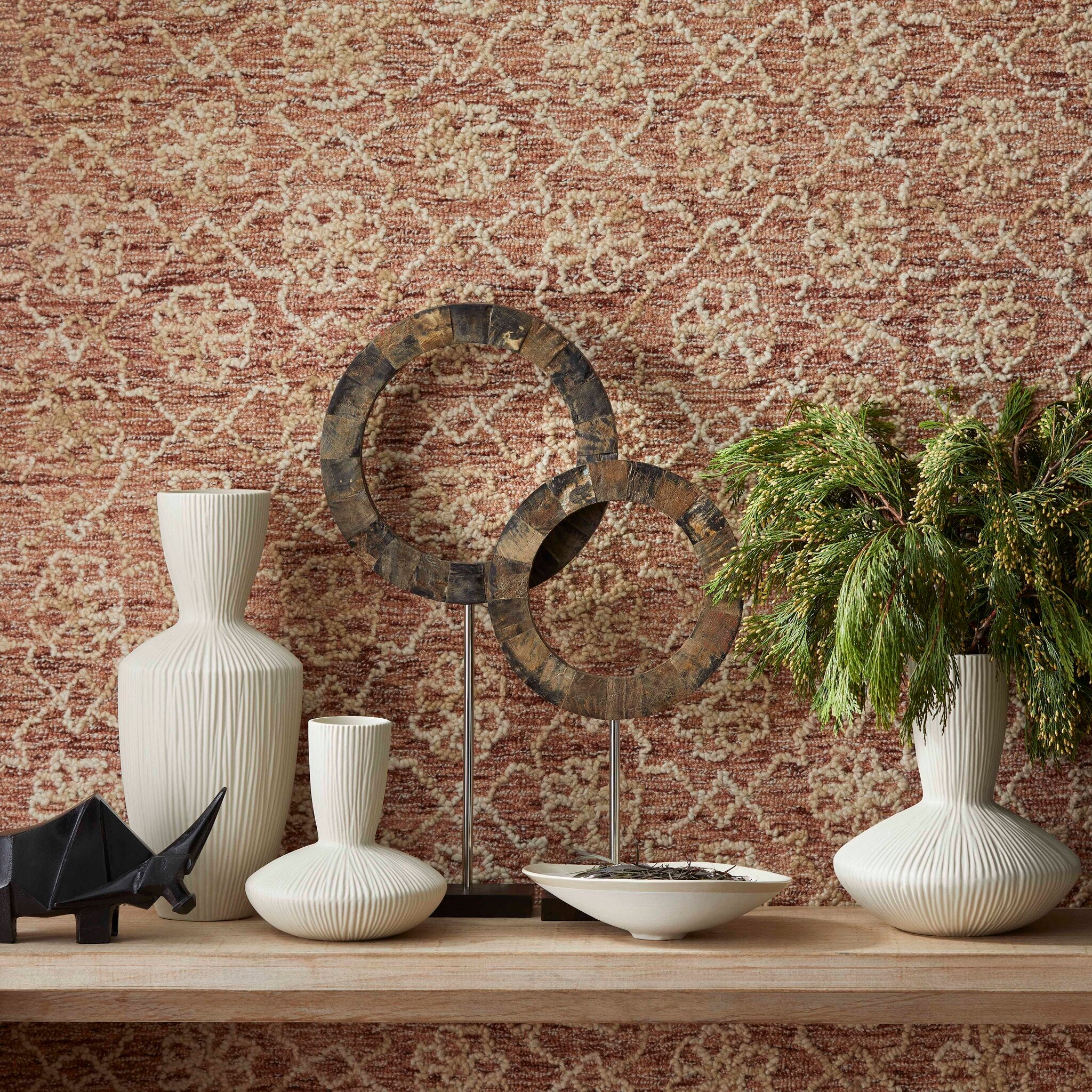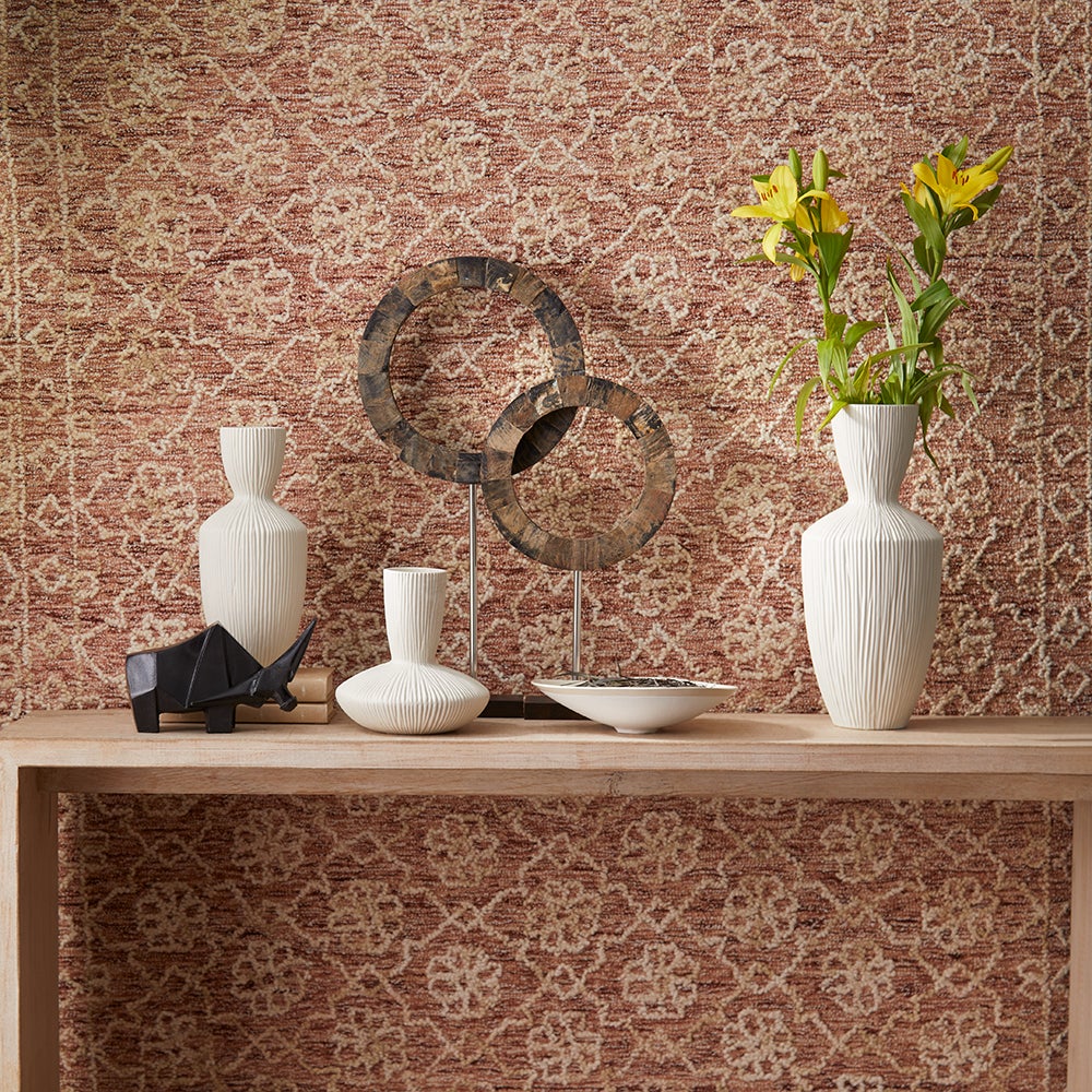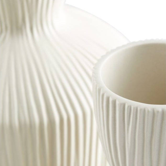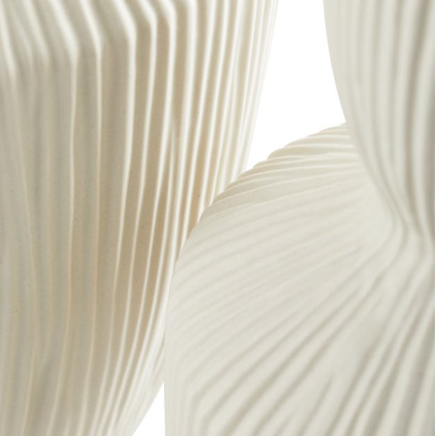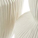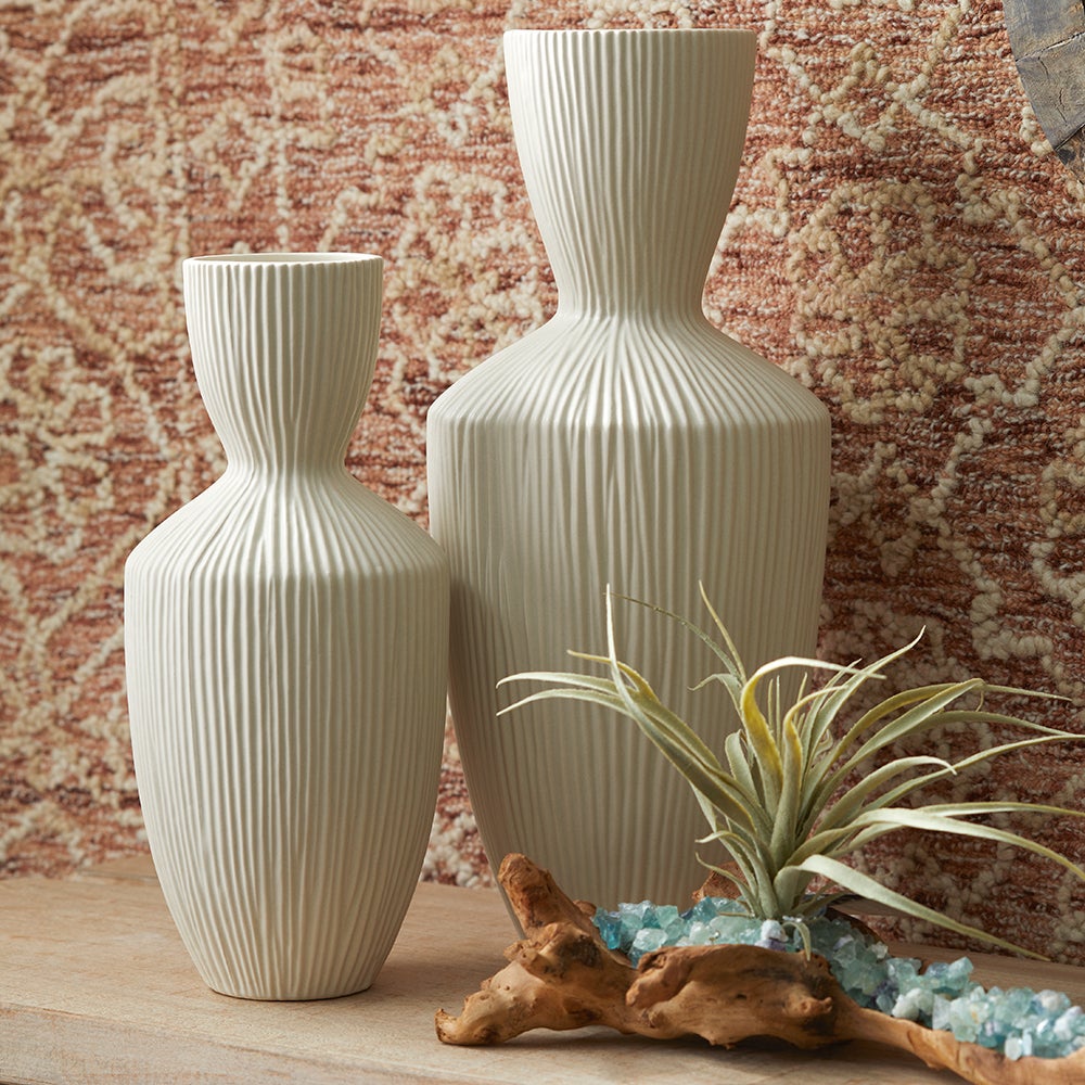 This vase possesses a massive rigged body with a funnel-shaped neck. The curvaceous form is strikingly contrasted by the linear ridges which extend from the base to the neck. Accessorize with this modest, neutral, texturize vase. These are the perfect accessory for tabletops, bookshelves, and desks.
