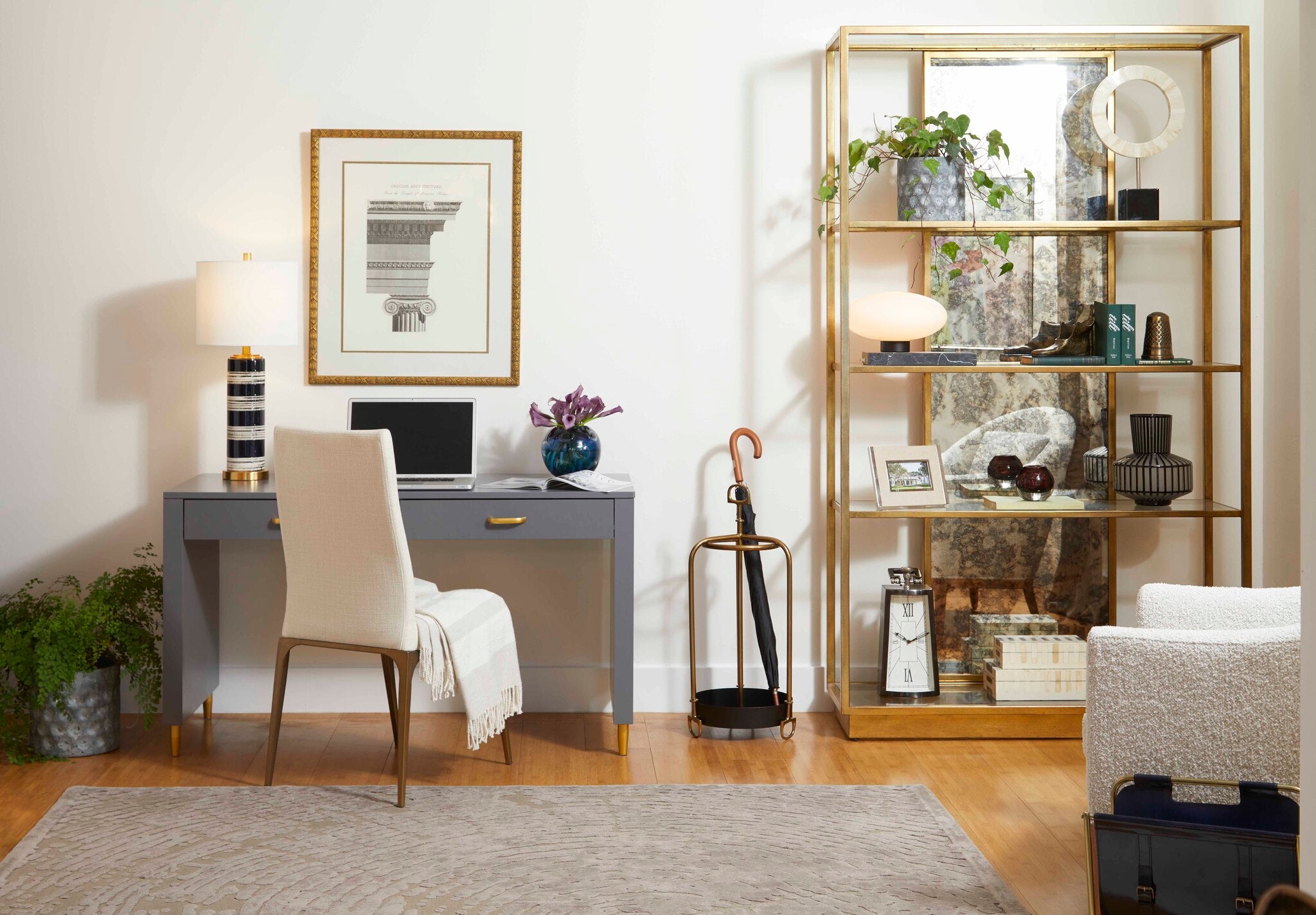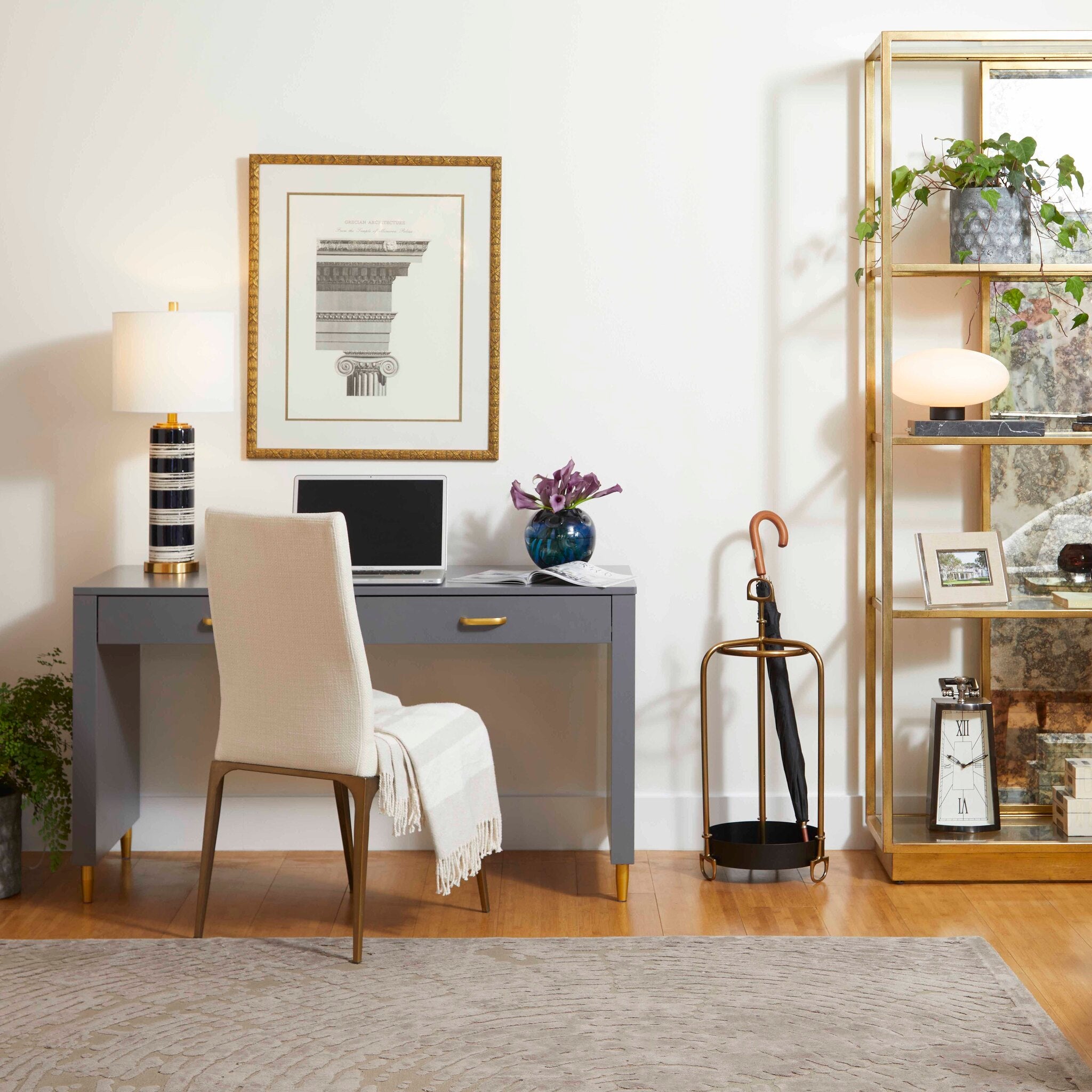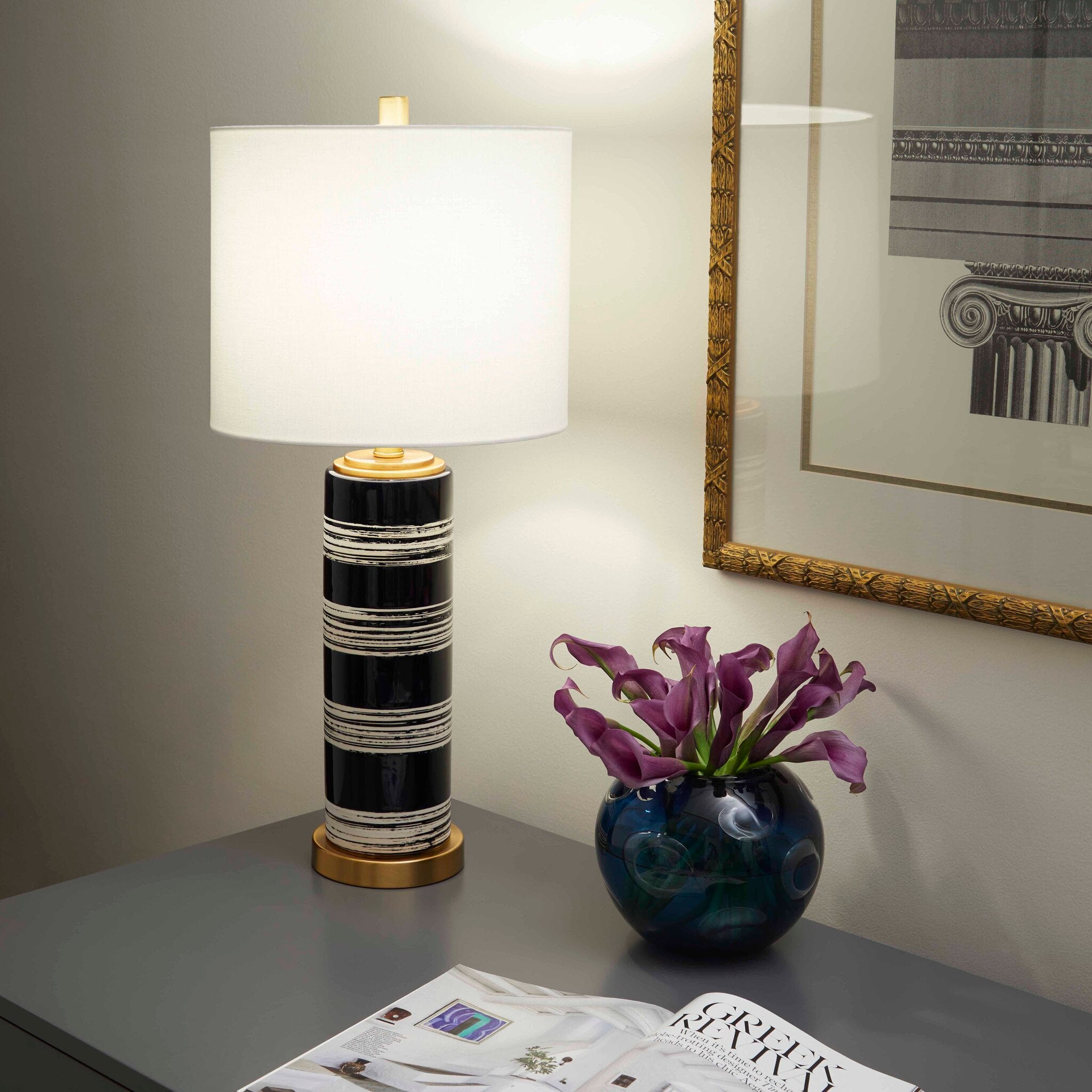 The standout composition of this table lamp is reminiscent of the 1920’s elegance. Highlighted by a striped, blue, and brush-stroked white finish on the ceramic frame, balanced on top of an elegant brass base, the Bristle Brush lamp is as complete a grand luminary as you will find. This lamp boasts a generous proportion in its white linen shade, with a single 100w medium base bulb to provide ample illumination from the dimmable light source. These combined make the Bristle Brush lamp a perfect choice for any upscale bedroom, transitional entryway, or mid-century modern living room ensemble.