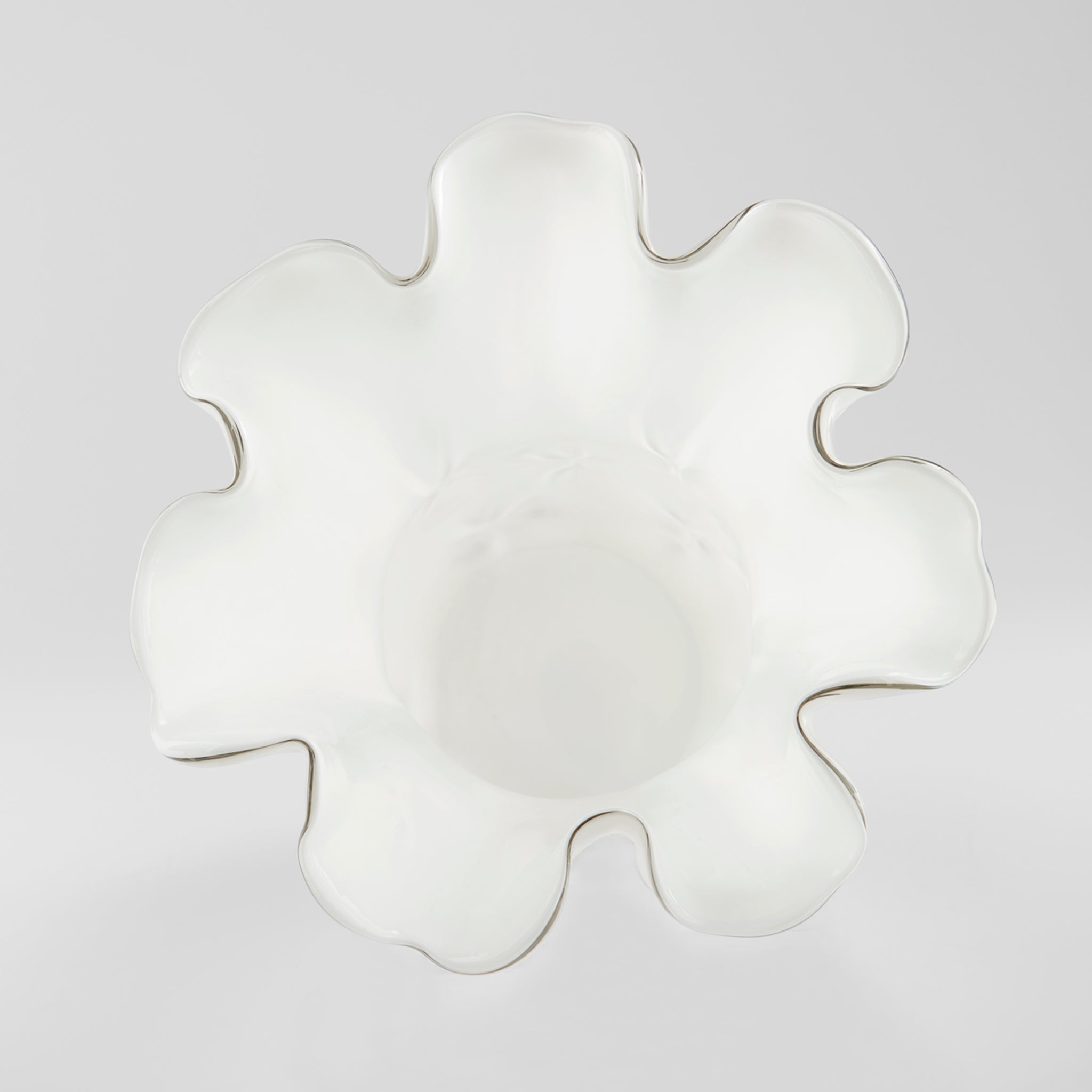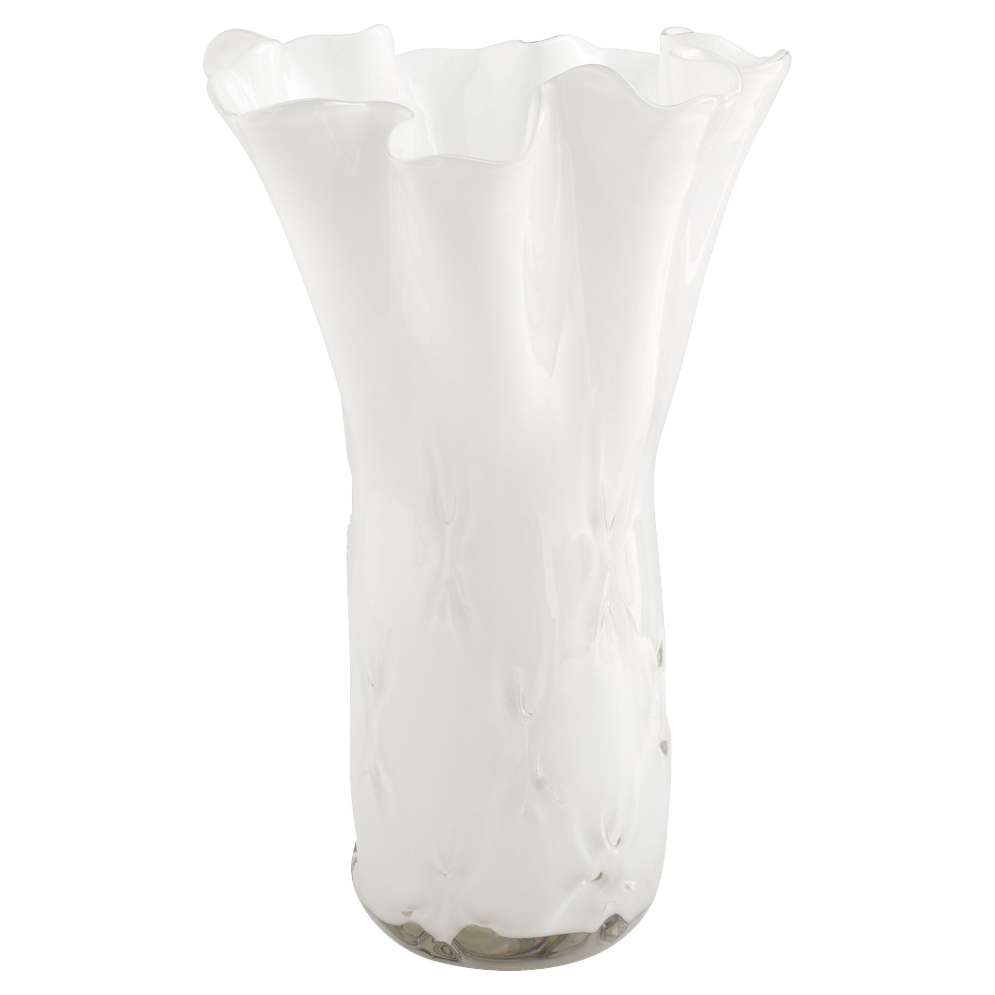 This layered, abstract art glass stands at an eye-catching height. Clear glass is blown atop an opaque white glass core, creating a stunning visual display of a smooth surface with protruding ribbons from top to bottom. Use as a centerpiece in a dining room or start a conversation by placing atop a living area coffee table. Water-tight.