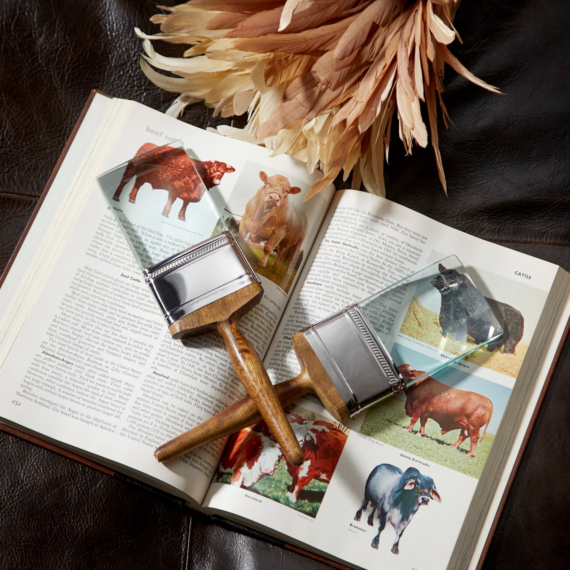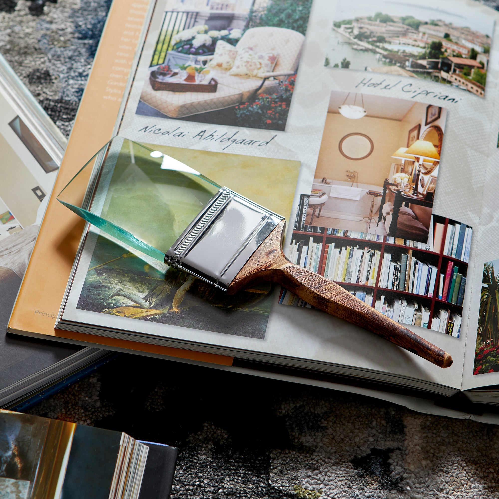 This novel sculpture is as amusing as its name. The stroke is minimal in aesthetic with a brown handle and a solid brush head, sans bristles. It has a solid glass piece that is slightly magnifying where the bristles would be.