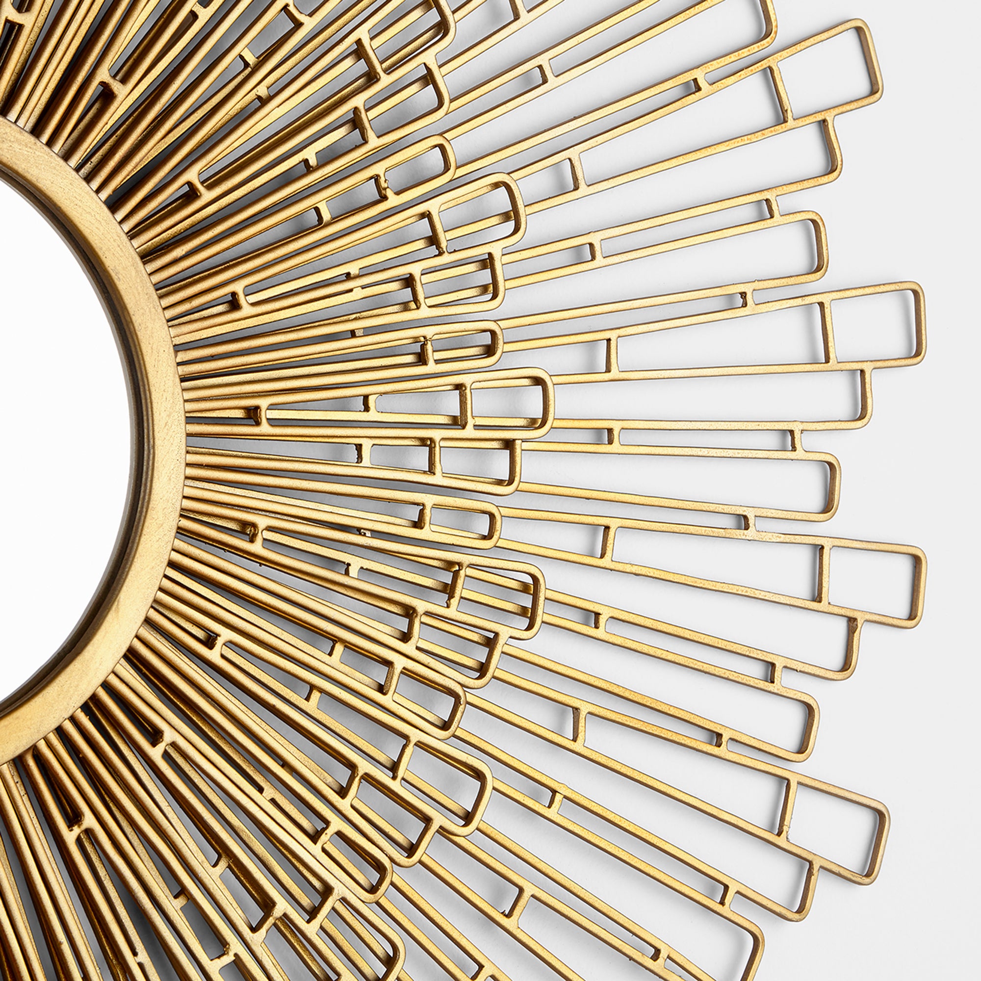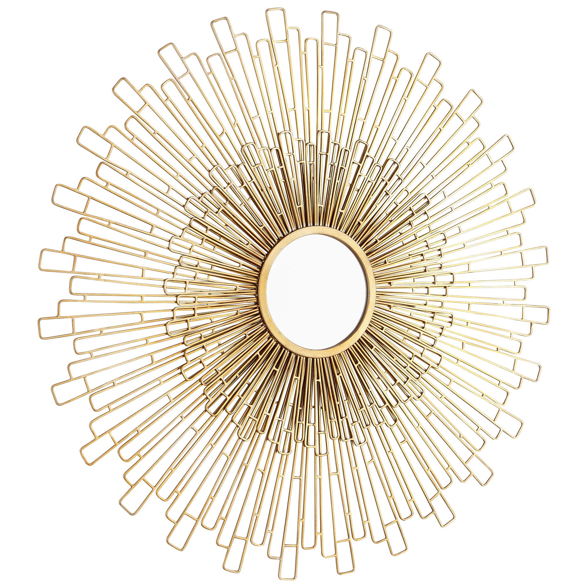 Enhance the appeal of your living room or bedroom with this mid-century modern inspired classic golden mirror. The silhouette is crafted from thin strips of iron, which form into a beautiful, collection of decorative tabs. A second, smaller layer of golden tabs adds an elevated touch to the Gatsby era elegance. Perfect for any living space with a nostalgic lean, but also suited for commercial or office spaces with a fun and whimsical ensemble.