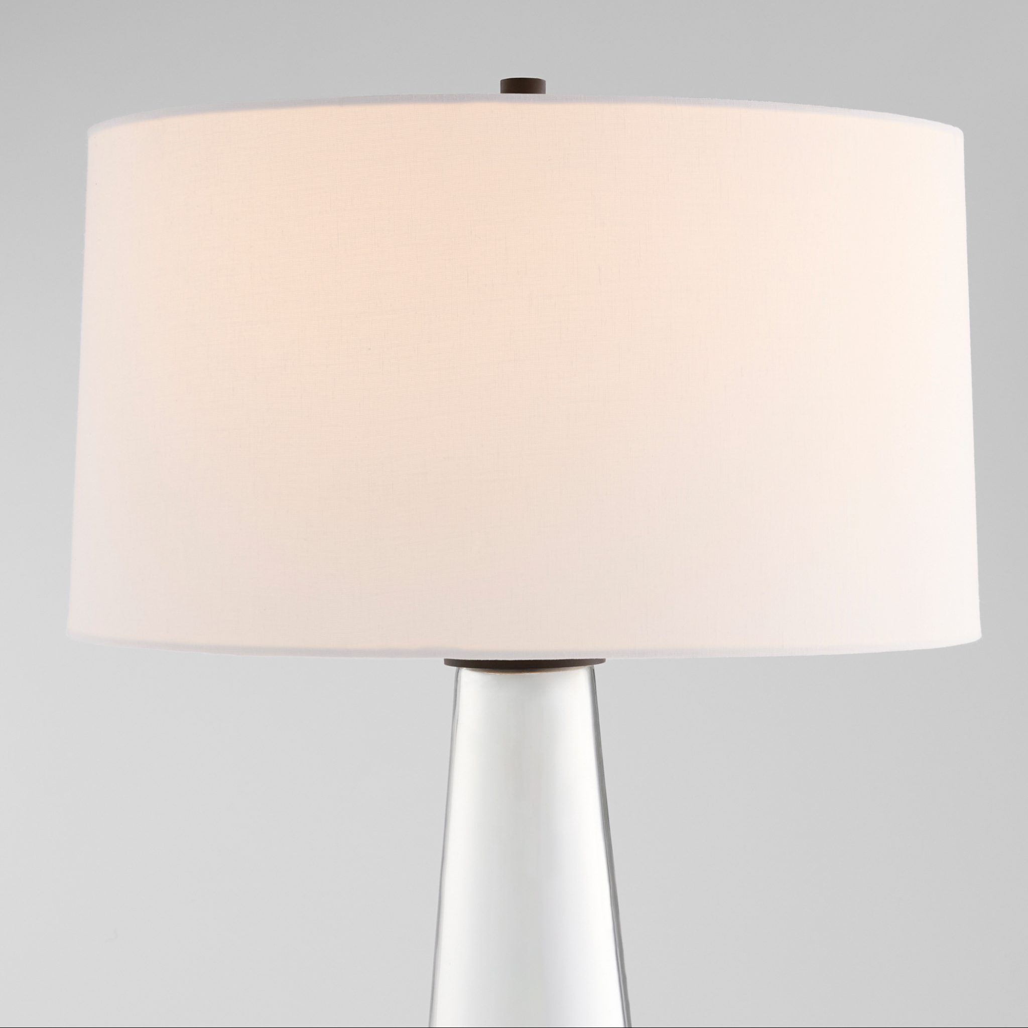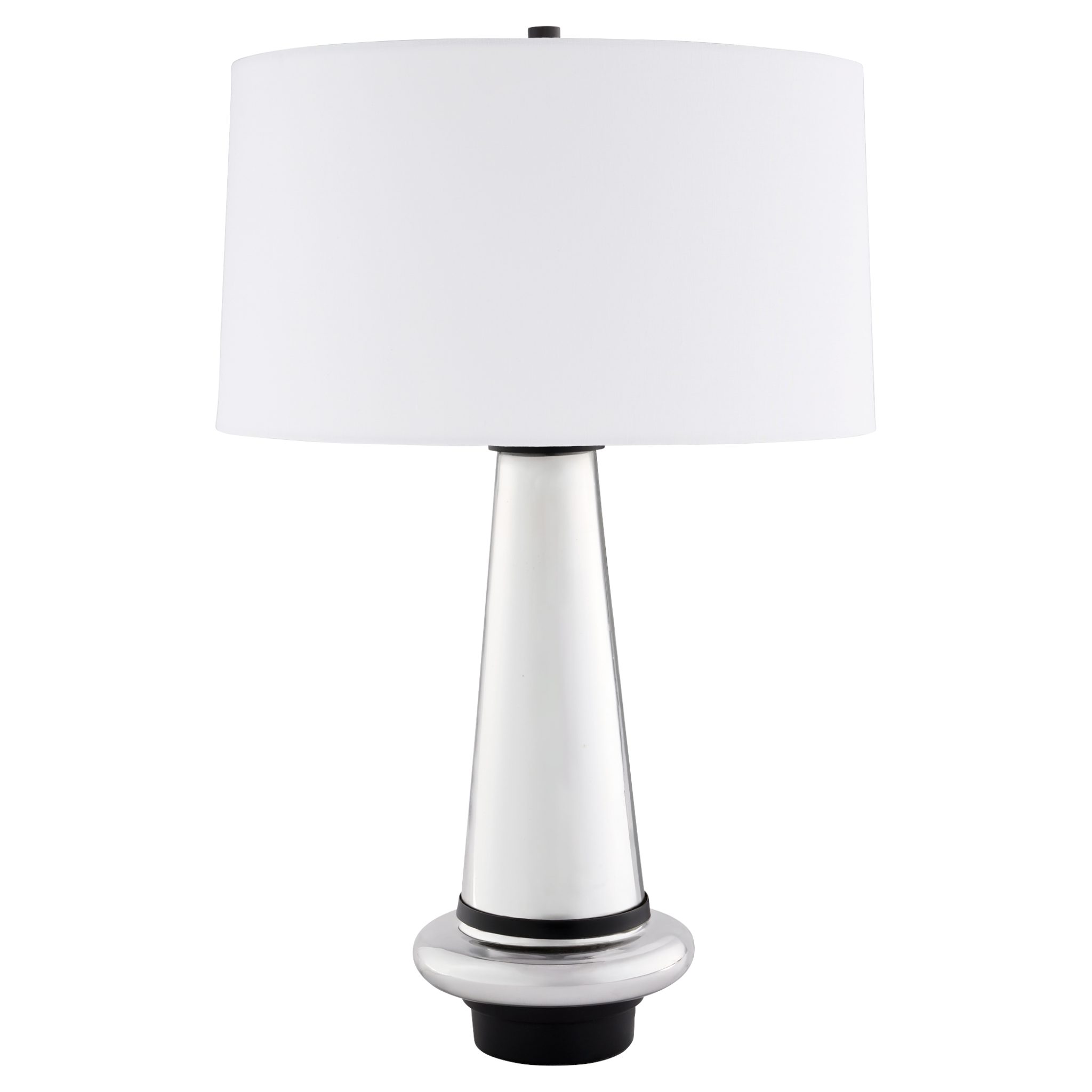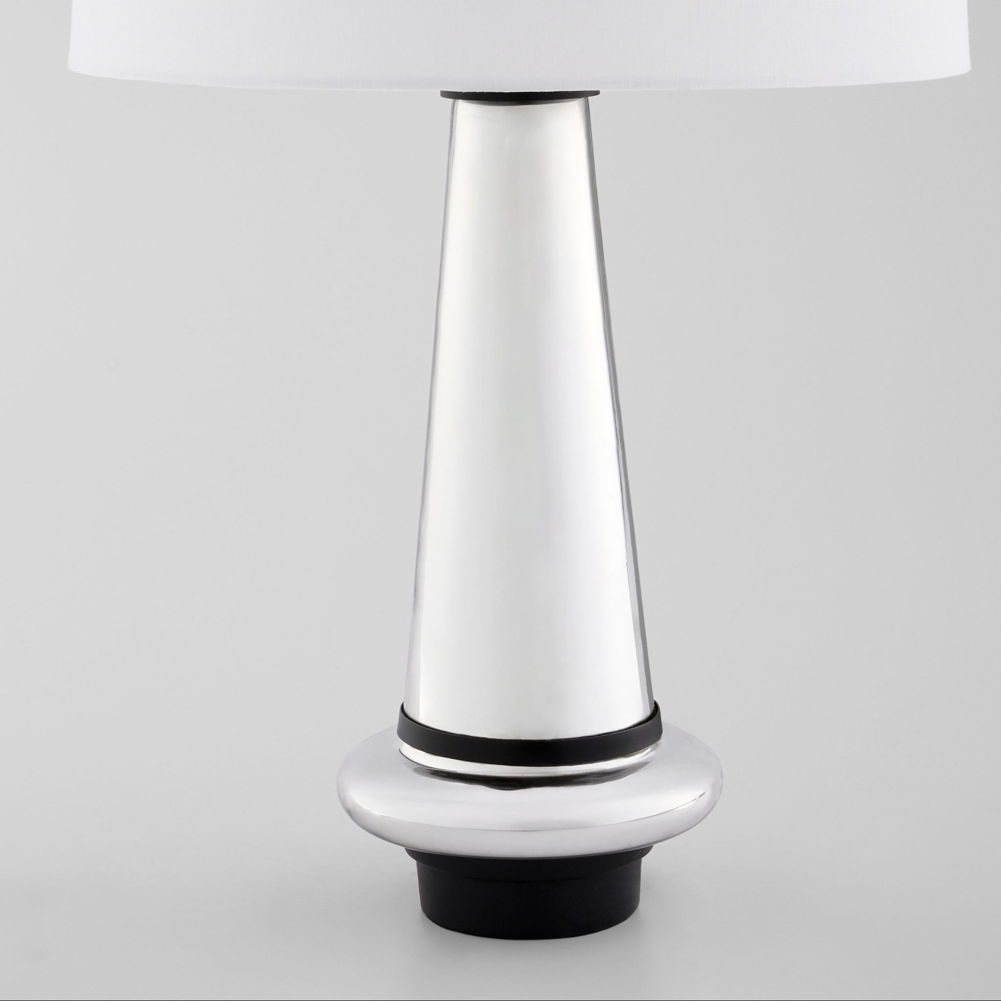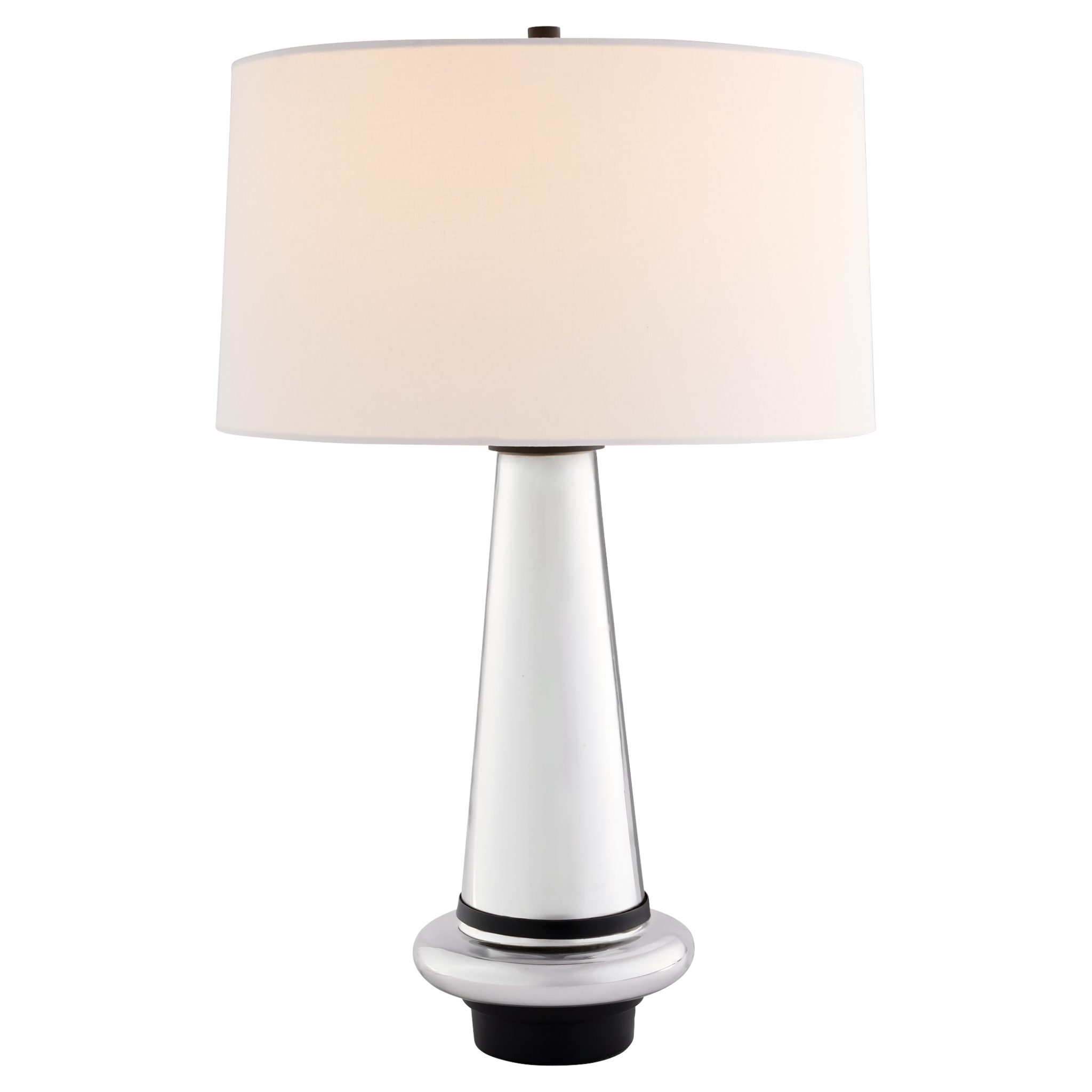 The Buckley Table Lamp’s mercury glass body catches the light, while the bronze base and accents provide a grounding contrast. Its clean silhouette enhances its contemporary charm.