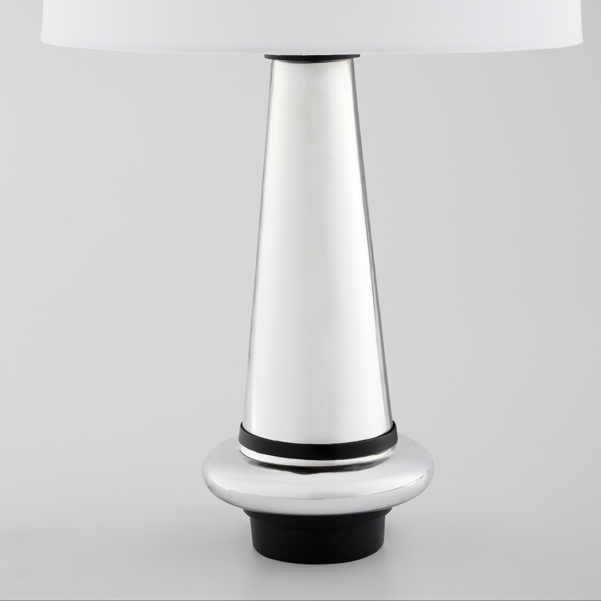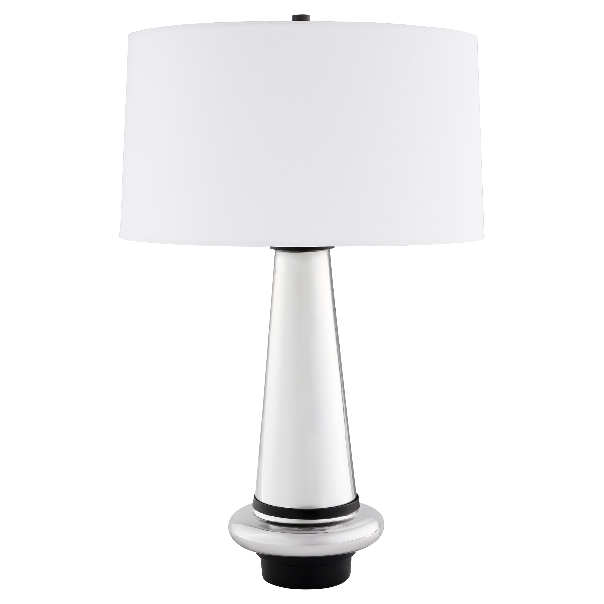 The Buckley Table Lamp’s mercury glass body catches the light, while the bronze base and accents provide a grounding contrast. Its clean silhouette enhances its contemporary charm.