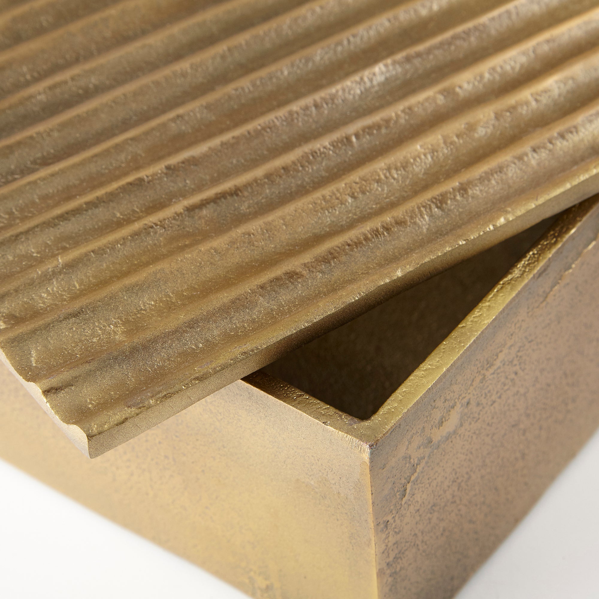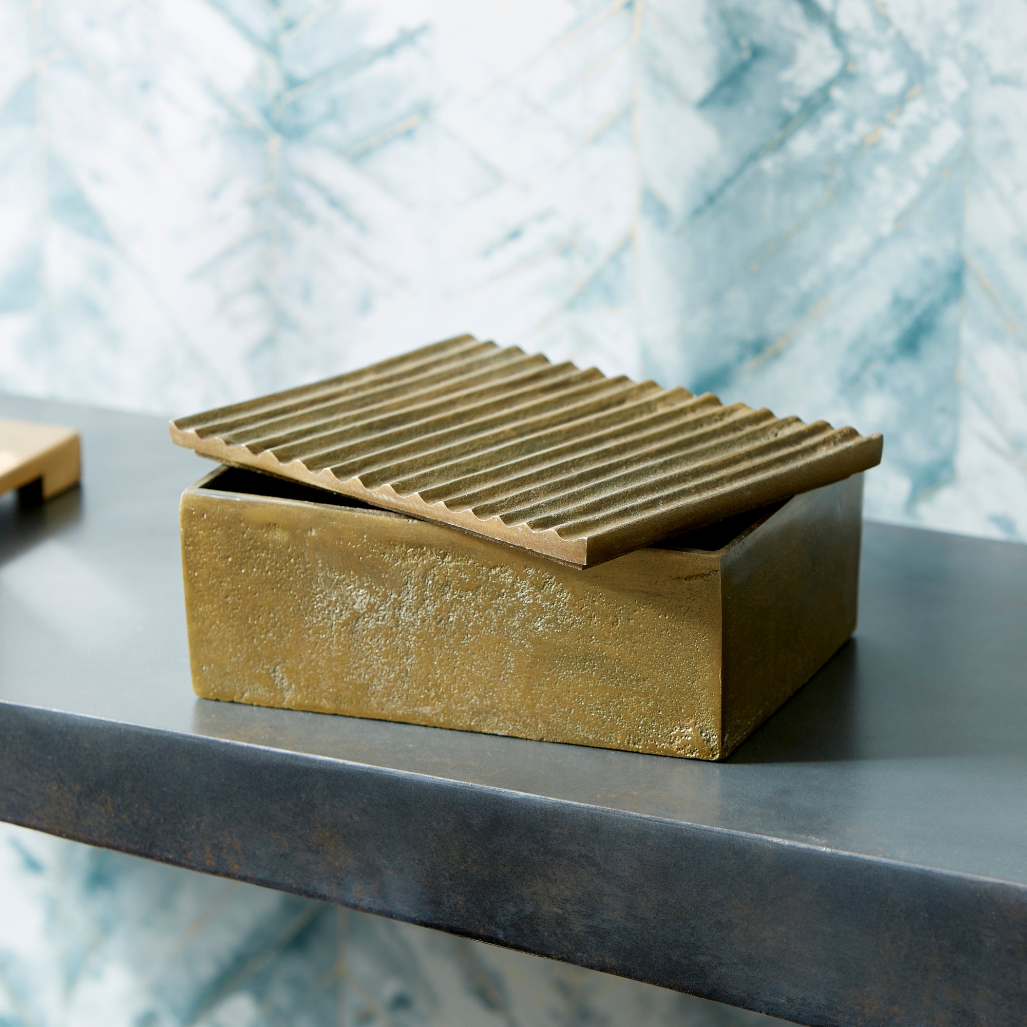 Introduce structural texture with an industrial twist on a small rectangular box. With an antique brass finish and lightweight construction, this box is the perfect touch to complete a modern look.