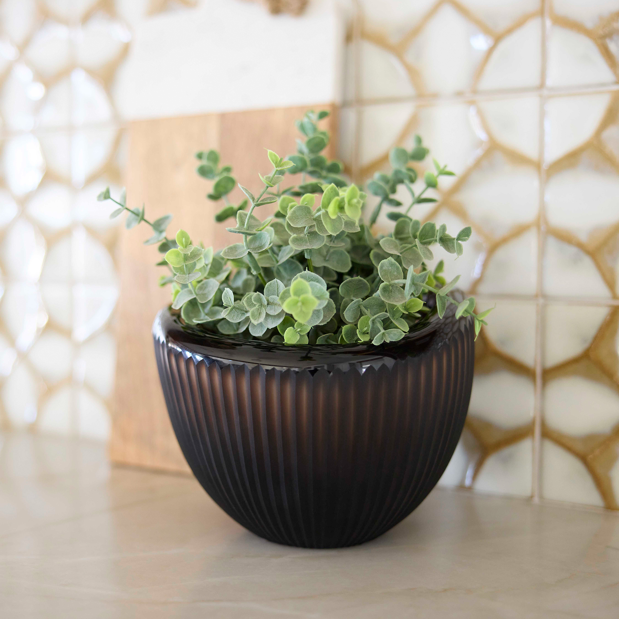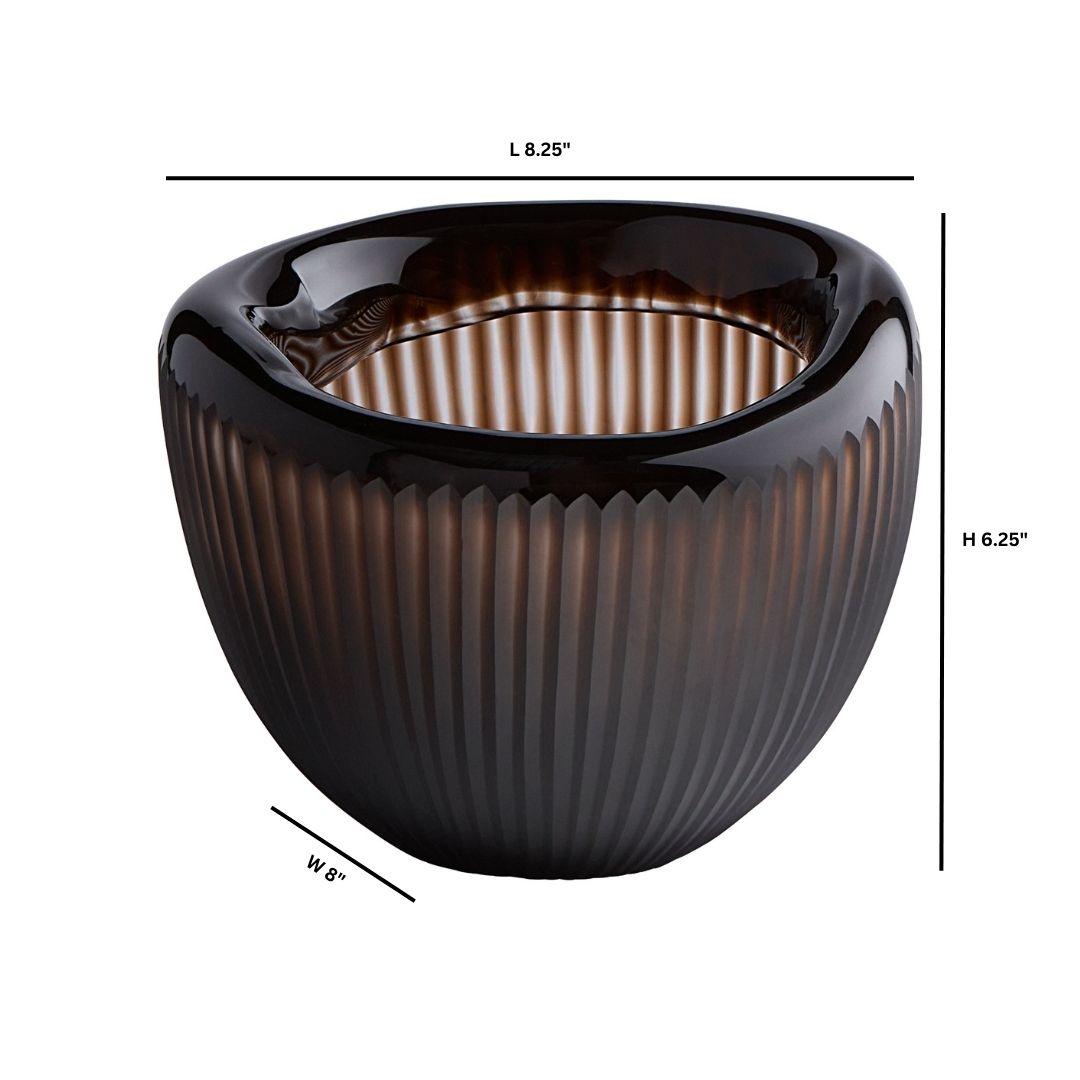 The Cacao collection is a symphony of elegance and craftsmanship inspired by the rich hues and textures of cocoa beans. Crafted from hand-blown cased glass, each piece bears a distinctive folded rim achieved through meticulous reheating and careful maneuvering by skilled artisans. After each piece is annealed and stable, vertical grooves that follow the curvature of the rim are ground by hand and showcase a variation in density. The thick glass body allows artists to carve deeply, resulting in a ribbed texture that adds depth, dimension, and authenticity to the design. Available in three sizes.