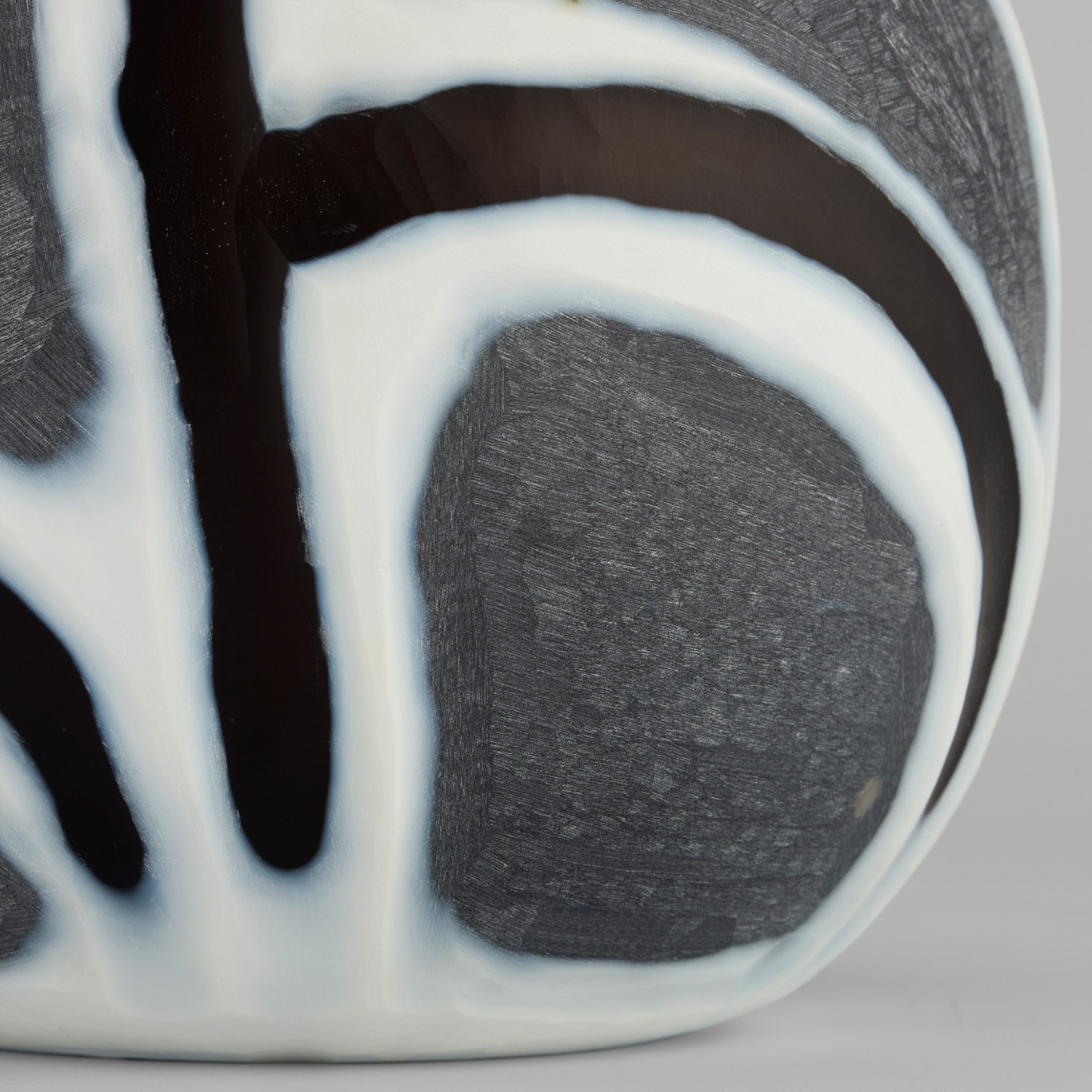 The Calle Vases feature a distinctive tribal-inspired design, crafted from three layers of cased glass in black, white, and gray. Sandblasting and etching techniques add depth, texture, and color variations, making each piece a striking blend of artistry and craftsmanship. Offered in various sizes, these vases make an eye-catching arrangement when paired.