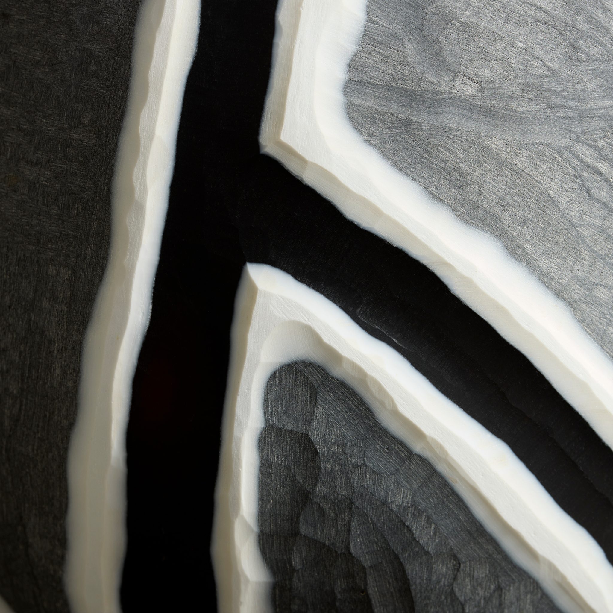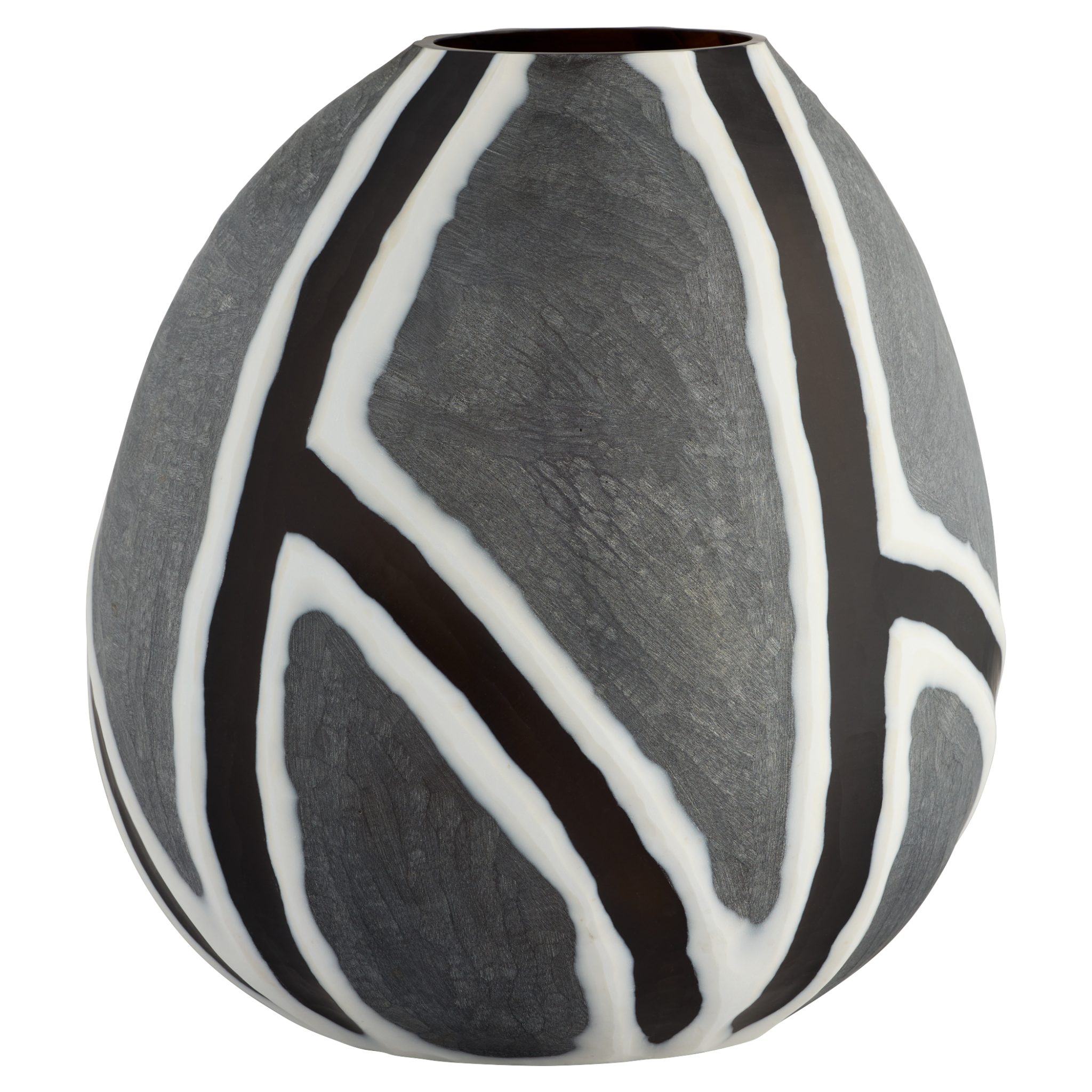 The Calle Vases feature a distinctive tribal-inspired design, crafted from three layers of cased glass in black, white, and gray. Sandblasting and etching techniques add depth, texture, and color variations, making each piece a striking blend of artistry and craftsmanship. Offered in various sizes, these vases make an eye-catching arrangement when paired.