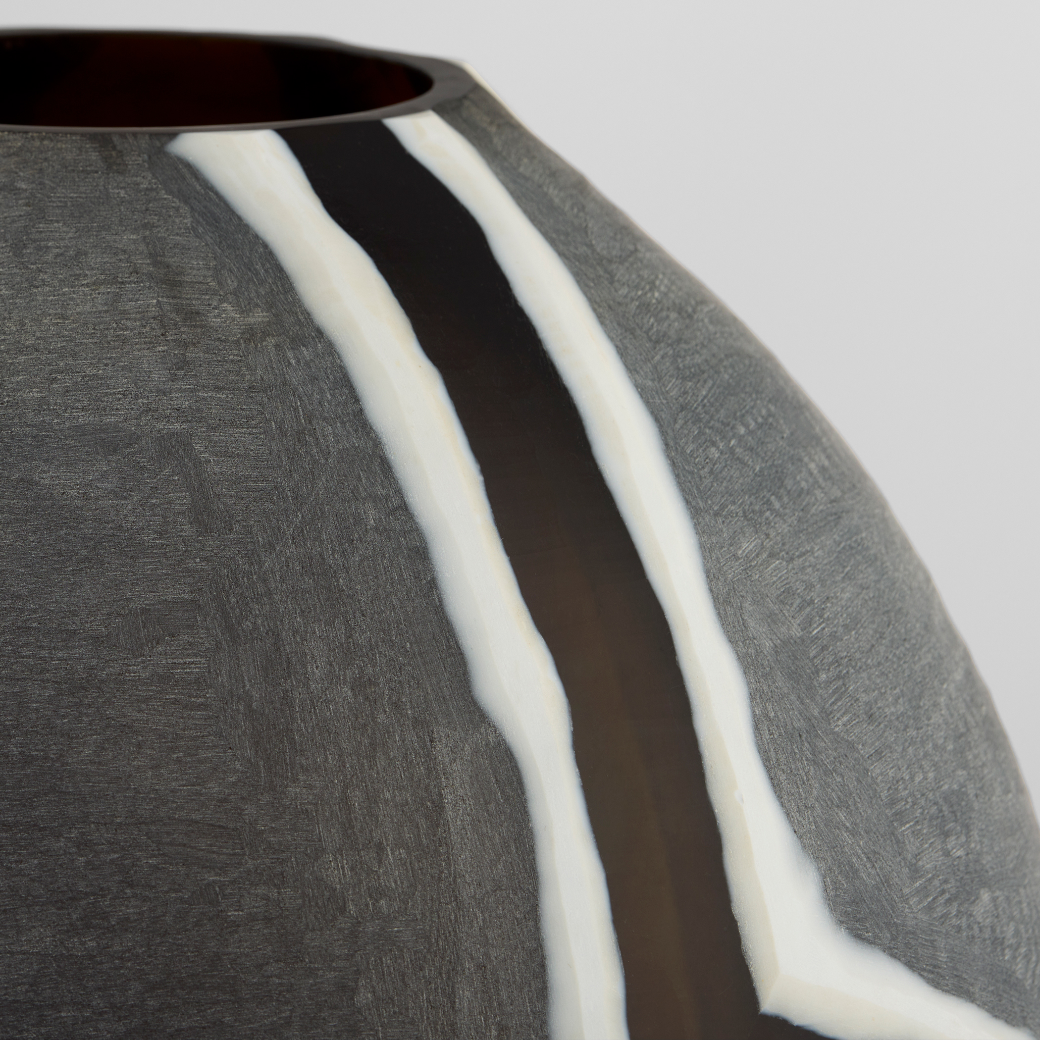 The Calle Vases feature a distinctive tribal-inspired design, crafted from three layers of cased glass in black, white, and gray. Sandblasting and etching techniques add depth, texture, and color variations, making each piece a striking blend of artistry and craftsmanship. Offered in various sizes, these vases make an eye-catching arrangement when paired.