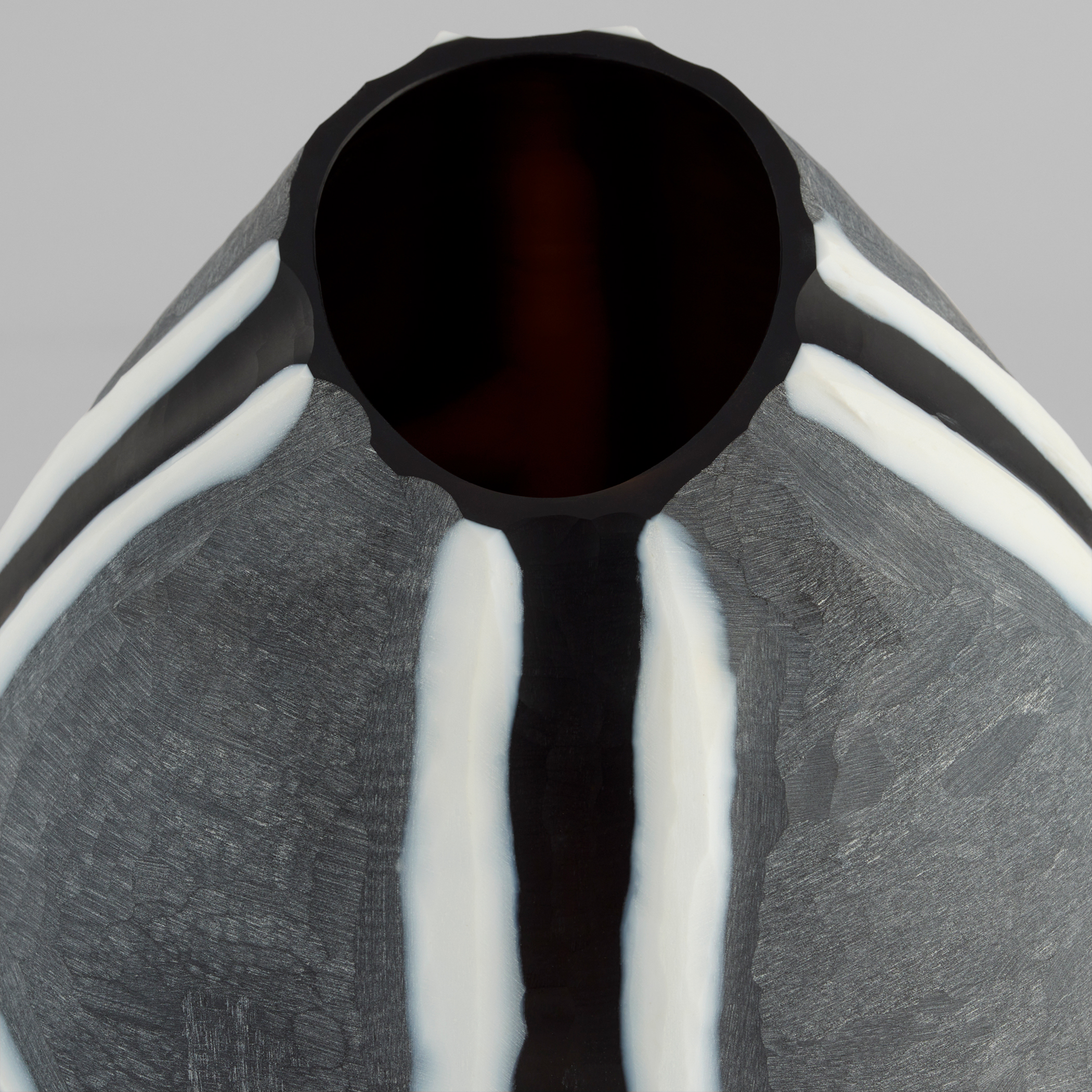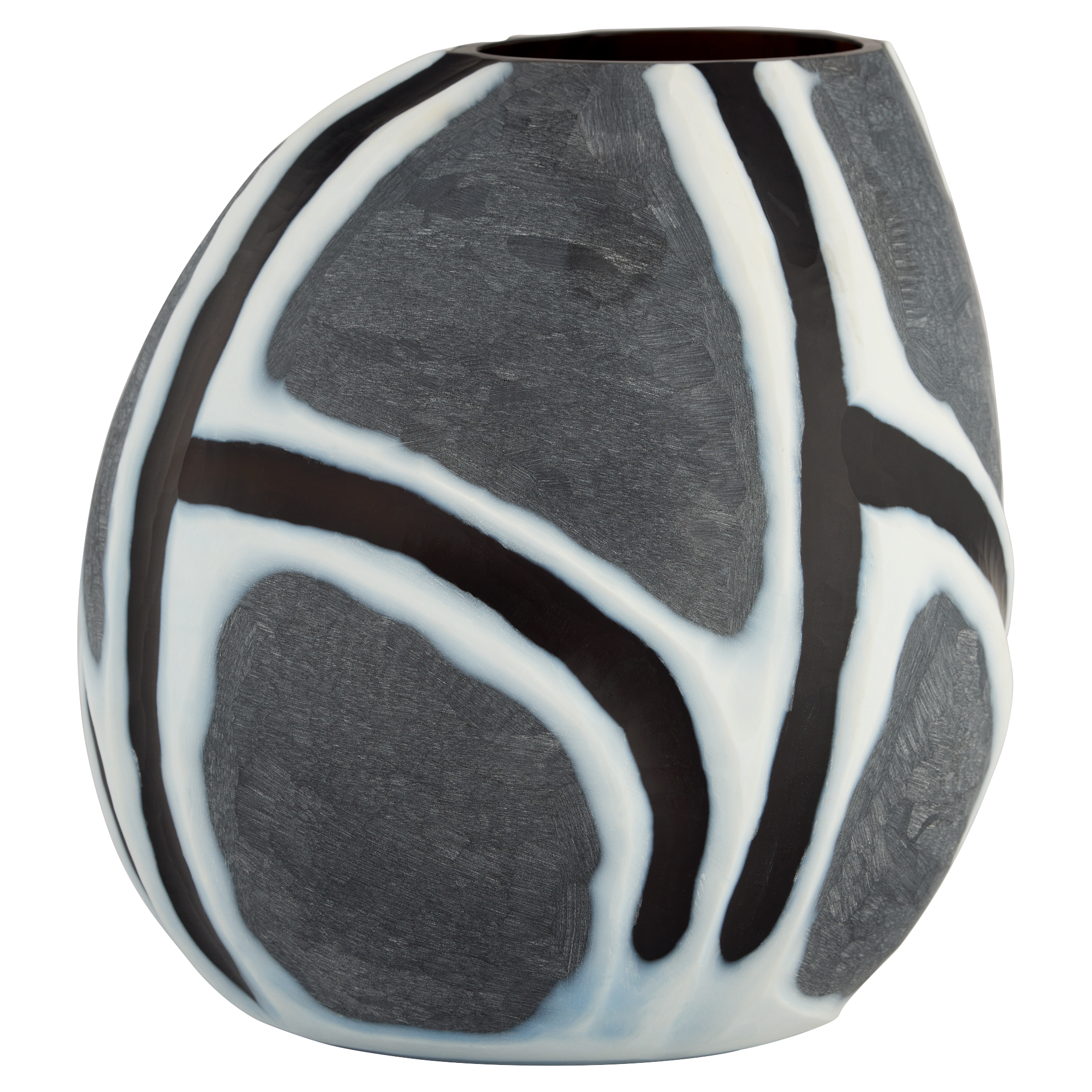 The Calle Vases feature a distinctive tribal-inspired design, crafted from three layers of cased glass in black, white, and gray. Sandblasting and etching techniques add depth, texture, and color variations, making each piece a striking blend of artistry and craftsmanship. Offered in various sizes, these vases make an eye-catching arrangement when paired.