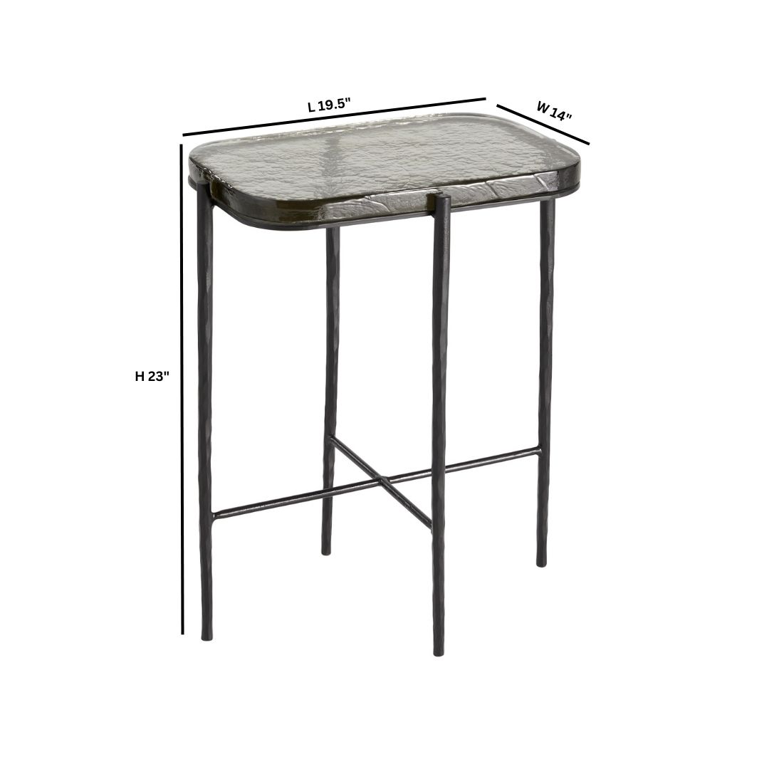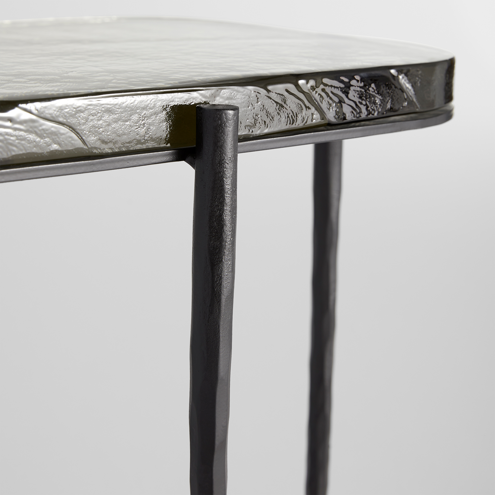 Topping the Canova accent table is a thick cast glass surface with a smooth texture and substantial weight. The glass top is supported by hand-forged, hammered iron legs that taper as they meet the floor. Finished in sleek black, the dimpled frame boldly contrasts the luminous glass top, elevating the table’s visual appeal. Versatile and stylish, the Canova accent table seamlessly complements a variety of interior styles, from contemporary to industrial chic. Whether used as a side table in the living room or a statement piece in the foyer, the Canova table adds poise to any interior design.