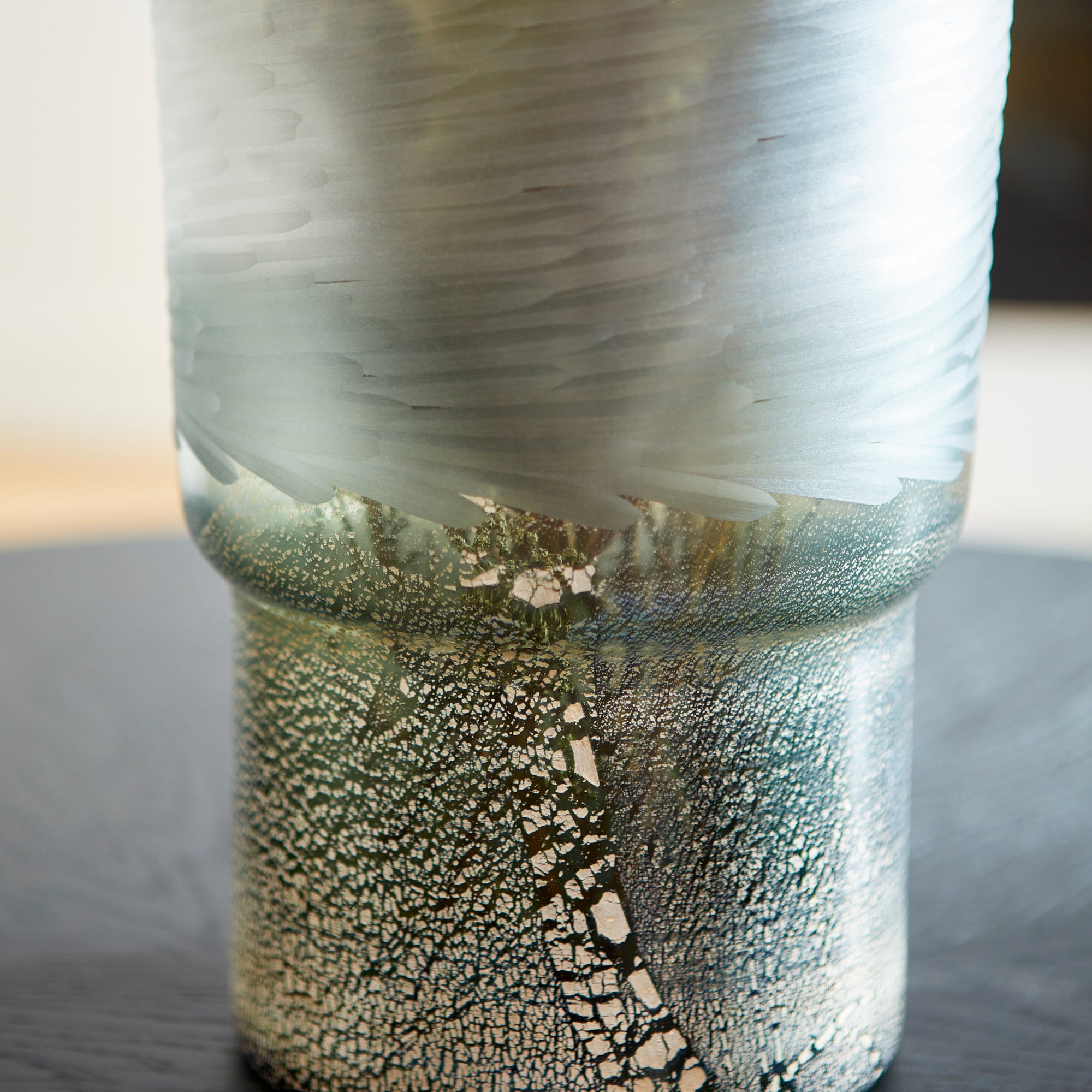Variance in texture, tone, and size are what make the Canyonland vase standout from the rest. This reverse tulip-silhouette sports a gradient clear to gilded silver surface finish. Transitional versatility offers this vessel a place in any contemporary setting. Adorn your living room, entryway, or commercial lobby display with multiple Canyonland vases (available in three sizes) and top with a floral bouquet for an added natural touch.