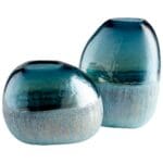 A two-toned texture surface, on an oblong silhouette, comprises the form behind this glassware accent. Add an abstract touch to your tabletop ensemble with the Cape Caspian vase. Available in two size options, these subdued accents are coated in a smooth top texture and cross-hatched lower surface in an iridescent blue finish. These contemporary vessels are ideal for your seasonal floral arrangements. Perfect for any style design: modern, traditional, or transitional, these glassware pieces will fit your needs.