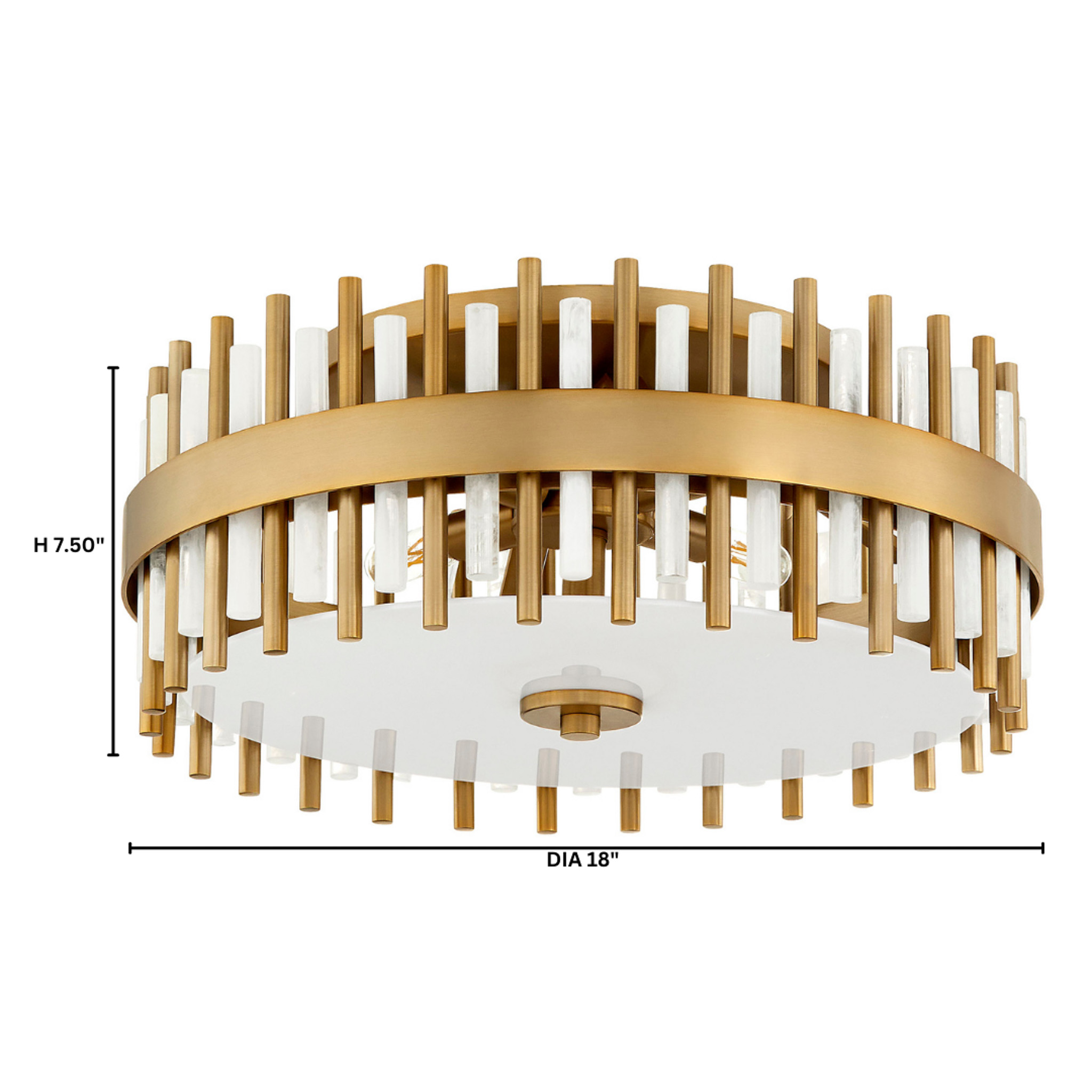 Alternating rods of steel and alabaster-style resin encircle candelabra sockets in the Cassio series of mid-century, empire styled lighting. A frosted glass diffuser expertly distributes light for a soft, warm glow. Aged brass finished steel paired with whisps of white in the resin rods creates a timeless facade that boosts any interior design project. Available in pendant or flush mount options.