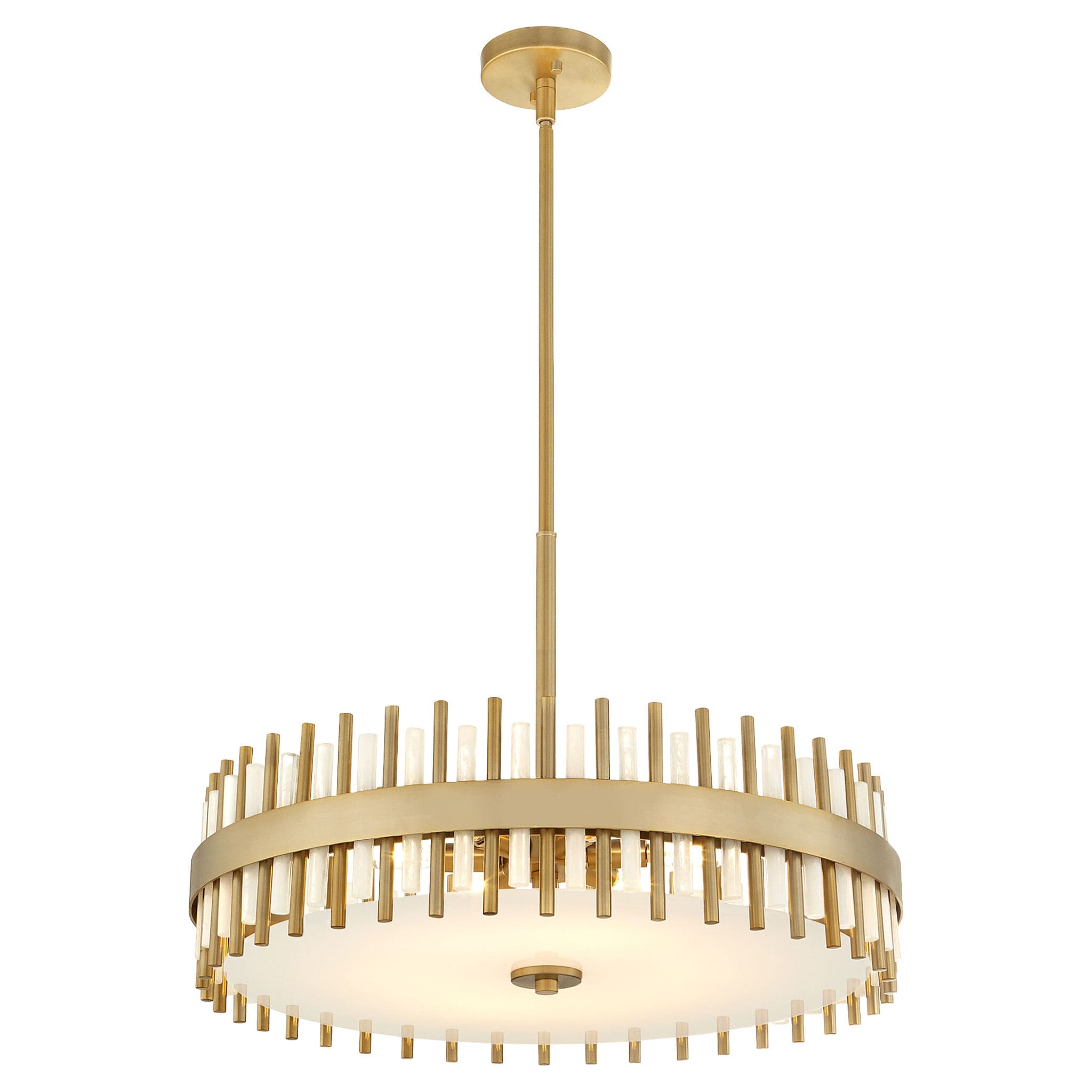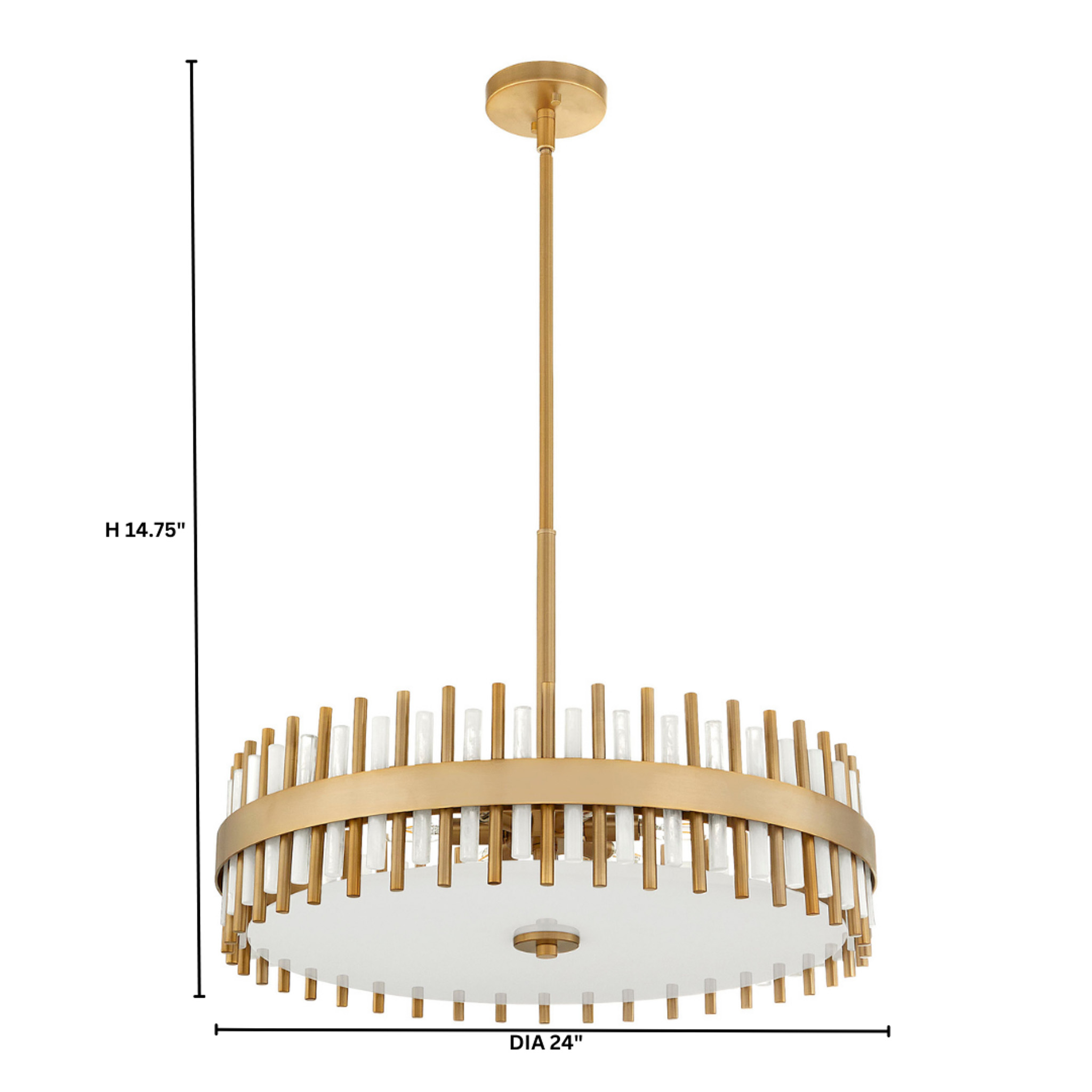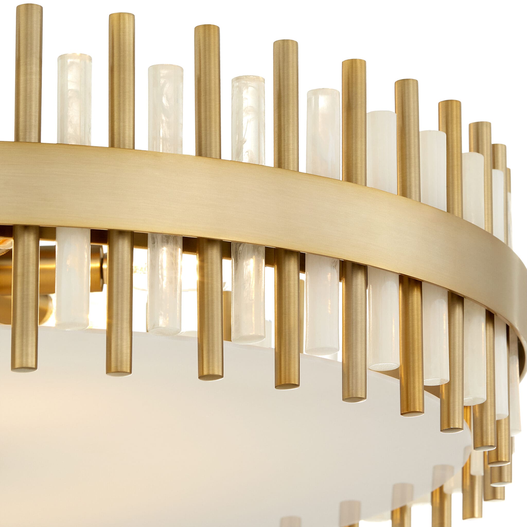 Alternating rods of steel and alabaster-style resin encircle candelabra sockets in the Cassio series of mid-century, empire styled lighting. A frosted glass diffuser expertly distributes light for a soft, warm glow. Aged brass finished steel paired with whisps of white in the resin rods creates a timeless facade that boosts any interior design project. Available in pendant or flush mount options.
