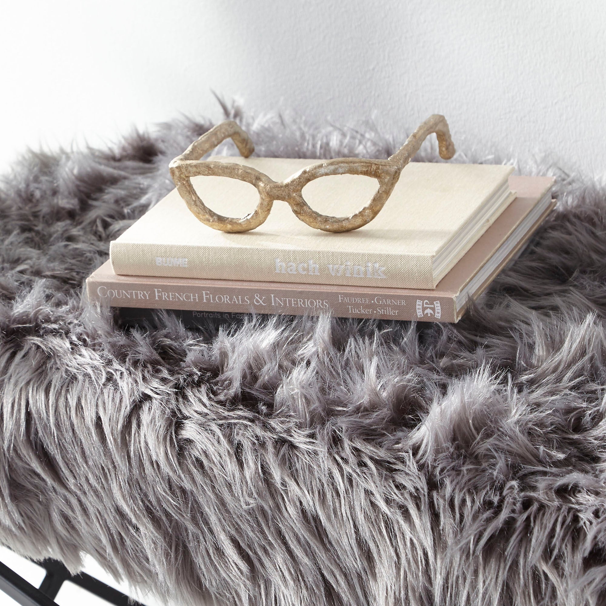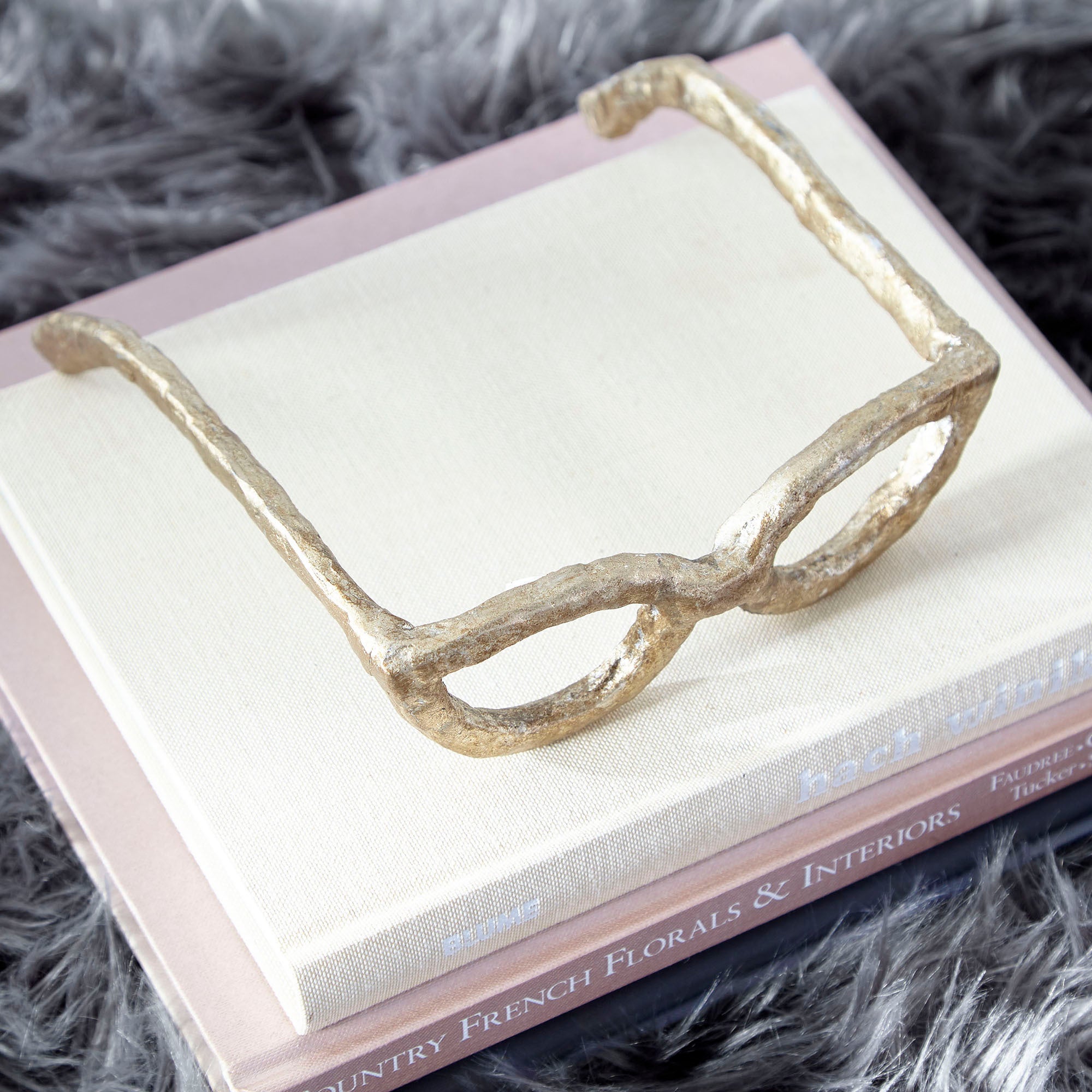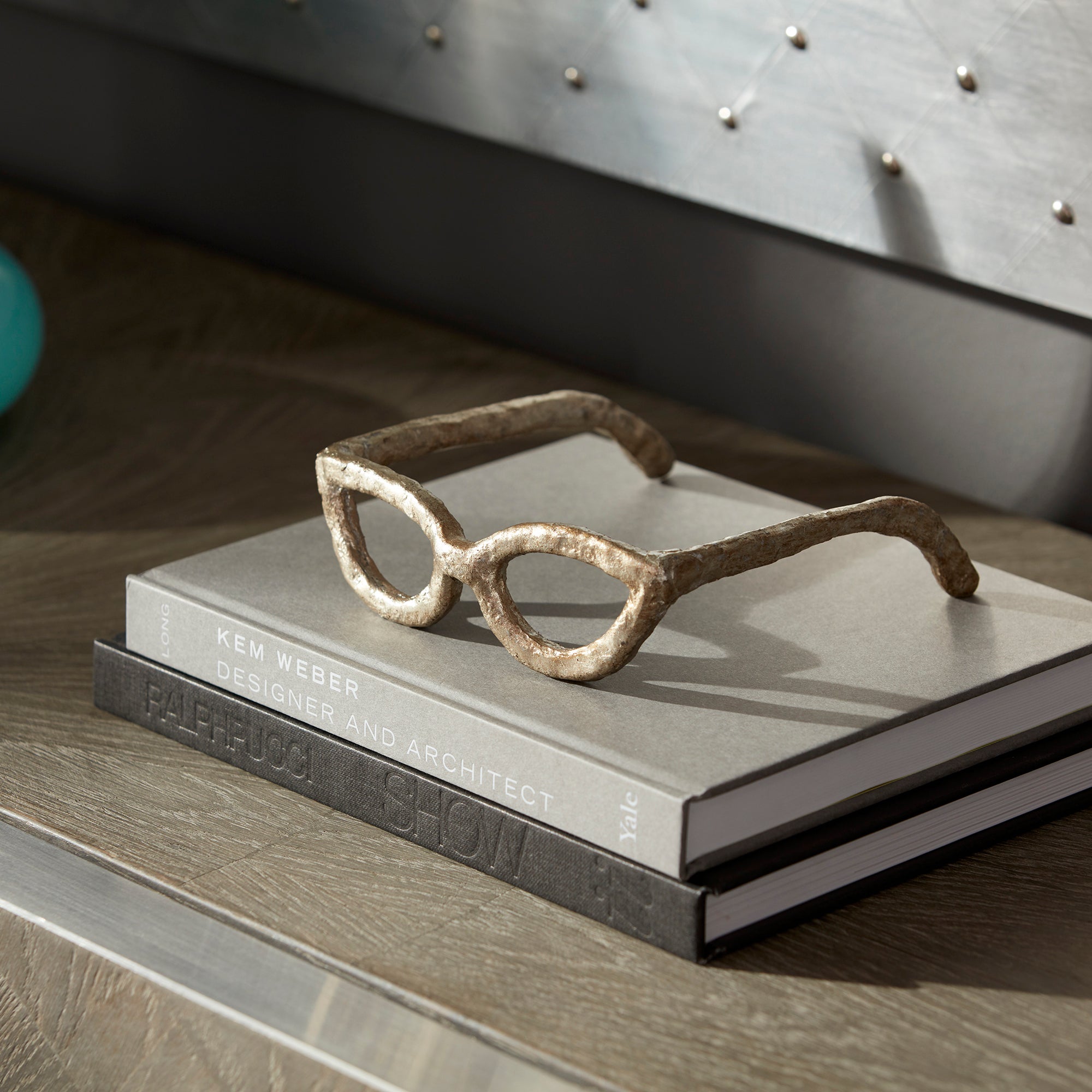 A pair of glasses crafted in a metal sculpture add character and charm to a bookcase or desktop. In an antique silver finish over iron construction, the sculpture perfectly emulates a pair of reading glasses.