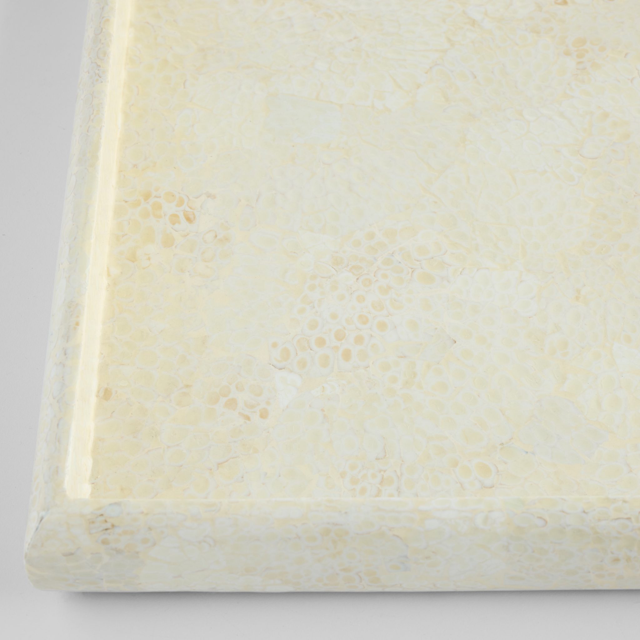 The Celestial Collection combines centuries-old traditional Vietnamese eggshell lacquer techniques with a contemporary twist. Each tray is finished in a variegated ivory eggshell lacquer featuring soft, rounded edges and a feminine, sophisticated look. The collection comes in multiple sizes, offering versatility for various uses, from serving as elegant ottoman toppers to functional trays for jewelry and small items.