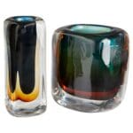 The Celosia art glass collection is crafted into a thick, rounded rectangular prism. The interior is saturated with exquisitely hand blown blue and golden glass that contrasts with the clear outer finish. The substantial pair are a wonderful way to display a brightly-hued bunch of your favorite flowers. Each sold separately. Available in two sizes.