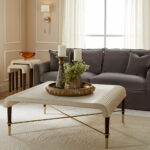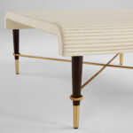 The Channel Cocktail Table features light beige pebbled leather with a quilted, horizontal pattern which waterfalls gracefully over the edge of the table. The table?s surface is made from four leather panels which are neatly topstitched into quadrants. Tapered walnut legs add warmth, while brass stretcher bars and sabots tie the design together. The perfect balance of texture and color makes this table a standout piece in any contemporary living room.